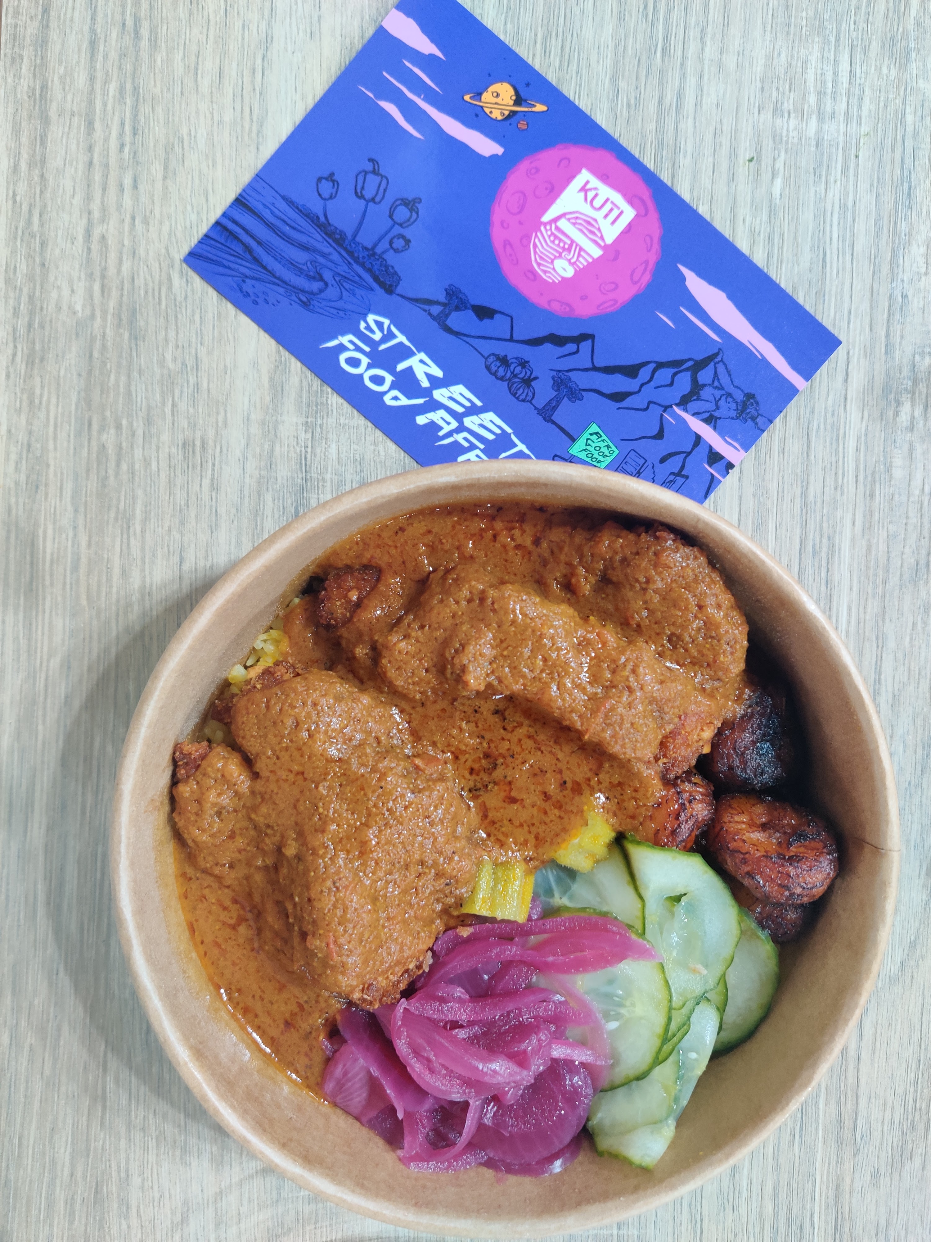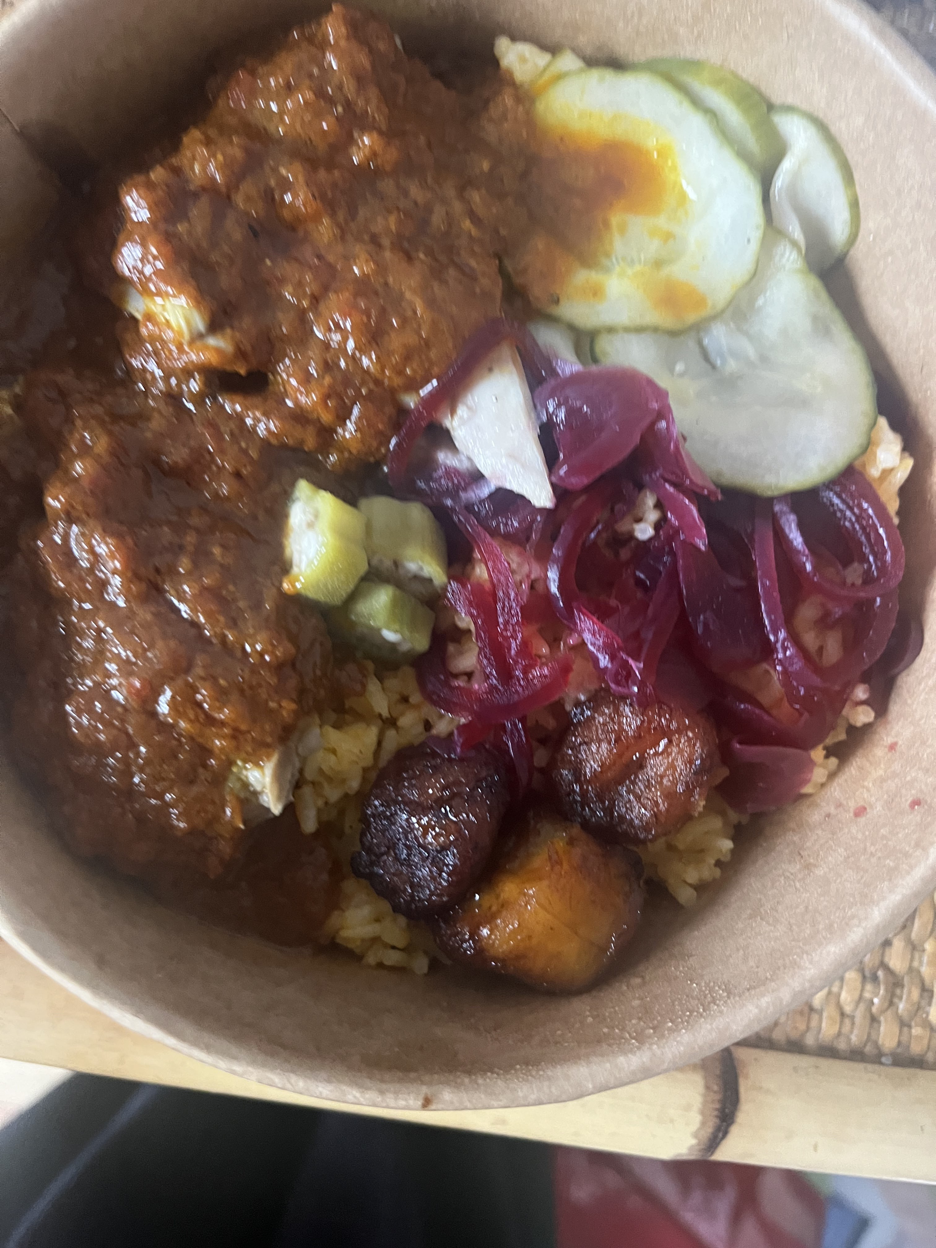J’ai commandé sur Uber Eats j’ai été un peu déçue. Certes la portion est copieuse , le poulet était pas mal la sauce arachide également. Les plantains étaient sèches et mon plat est arrivé froid (malgré le fait d’être à Montreuil) c’est très dommage j’ai le sentiment que tout avait été légèrement réchauffé par le restaurant mais que rien n’a été fait sur le moment. Le hic c’est que quand on réchauffe le riz avec les pickles il devient acide..