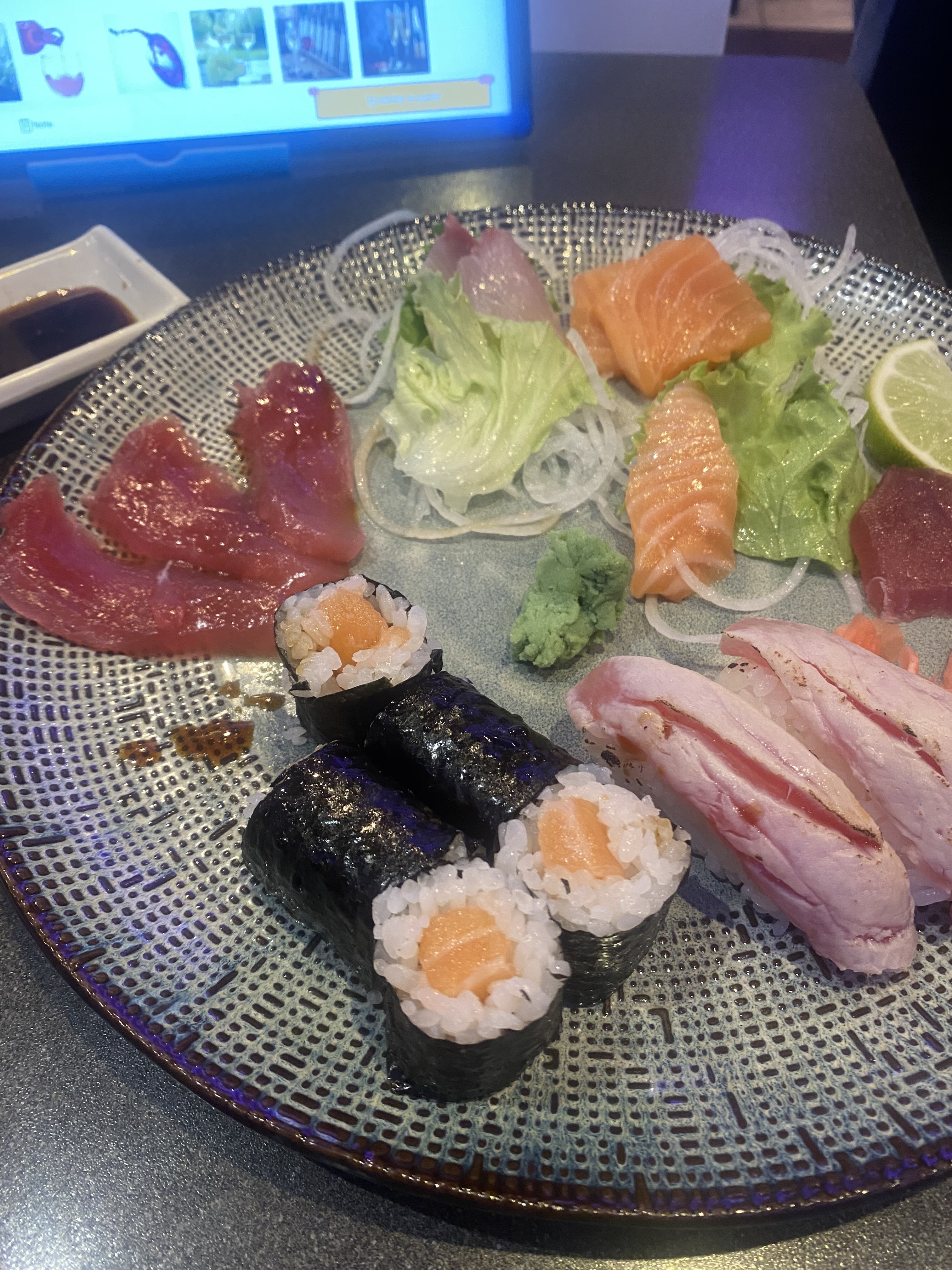 Ne venez pas ici pour le menu à volonté. Ils retardent volontairement les commandes pour vous ennuyer et partir. Il leur a fallu plus d'une heure pour trois commandes et l'endroit était à moitié vide. Mes deux dernières commandes ne sont jamais arrivées. Ils trichent aussi dans les assiettes. Ils ne livrent jamais la quantité commandée. Il ressort de la photo que j'ai commandé deux fois 5 assiettes par 6 morceaux de sashimi. Cela représente 30 pièces par commande. Au lieu de cela, j'ai reçu une commande aléatoire de 10 pièces, qu'ils m'ont apportée 40 minutes après ma commande. Cela ne vaut absolument pas son prix. Ne venez pas ici à moins que vous vouliez passer deux heures ou plus et être contrarié de ne pas recevoir ce que vous avez commandé.