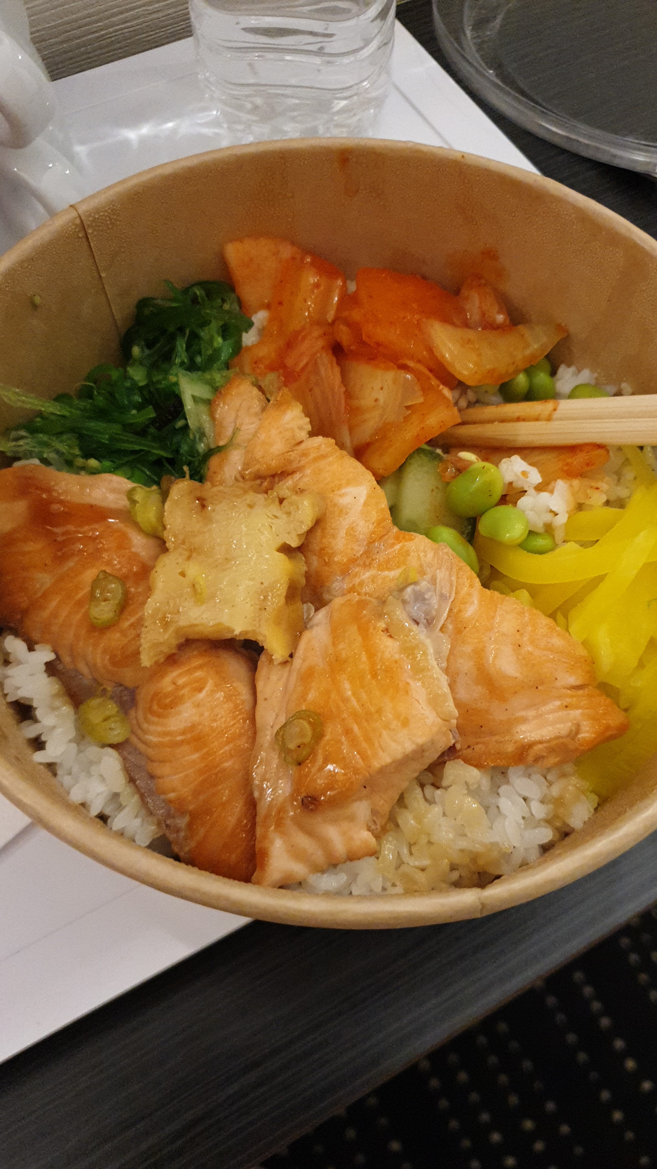 Délicieux, le saumon est ni trop cuit ni pas assez, excellent! Légumes frais, service rapide, serveuse discrète et efficace ! C'est la deuxième fois que je viens et je reviendrai ! La première fois c'était service à table (photo dans une assiette), la deuxième fois c'était à emporter (photo dans une boîte). Je recommande ! Marie H