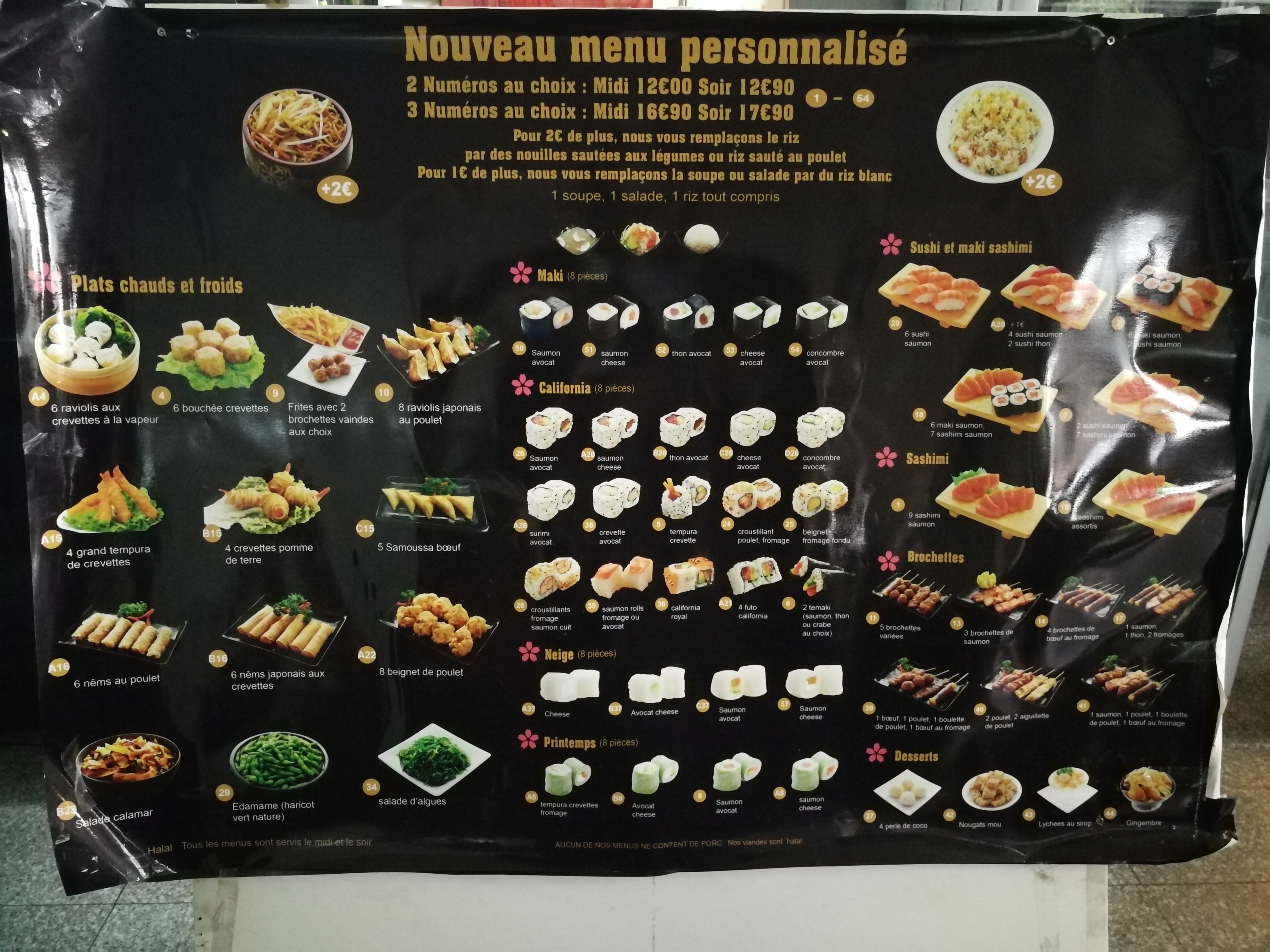 Formule 19€ pour 3 produits parfait est pas cher. Sushi et autres parfait. Peu point négatif les nouilles de légumes manque de goût ( supplément de 3€ pour changer à la place du riz ça ne les vaut pas déçu.)