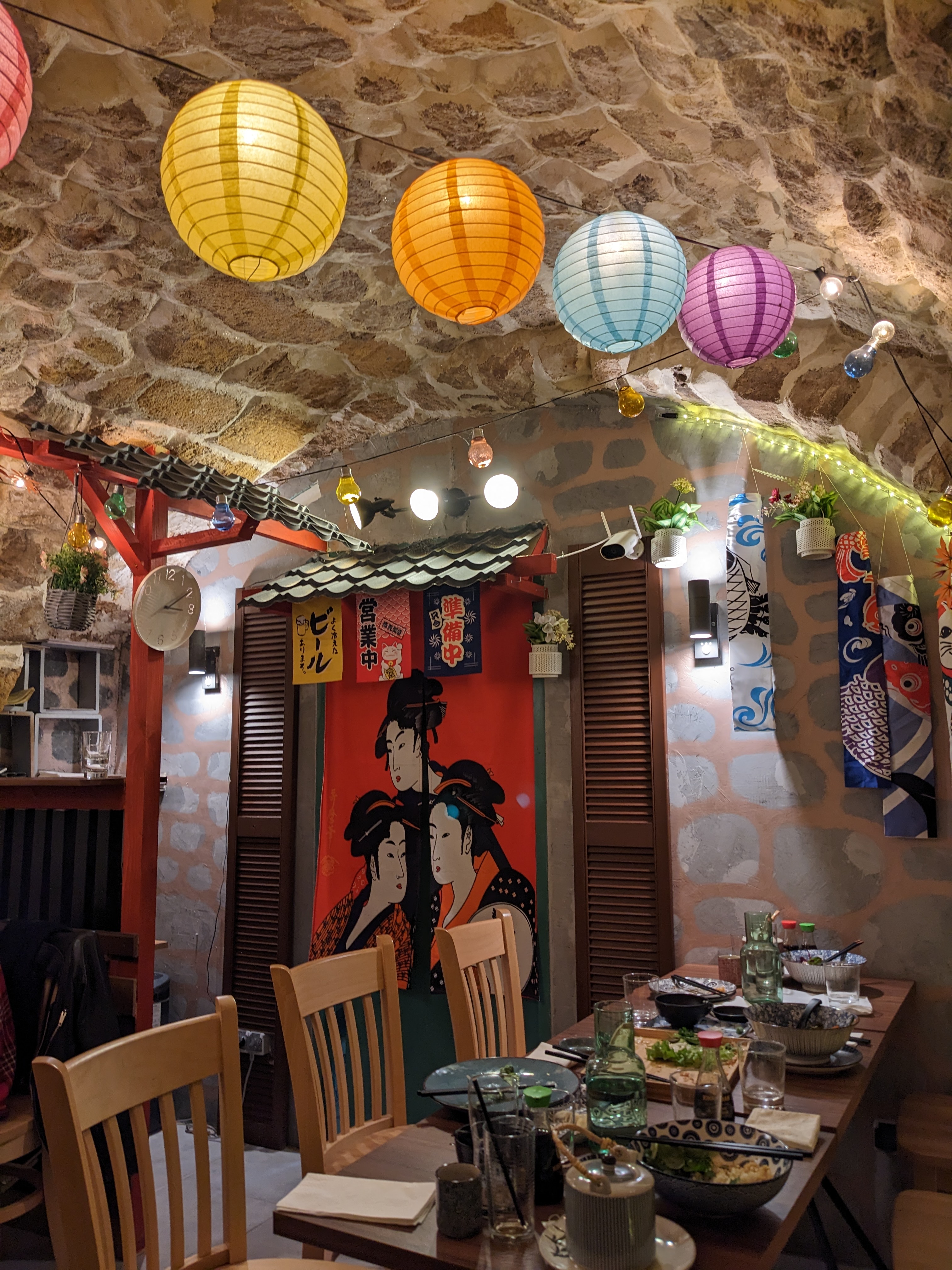 Nous sommes venus sans réservation un samedi midi a 13h30, il y avait beaucoup de monde et pourtant nous avons été tout de suite pris en charge, nous assurant qu'avec 5 minutes de patience, nous serons atablé et ce fut le cas ☺️ la decoration est tres reussi, memesi l'ebdroit n'est pas très grand, l'ambiance est dépaysante et nous avons beaucoup apprécié toutes les petites lumières. Nous avons ensuite eu le temps de choisir parmis une carte assez riche et une fois la commande passée a un personnel souriant, nous avons été servis tres rapidement. Ce fut vraiment bon et chaud et nous nous sommes régalés ! Le crispy dragon ne nous a pas déçu, le sashimi de saumon etait frais et fondant et le oden a été une belle découverte, le boeuf tendre et le bouillon délicieux. Seul bemol sur la propreté et la luminosité des toilettes qui pourraient meriter une petite amélioration. Cependant c'est un endroit que je recommande et revisiterais avec plaisir en revenant à Aix.