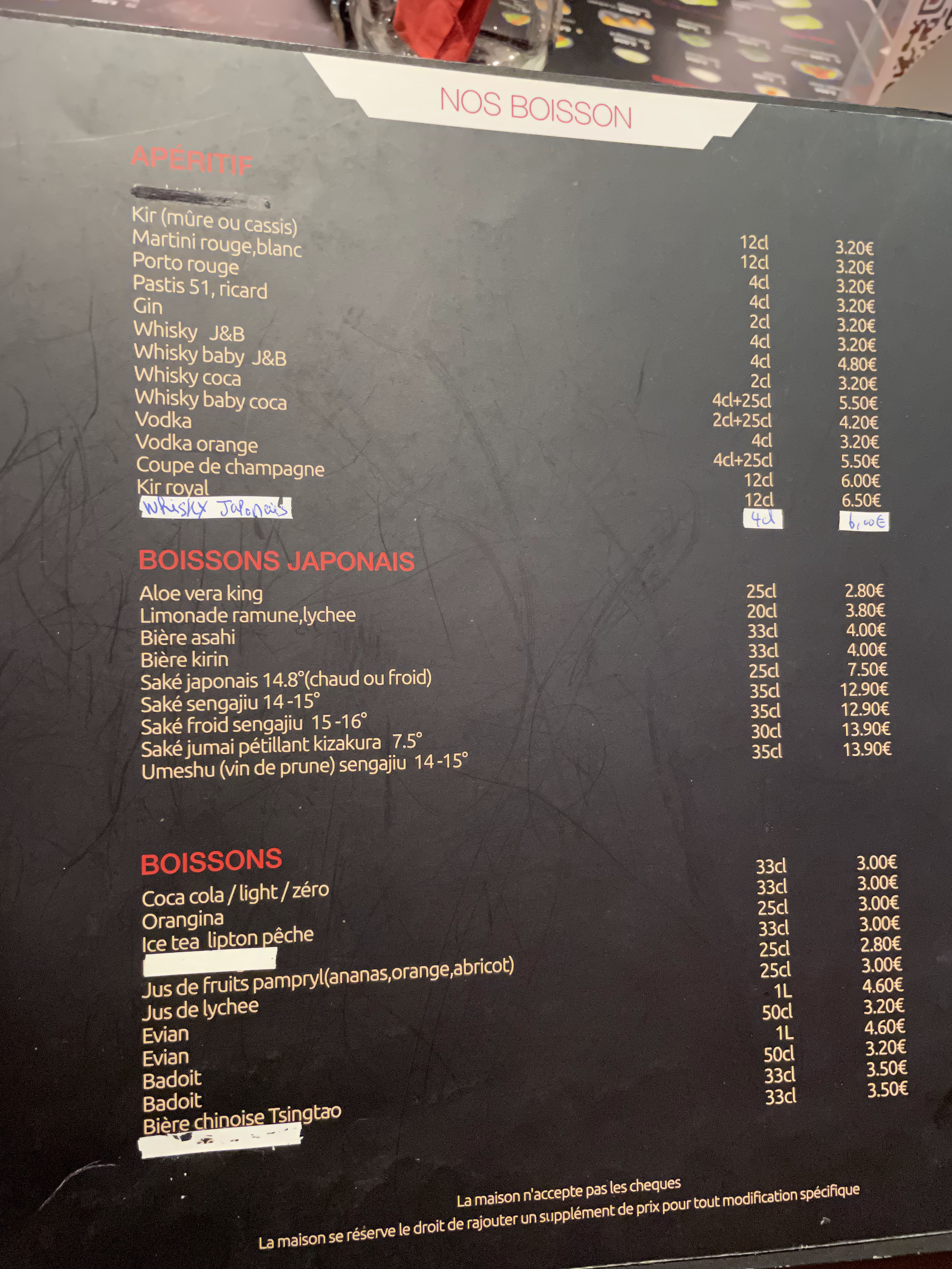 Lors de notre commande pour manger sur place je note les menus sur mon portable puis donne les numéros à la serveuse, à l'arrivée des sushi nous nous apercevons qu'il ya une erreur pour un menus, la serveuse puis la patronne nous font comprendre mais de manière flou que nous devrons payer quand même leur propre erreur ce à quoi je répond j'espère que vous rigolez je ne paie pas votre propre erreur de commande... (en sachant qu'on avait commandé plus d'une heure avant...). Au moment de passer en caisse ils ne me facturent pas leur erreur mais je m'aperçois en rentrant à la'maison qu'ils m'ont sur facturer les boissons 1€ de plus... Pratiques très douteuses car un prix affiché ne peut pas être changé et ils ont essayé de nous facturer leur erreur...