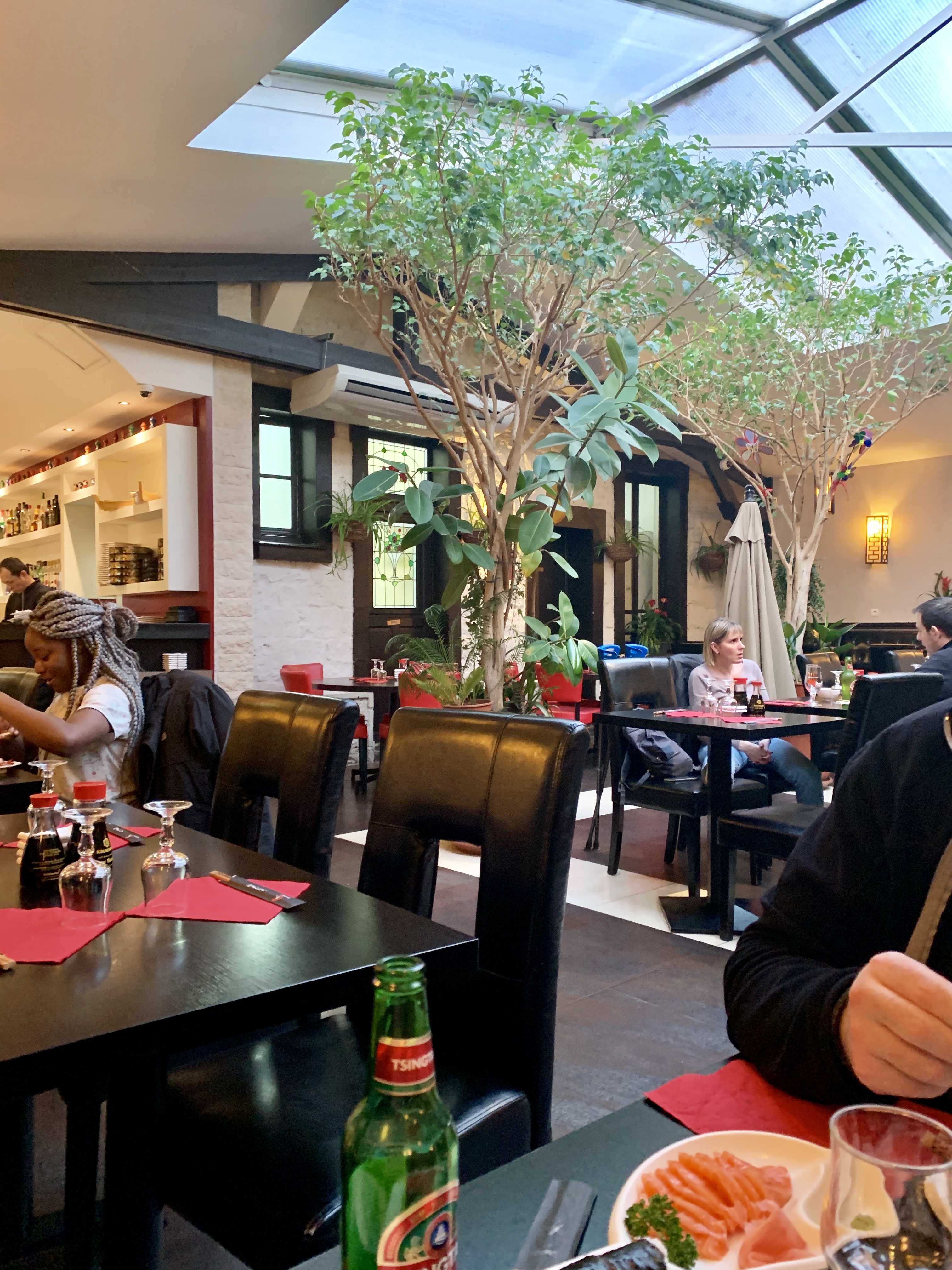 L’endroit est très joli, c’est une cour aménagée avec verrière, plantes et parasol. C’est bien la seule chose agréable. Première chose : il faut prendre en photo la carte à l’entrée pour avoir le menu, c’est presque la première chose qu’on vous dit avant bonjour. Un QR code sur les tables serait bien mieux, surtout que ce sont des robots qui vous apportent vos plats donc la technologie y est. C’est rigolo les robots mais c’est super froid et pas chaleureux (en plus la petite musique est bien flippante). La serveuse reste dans le coin et on se sent un peu observés c’est étrange. Deuxième chose : les entrées et beignets sont OK, par contre les sushis et maki j’ai rarement vu ça. Cherchez votre poisson à l’intérieur, l’algue est aussi croustillante qu’une chips et le riz était sec et dur. Je n’ai même pas pu finir.