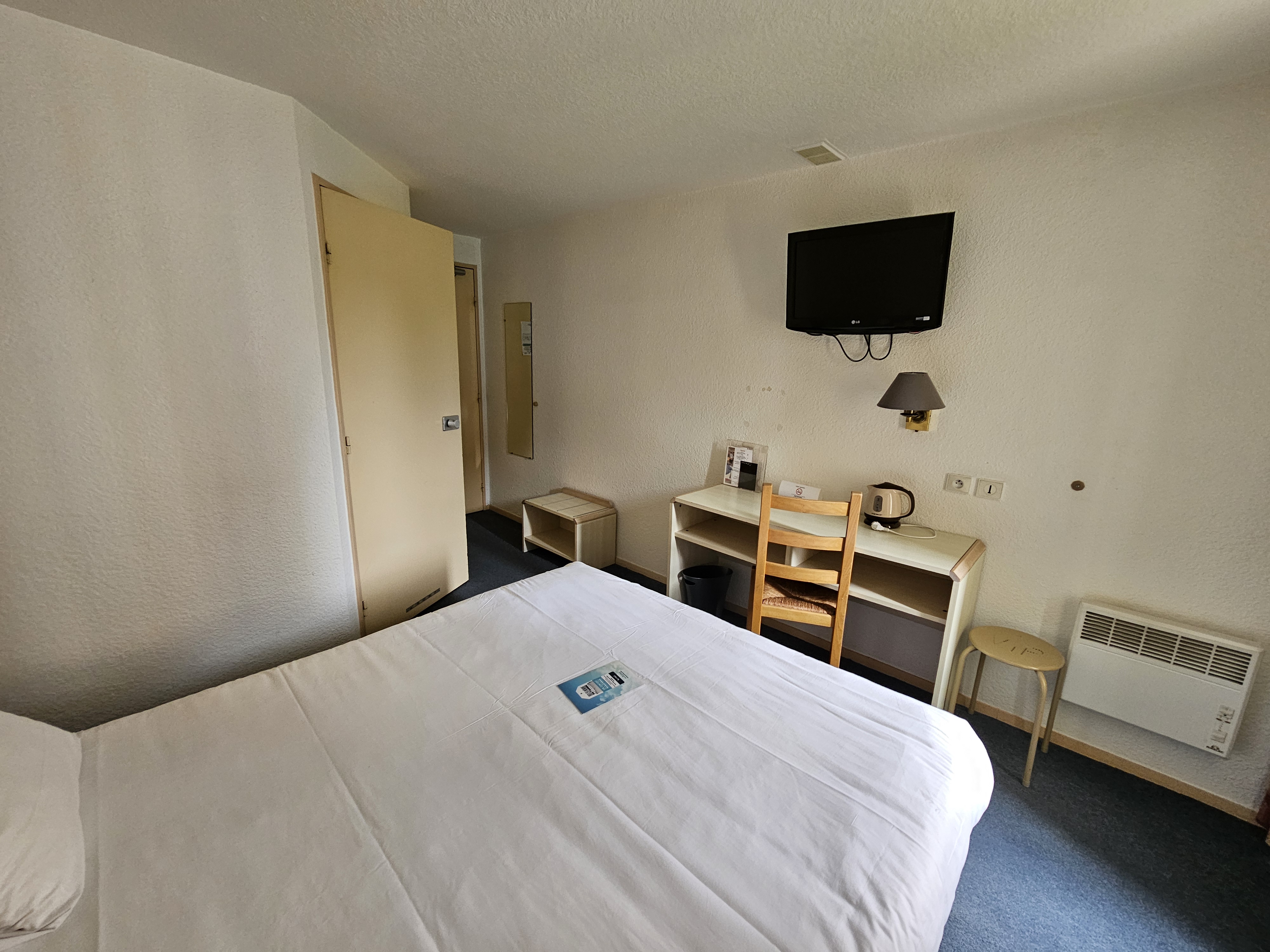 Tâche sur mon dessus de lit , bureau où on ne peut pas s'asseoir car on ne peut pas passer les jambes en dessous , pas de prises à côté du lit , radiant dans la salle de bain sur minuteur qui ne chauffe pas grand chose