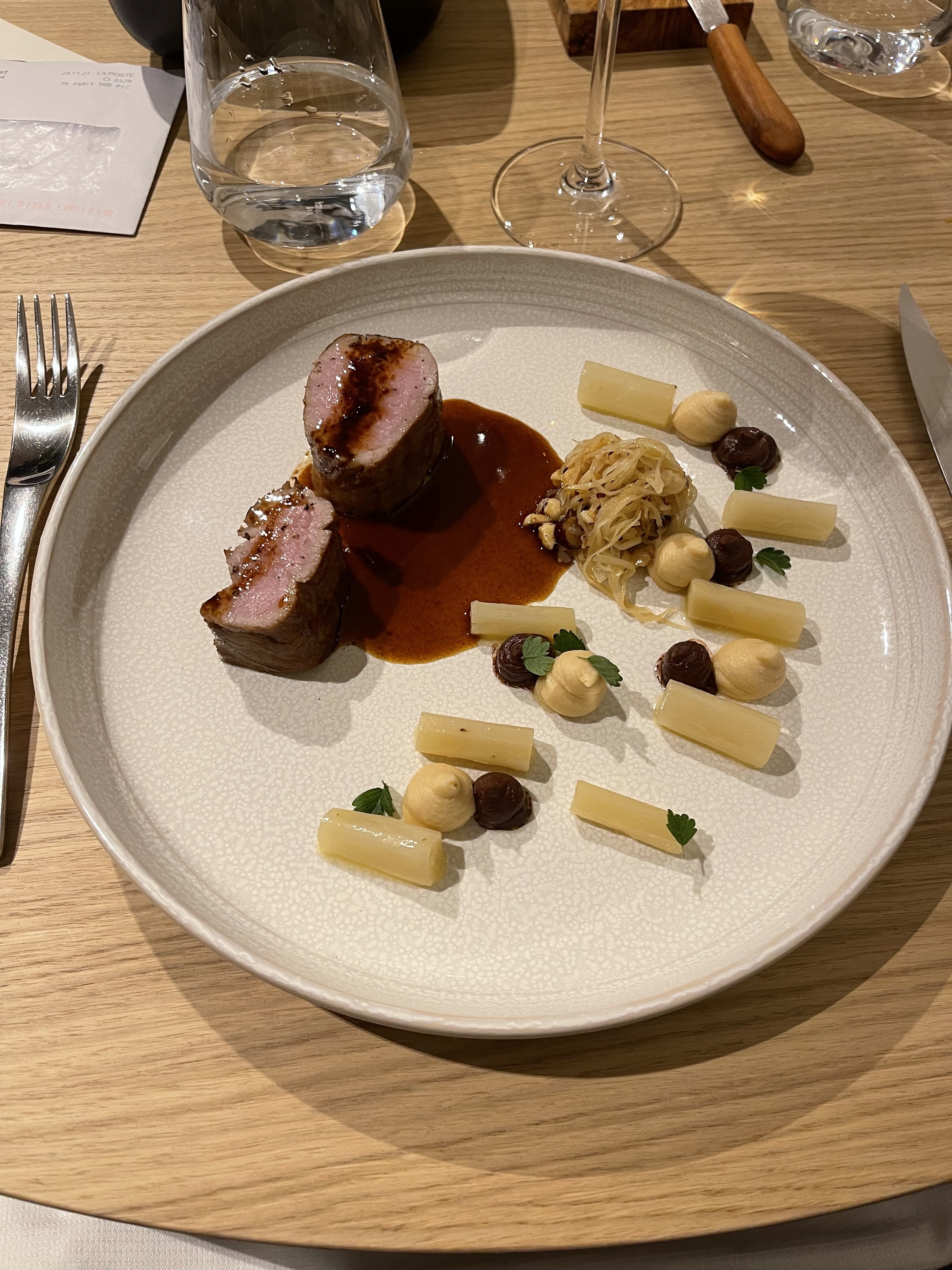 Je vais redire ici tout le bien passé à cette table de facture étoilée : tout est juste, les cuissons sont parfaites, les accords de prime abord classiques ne le sont finalement pas et révèlent leur originalité intrinsèque, les jus les bouillons les écumes sont nickels etc. Et parfois, on touche l'extraordinaire (en ce moment, le marbré de cabillaud et son bouillon dashi-peau de cacao) tandis que le fromage revisité par le chef vaut à lui seul l'intérêt de venir à cette table starisable. Enfin, attardez-vous avec attention sur les petits points, spots, ploutchs (appelez-les comme bon vous goûterez) qui sont souvent exceptionnels de justesse de finesse et de balance (ah, cette précise acidité pour équilibrer l'assiette !). En résumé, quel kiffe, cette table !!! Merci beaucoup pour ces multiples plaisirs. N.B.: le service est amplement à la mesure de.