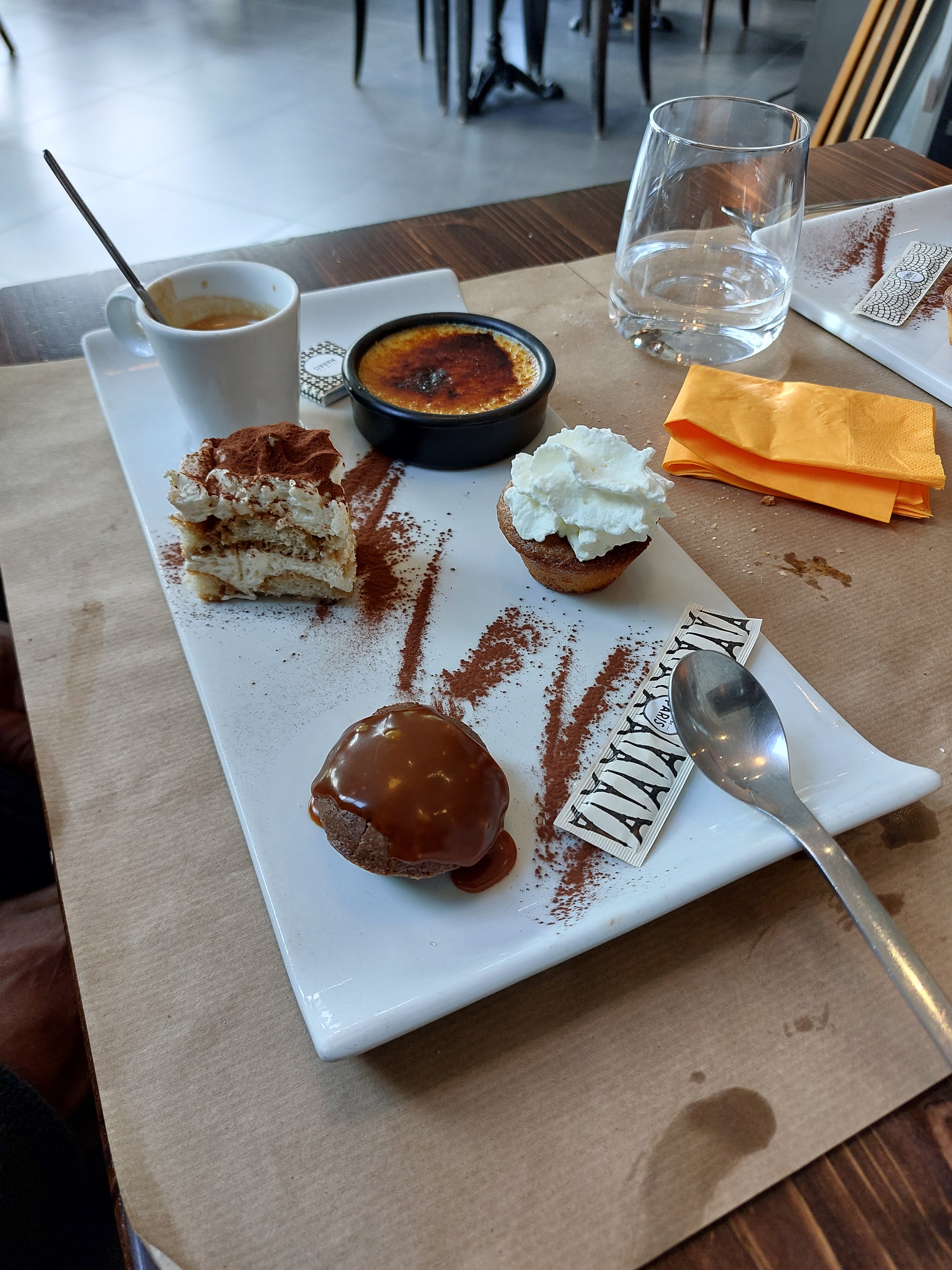 Vraiment déçu des planches de charcuterie qui ne mérite pas le prix payé. Déçue également du café gourmant qui n'est pas aussi gourmant que ce qui est annoncé sur leur site internet. Café gourmand (Petite boule vanille, petite salade de fruit, petit carré de fondant chocolat) pour le prix payé c'est un peu exagéré! Cependant le mi-cuit au chocolat est plus correct. Pour ma part sympa uniquement pour boire un verre mais pas pour manger.