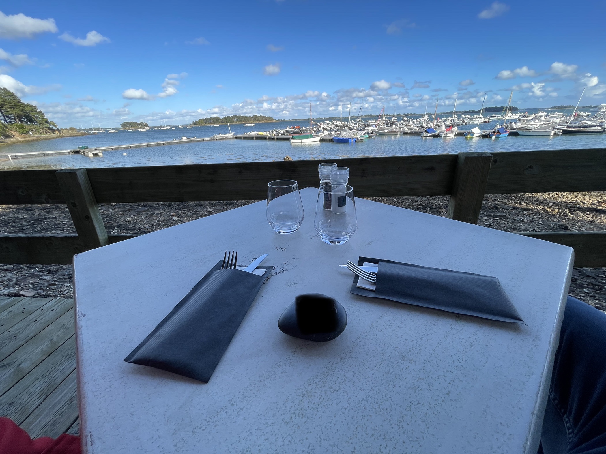 Vue sur le golfe du Morbihan, près de la base nautique. Bel emplacement et personnel accueillant. Dégustation huîtres et superbe café gourmand