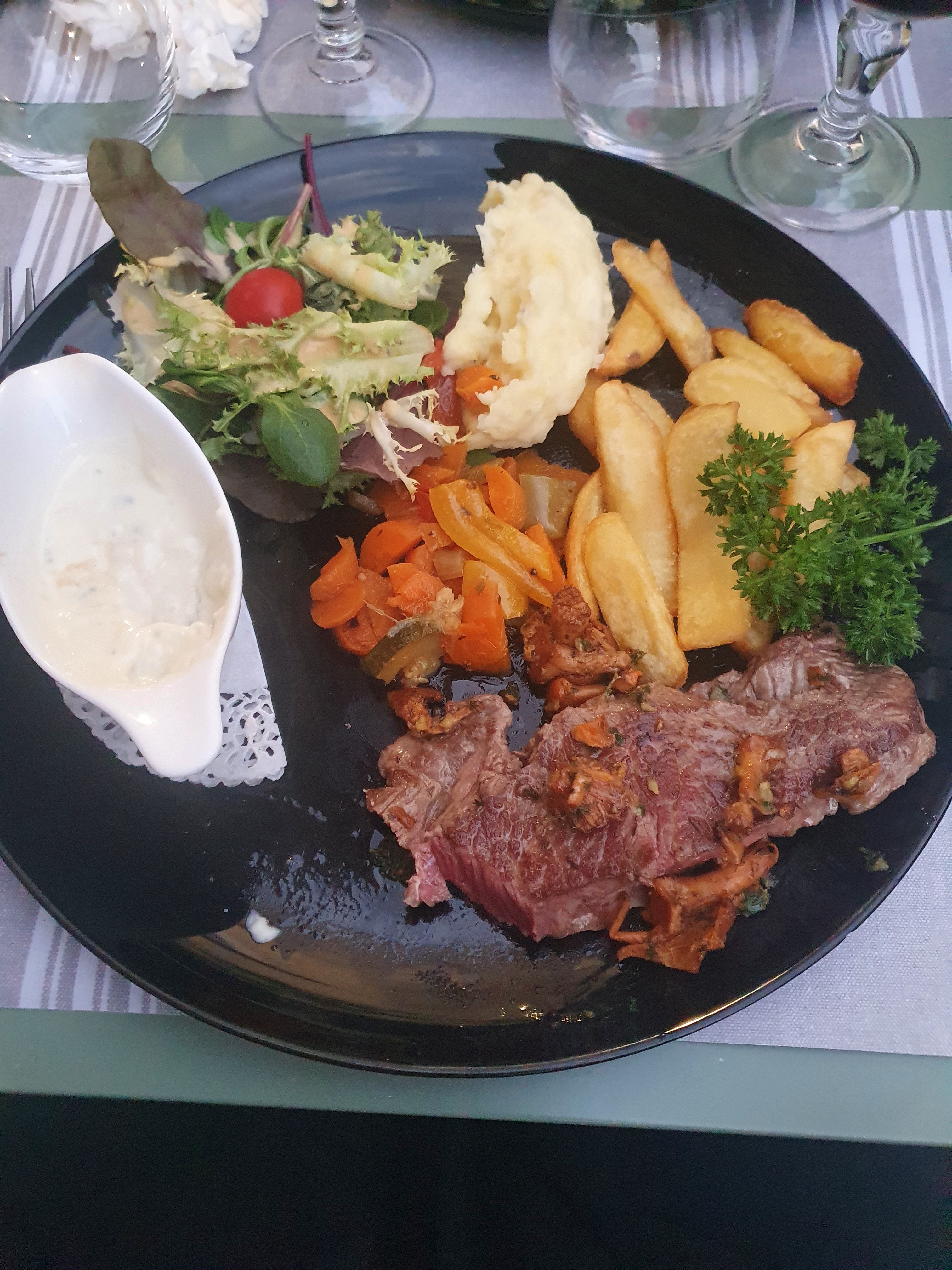 Assiette très bonne et très copieuse mais un service à déplorer, mes frites sont arrivées une fois l’assiette fini, le rosé avec le dessert……. Et le pain on l’attend encore ….