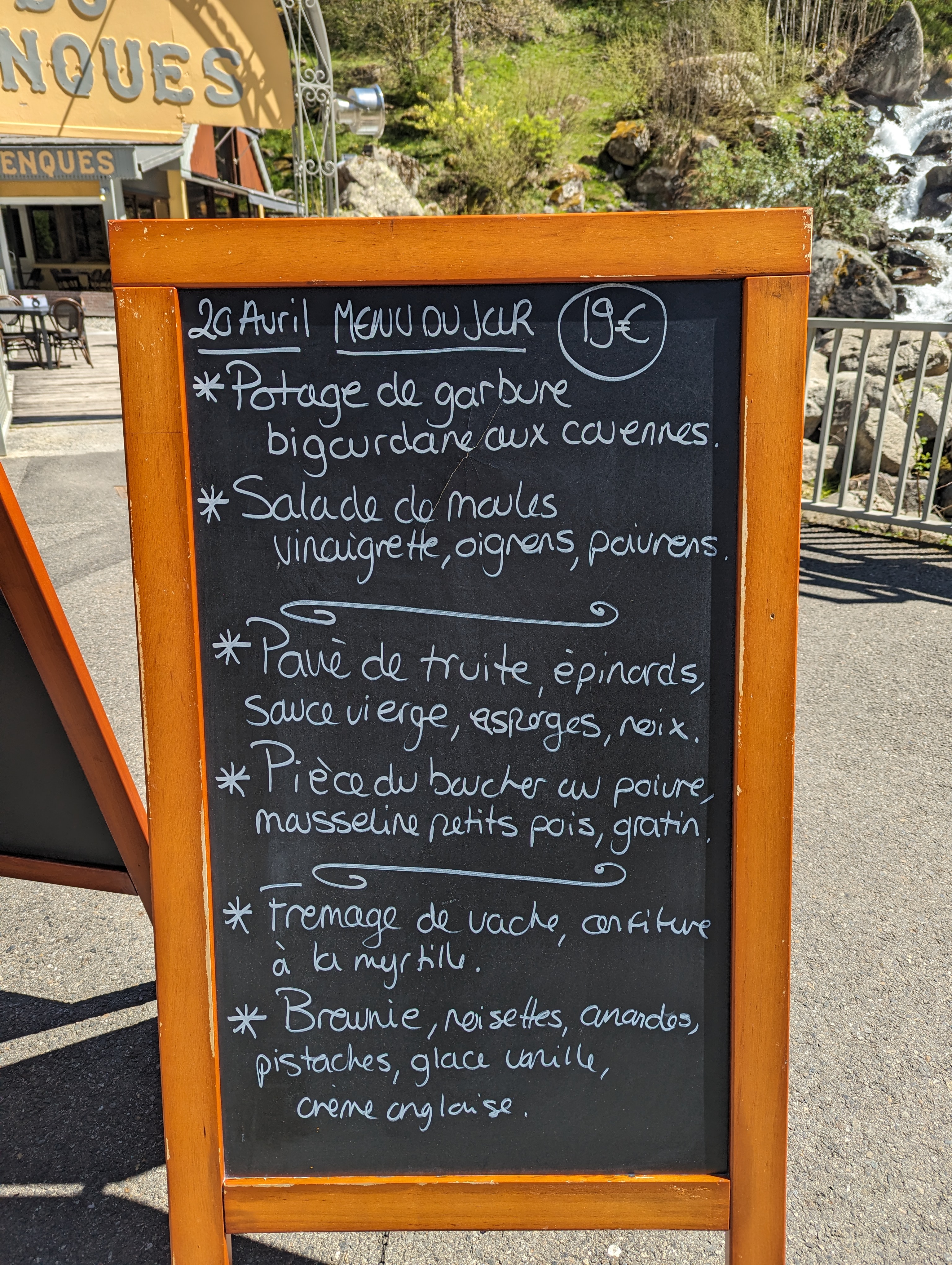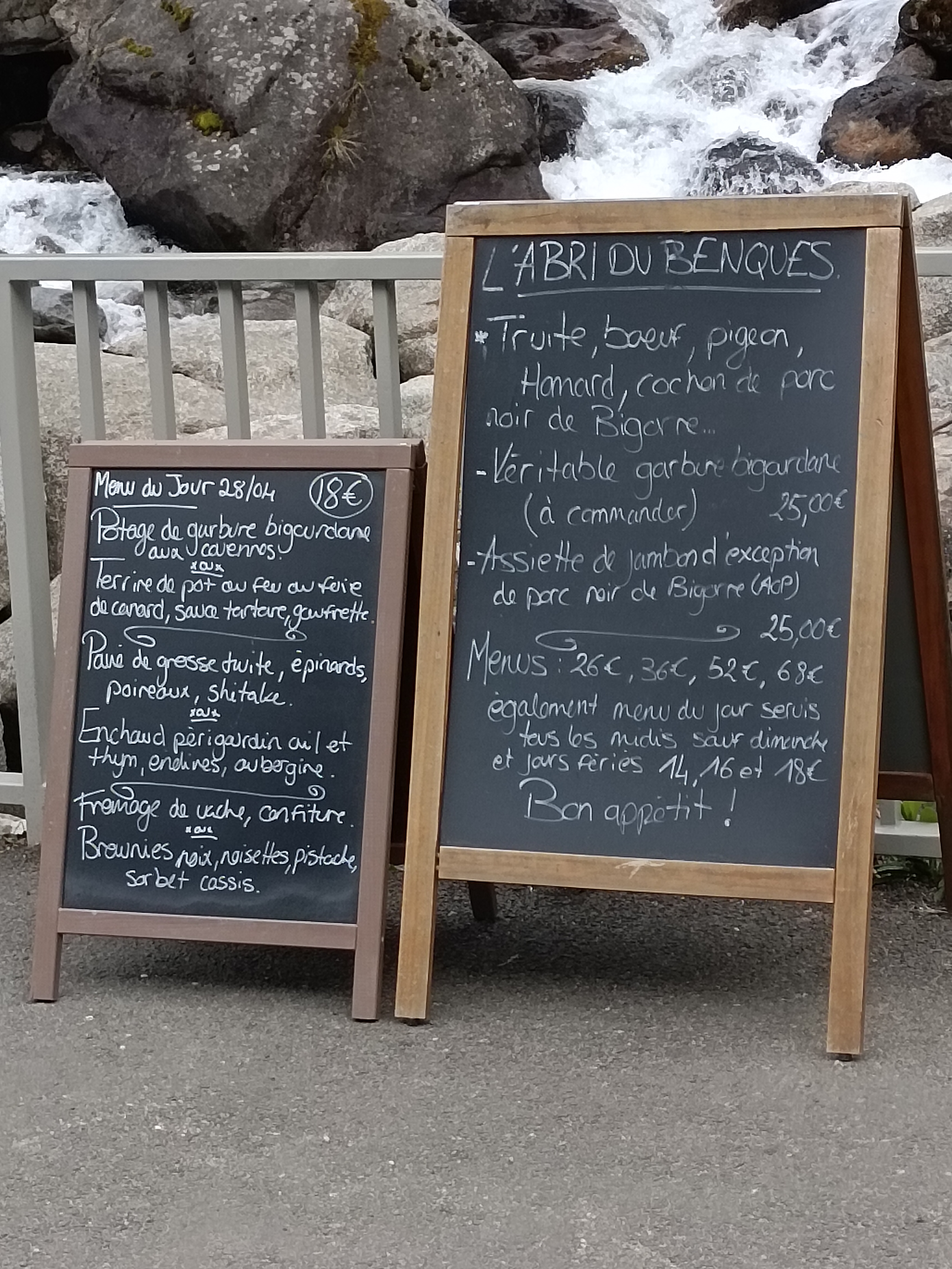 L ardoise a l extérieur affiche le menu du jour qui change régulièrement.menu a 18 euros le midi avec garbure aux couennes puis pavé truite et ses légumes saison(un peu trop salé a mon gout mais très bon malgré cela)et brownie.repas a l intérieur.avec l apéritif petit apéritif salé et avec le café mini panacotta aux fruits rouges(gentilles attentions comme le reste très bien).salle pleine.service efficace.chauffage mis pendant service car rafraîchissement du temps(et même la terrasse peut se ferme pour protéger du temps maussade).