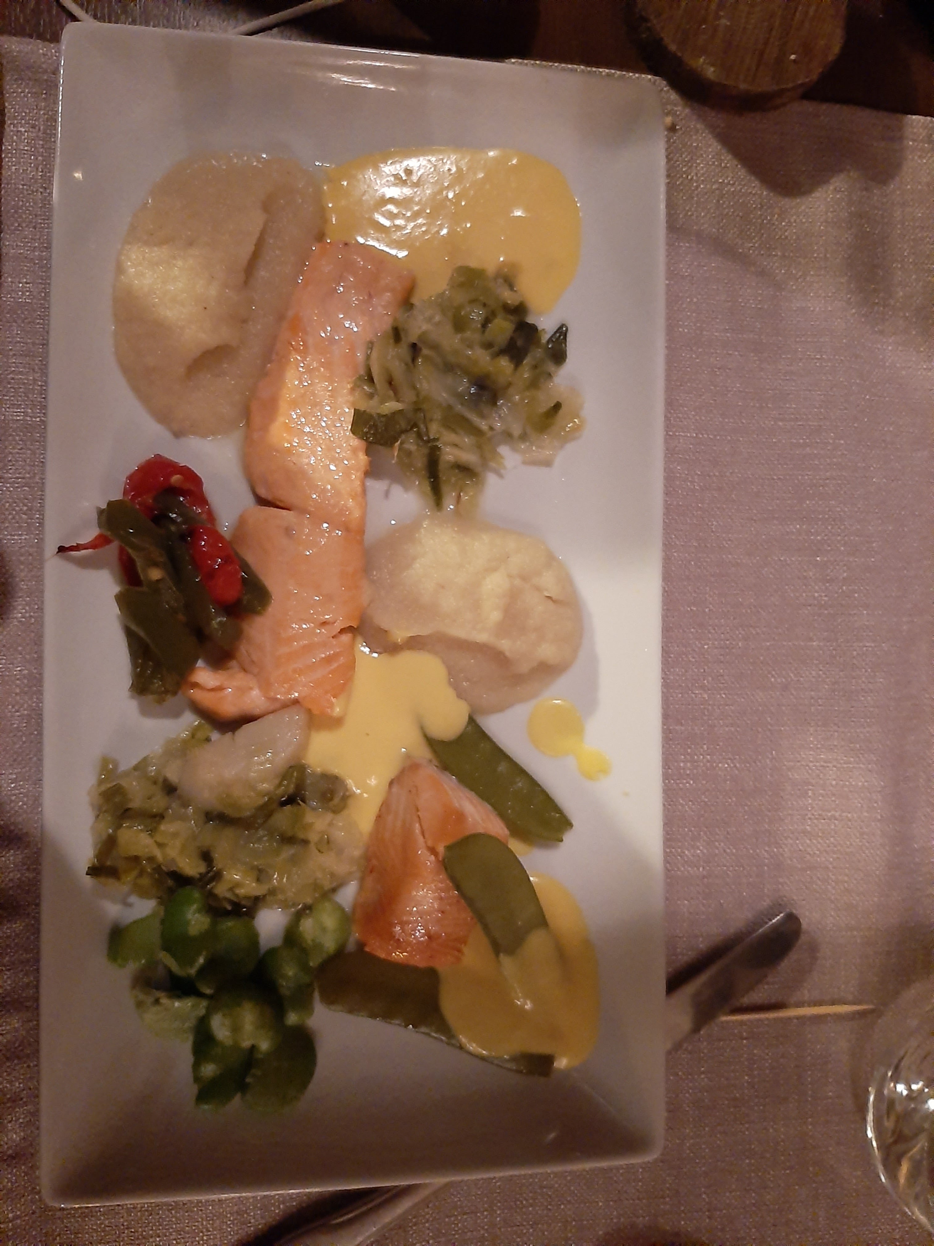 Avons eu froid en déjeunant sous le auvent peu et mal chauffé. Service long entre les repas. Plats très bons.