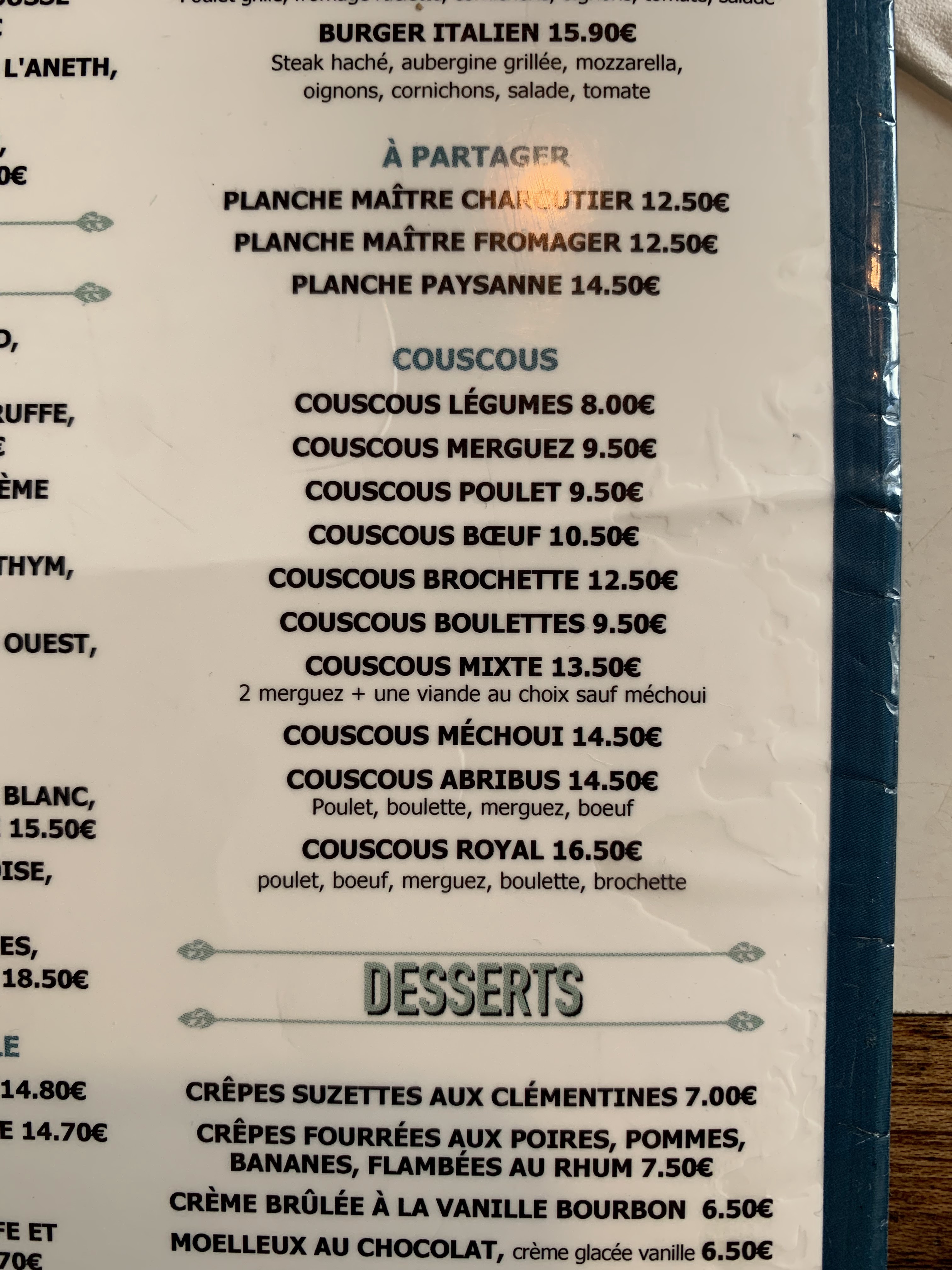 Un décor improbable, cheval d'arçon et goutes au plafond...une salle sympa, un service souriant...les sens sont en éveil grâce aux variations multiples des couscous, beaucoup de fraîcheur dans les légumes, des merguez goûteuses, des boulettes qui gagneraient a plus de menthe (a mon goût !)...des hamburgers comme nulle part ailleurs (au bleu...) Un choix de bières, l'annisette Cristal aurait remplacé avantageusement le pastis servi ,comme les plats, avec générosité...ah oui !! Un JUSTE PRIX pour un excellent moment...
