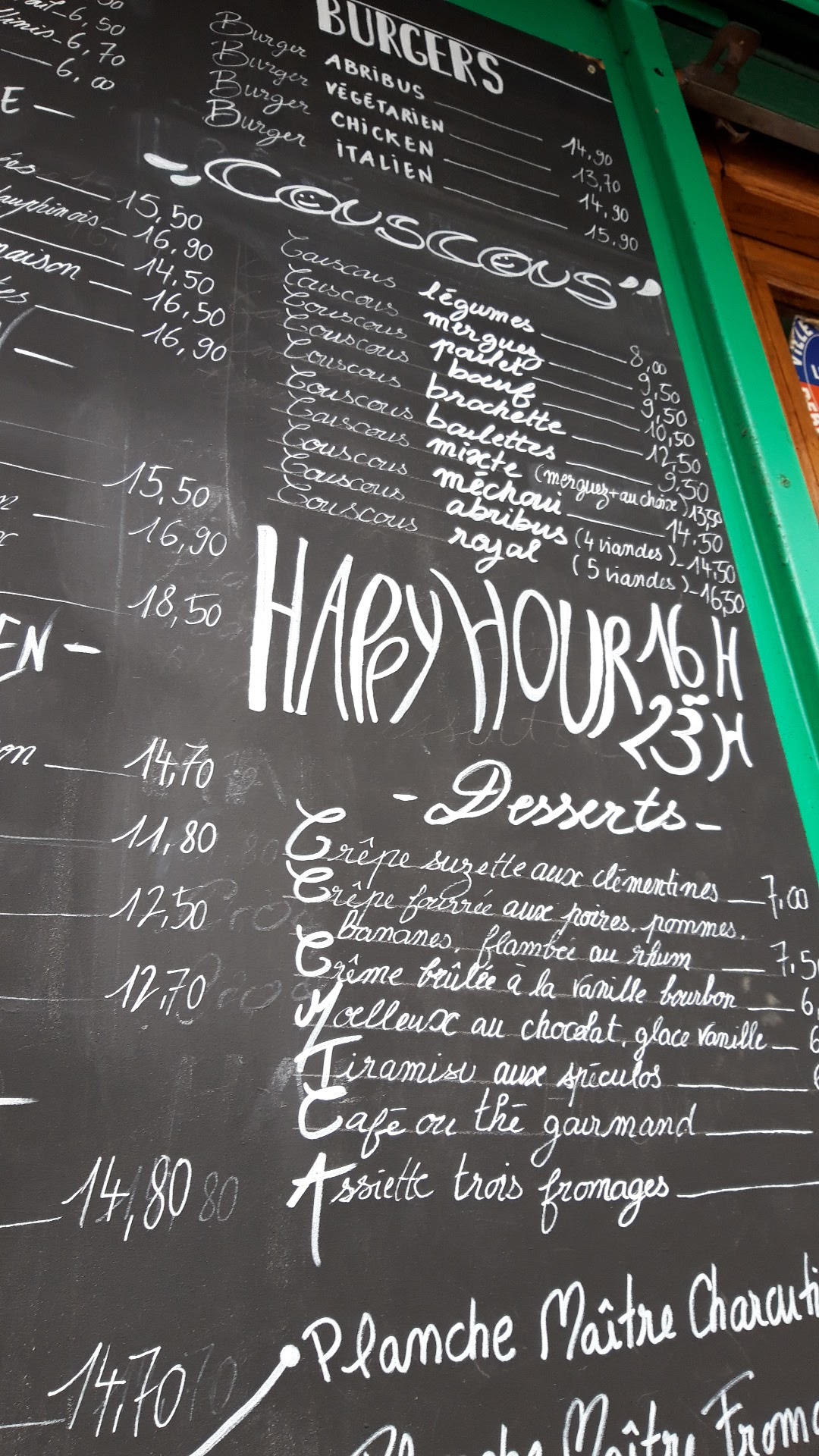 Formule menu propose sur la pancarte en terrasse, mais qu'on nous annonce proposée uniquement le midi une fois installés. Le Bistrot de typique, ce qui est agréable. Un peu bruyant car beaucoup de monde ce soir. Couscous sympa et copieux. Les bières proposées en Happy hours (jusqu'à 21h) sont originales et bonnes. Le patron s'est montré sympa lors de l'encaissement. J'ai passé une agréable soirée en somme.