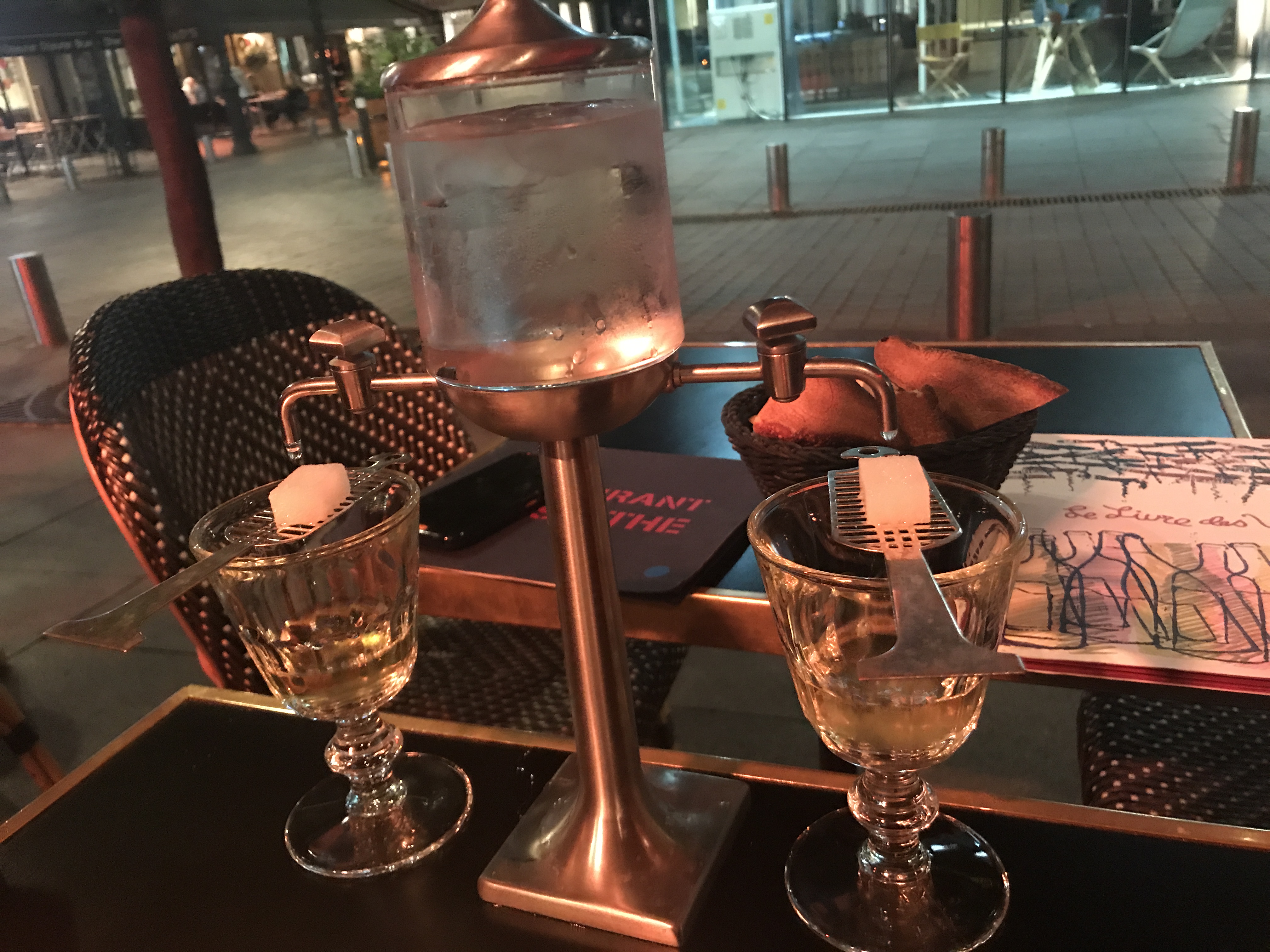 Après que ma femme se soit couchée, j'ai décidé de me promener dans Paris. Pour une raison quelconque, l’idée d’essayer l’absinthe m’est venue à l’esprit. Je l'ai cherché sur Google et, bien sûr, L'Absinthe est apparue. Heureusement, c'était accessible à pied et comme j'étais en promenade, j'y suis allé. J'ai expliqué au sympathique jeune serveur que j'étais nouveau dans l'absinthe. Il a recommandé leur propre marque et a patiemment décrit le rituel simple et m'a permis de démarrer. Il était assis dans une terrasse de café à Paris à côté d'un couple de belles jeunes Parisiennes, buvant leur conversation musicale et leur fumée de cigarette. En fait, ma femme se prépare à nouveau à se coucher en ce moment.......