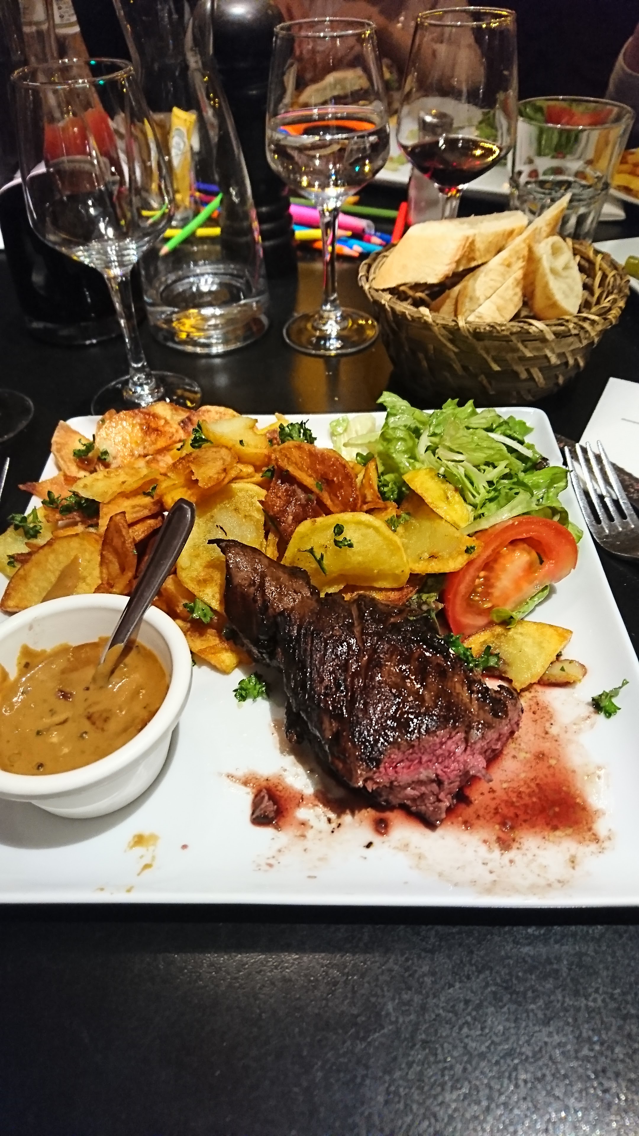 Bavette avec pommes sautées très bonne, coulant au chocolat un peu trop cuit et en trop petite quantité ainsi que la glace à la vanille qui va avec.
