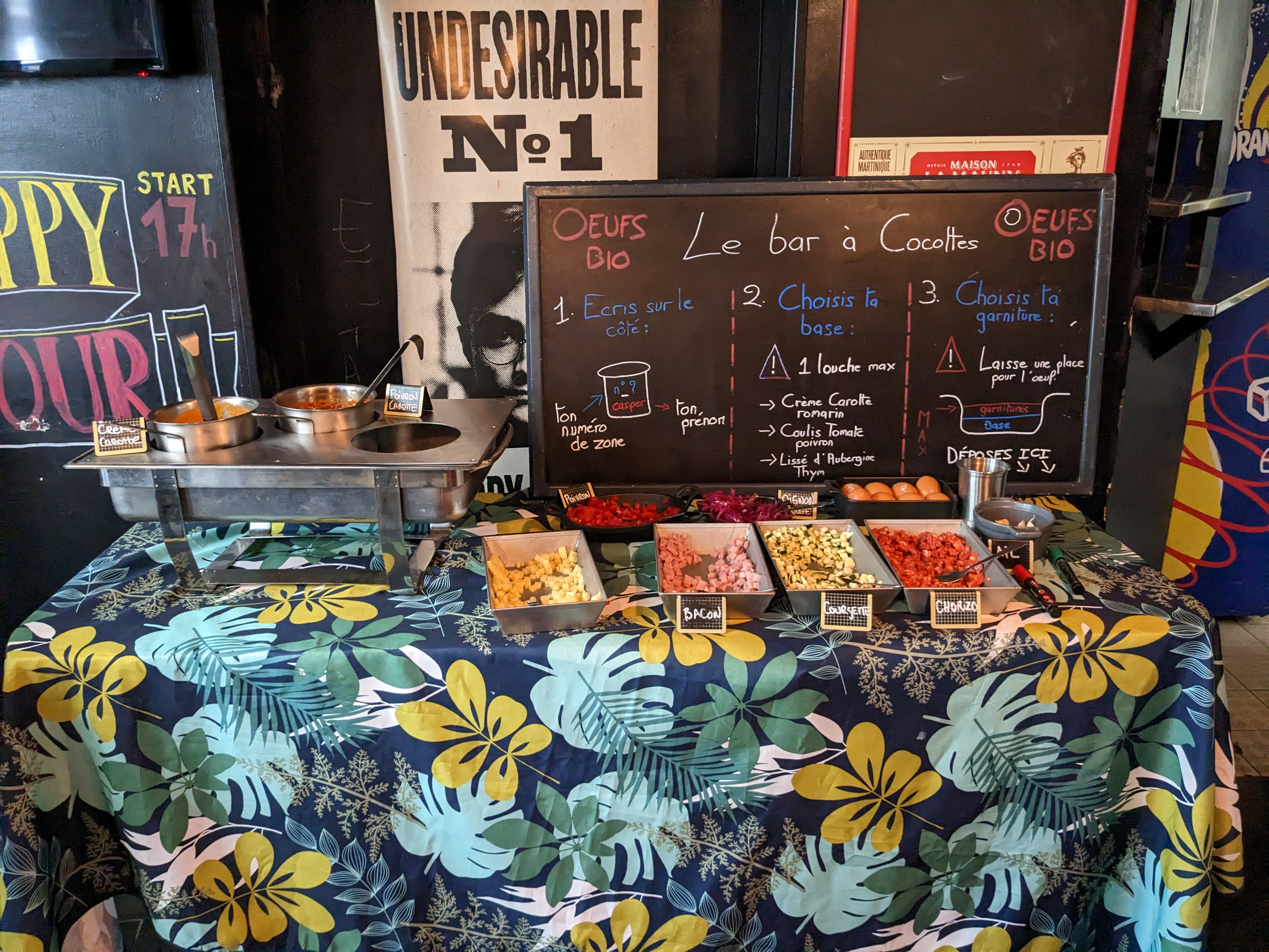 Découverte pour moi de cet endroit très sympathique pour un brunch ce dimanche. Brunch bien garni et de très grande qualité avec des produits maison (fondant au chocolat, crumbble aux pommes, caramel au beurre salé,...) original avec le bar à cocotte! La charcuterie et le formage proposées sont également très bons. Il manque peut être du saumon et d'avocat pour que le buffet soir complet. Les serveuses sont super agréables. je recommande ce lieu et je pense qu'il doit y avoir une bonne ambiance le soir! A tester
