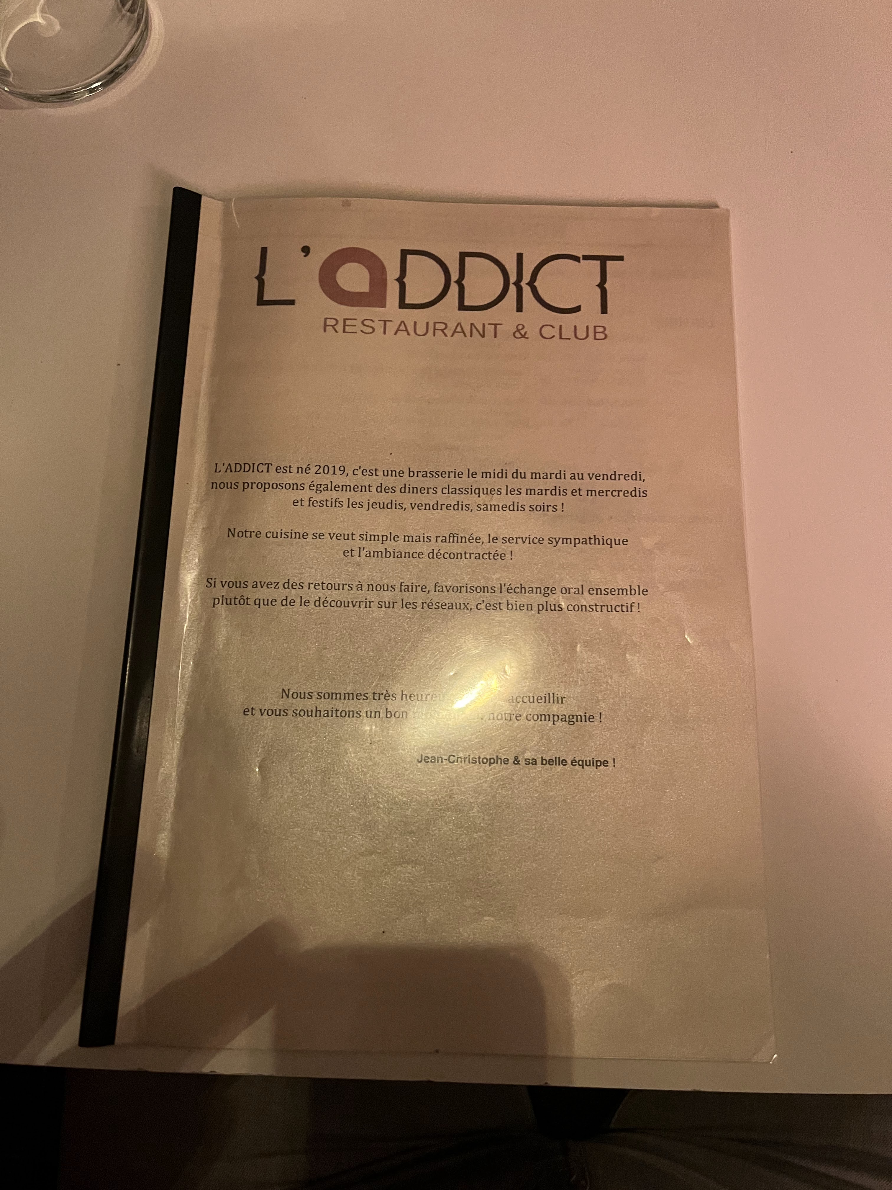 Nous sommes venus pour la 1ère fois pour la soirée du 31/12/23, très bon menu, nous nous sommes régalés, très bons vins à la carte. Nous avions avec nous une personne avec allergie alimentaire et le staff n’a pas manqué de veiller à faire très attention y compris le Chef qui a préparé une viande et sauce spécial pour notre ami, bravo. Toute l’équipe était très sympathique et attentionnée. La fête au top ! Super Dj bonne ambiance et bonne musique ! Nous reviendrons avec plaisir. Merci l’Addict pour cette superbe soirée, vous nous avez fait commencer l’année en beauté !