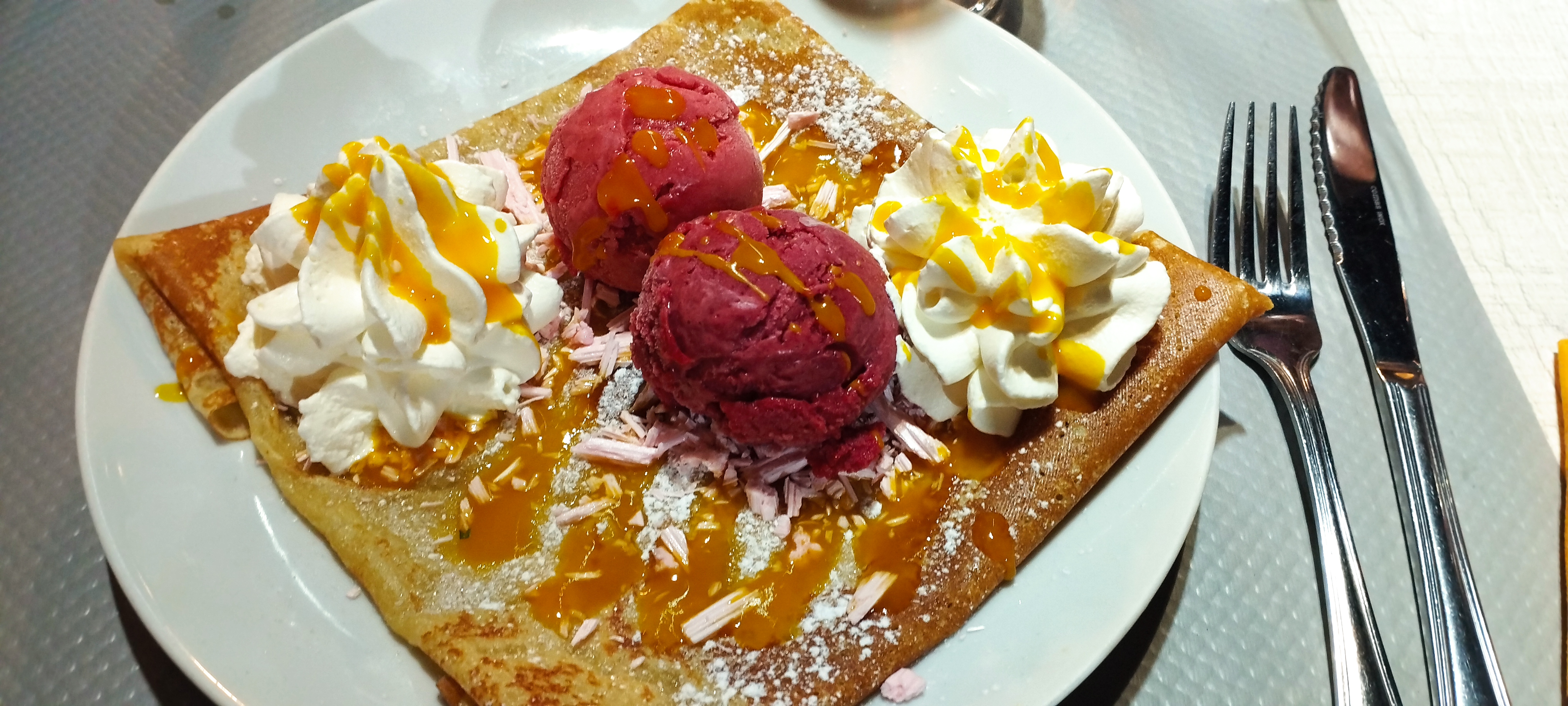 J'ai adoré: les galettes bien garnies et très copieuses, le magret de canard est exquis je vous conseille la sauce cognac qui va très bien avec, et pour finir sur les desserts comment pas parler de leurs crêpes toutes aussi bonnes les unes que les autres avec ce nombre de crêpes le choix est renversant