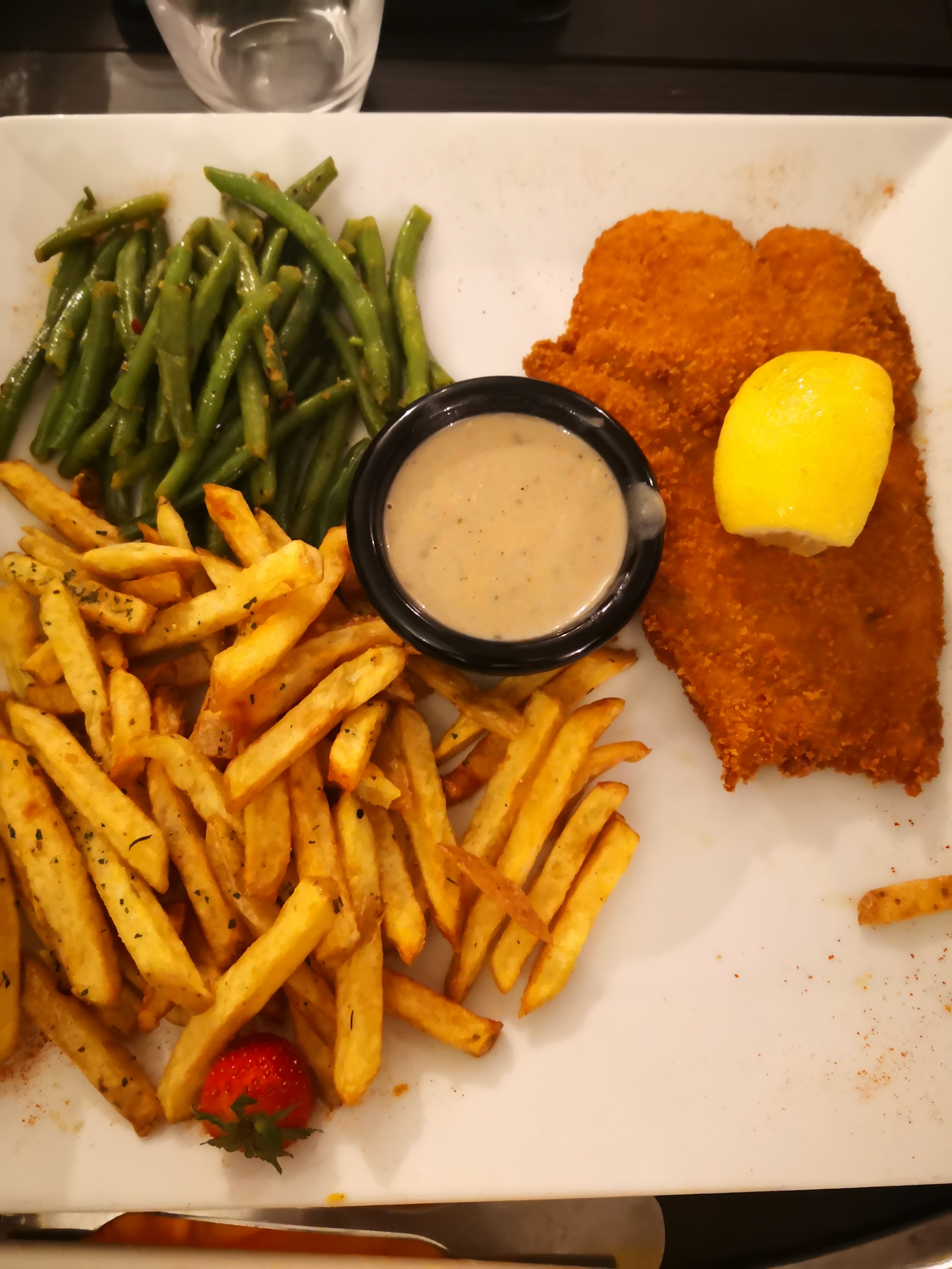 Le poulet n’avais pas beaucoup de goût, pas épicé , la sauce parmesans avait plus le goût de lait que parmesans malheureusement. Et les frites… étaient trop cuite de l’extérieur et pas assez à l’intérieur… je ne sais pas comment ils ont fait mais ils ont réussis. Cependant bien reçu malgré l’arrivée relativement tard et le personnel très aimable.