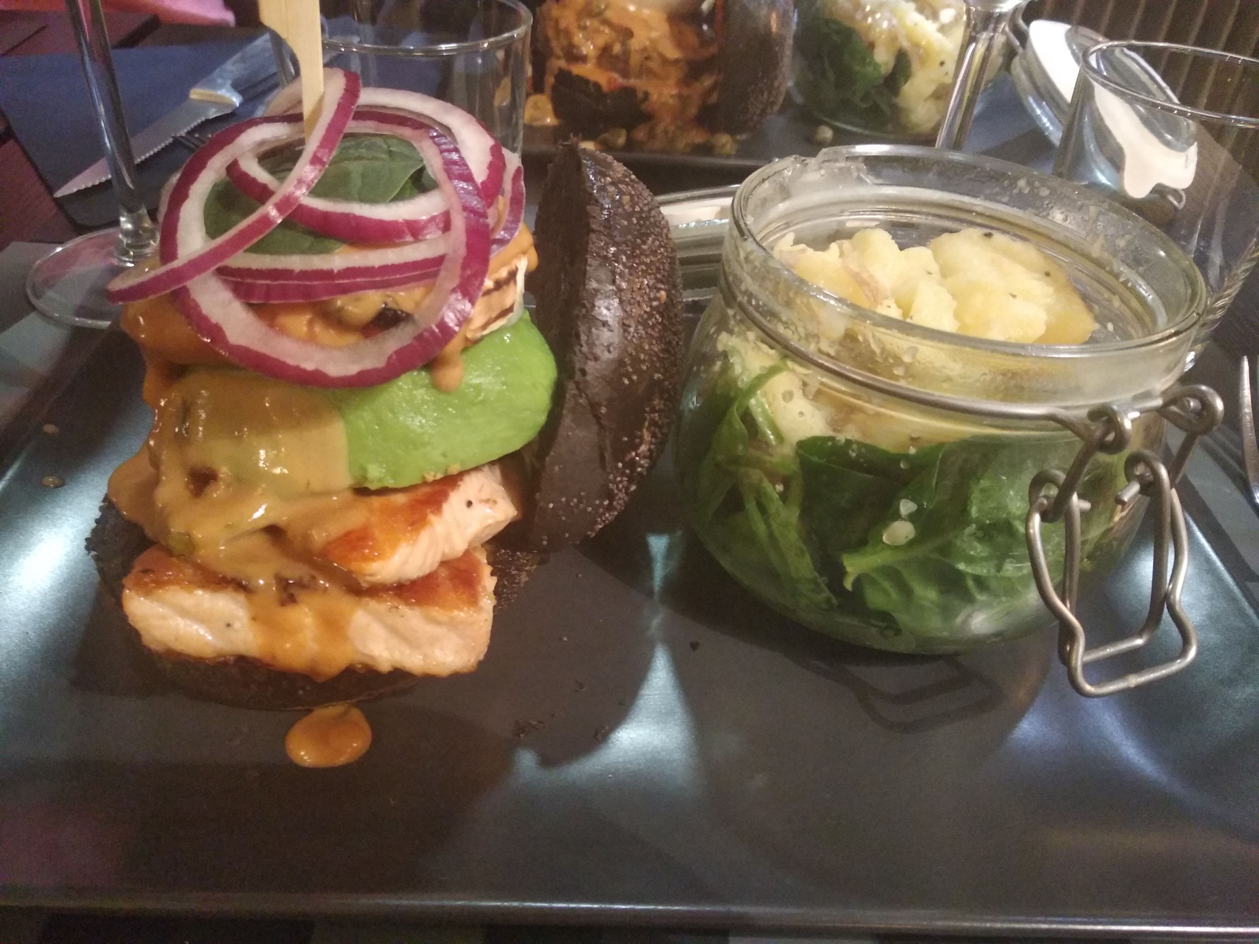 Excellent accueil mais burger vraiment pas à la hauteur de la réputation et du prix. Trop de sauce qui masque l'accord entre les ingrédients ; saumon trop peu préparé ( couche de graisse grisâtre encore présente), pain humide...et quand même, un peu l'impression d'avoir été pressé de terminer le repas. Un bon moment quand même...