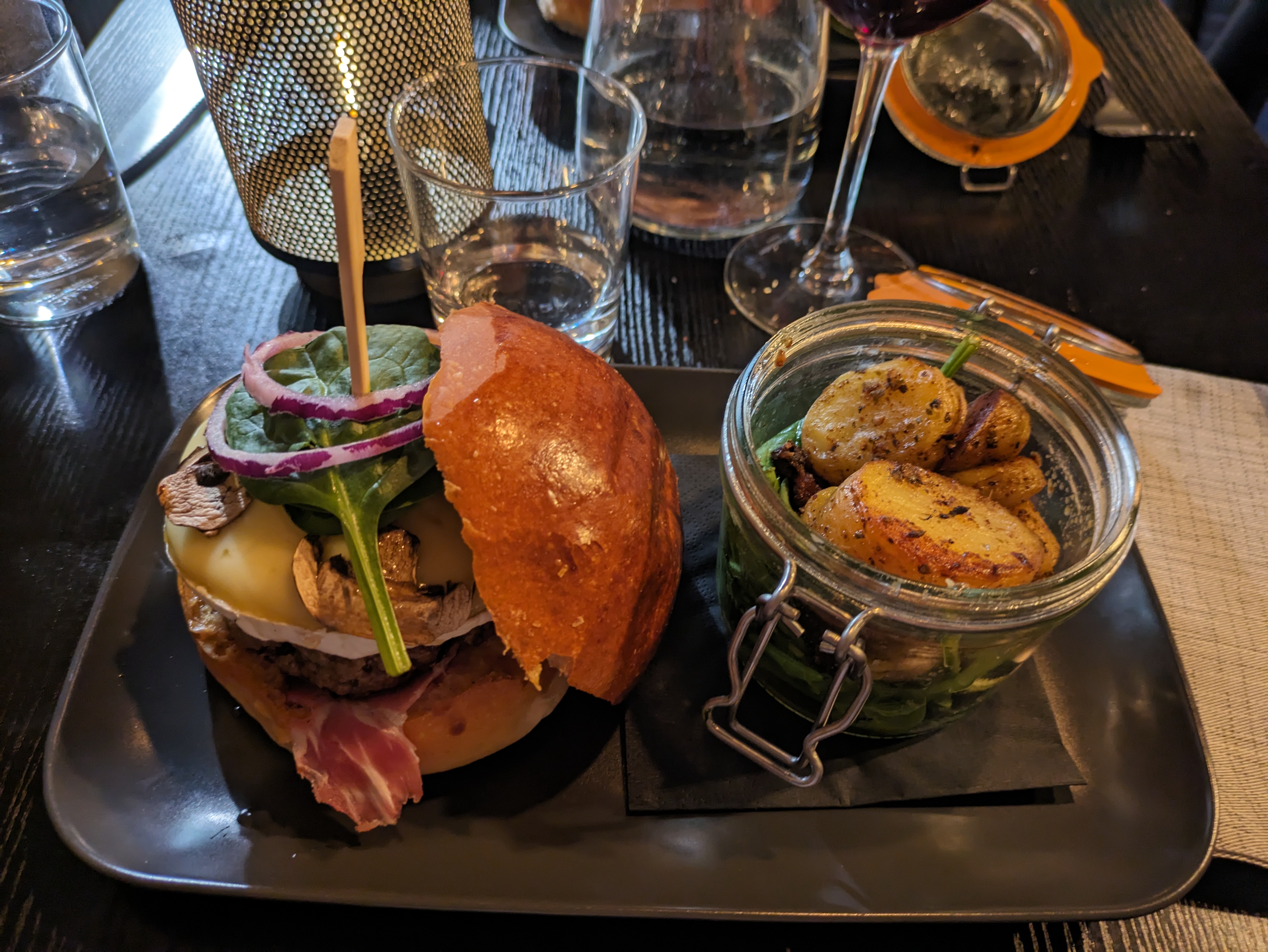 Nous avons pris un burger autonmnal et un burger rossini accompagnés de vin rouge. Les burgers étaient excellents, et étaient accompagnés de pommes de terre à l’ail et une salade dans un bocal (très original). Nous avons été super bien accueilli, le gérant est attentionné et d’excellents conseils. Je recommande pour ce super rapport qualité / quantité / prix !!!