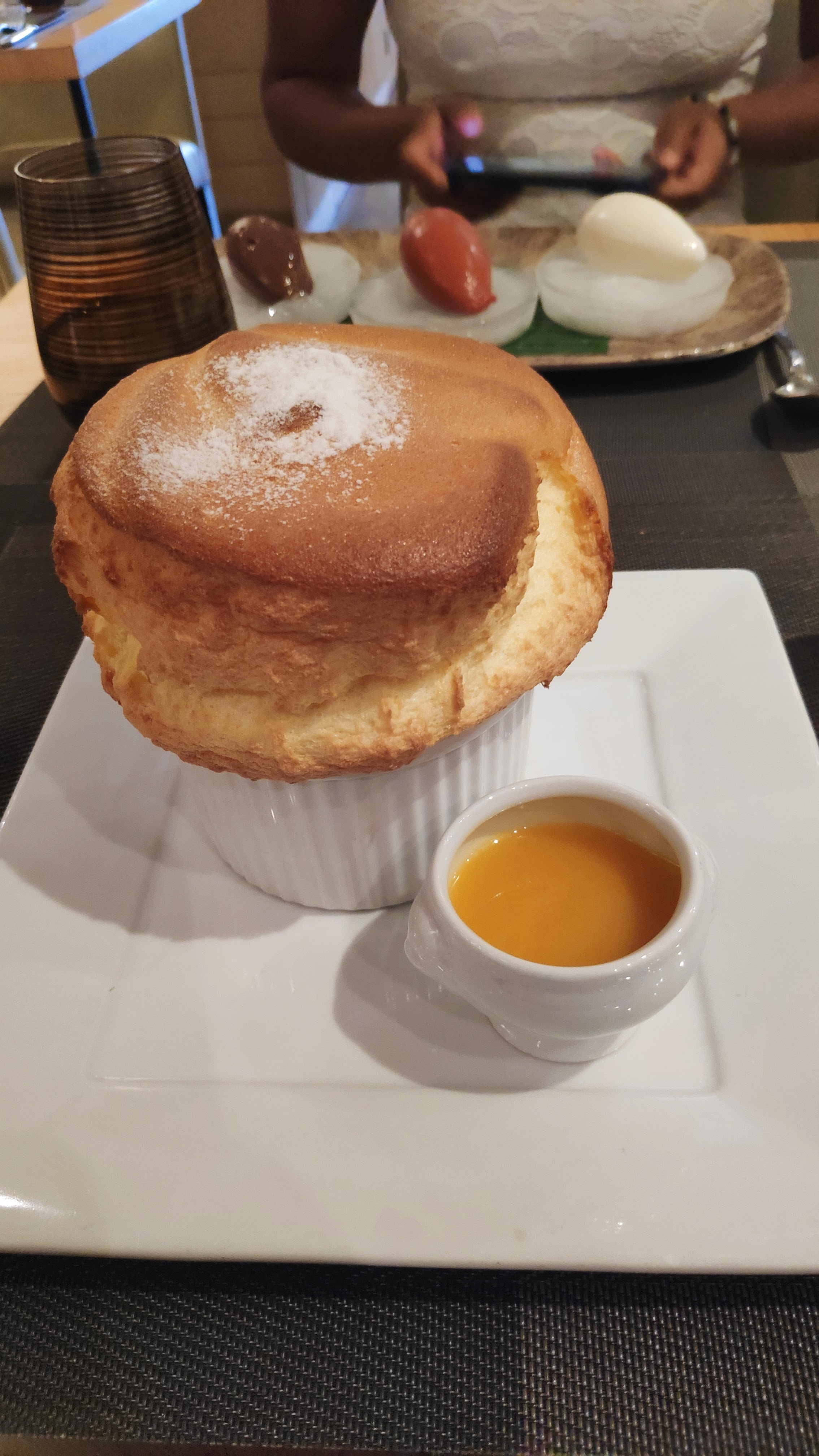 L'entrée avec l'œuf et la truffe était la meilleure des trois. Le saumon était également bon. La cuisse de canard était tendre mais un peu trop salée. Le poulet était plutôt bon. Le soufflé allait bien. Pas aussi moelleux que je l'imaginais, mais assez bien. Le goût alcoolique de la sauce à l’orange était plus fort lorsqu’elle était versée sur le soufflé ; quand on le dégustait uniquement, l’alcool n’était pas aussi fort. Personnellement, j’aimais qu’il soit mangé séparément (comme prendre une cuillerée de soufflé et le tremper dans la sauce pour que le goût de l’alcool ne soit pas aussi fort.).