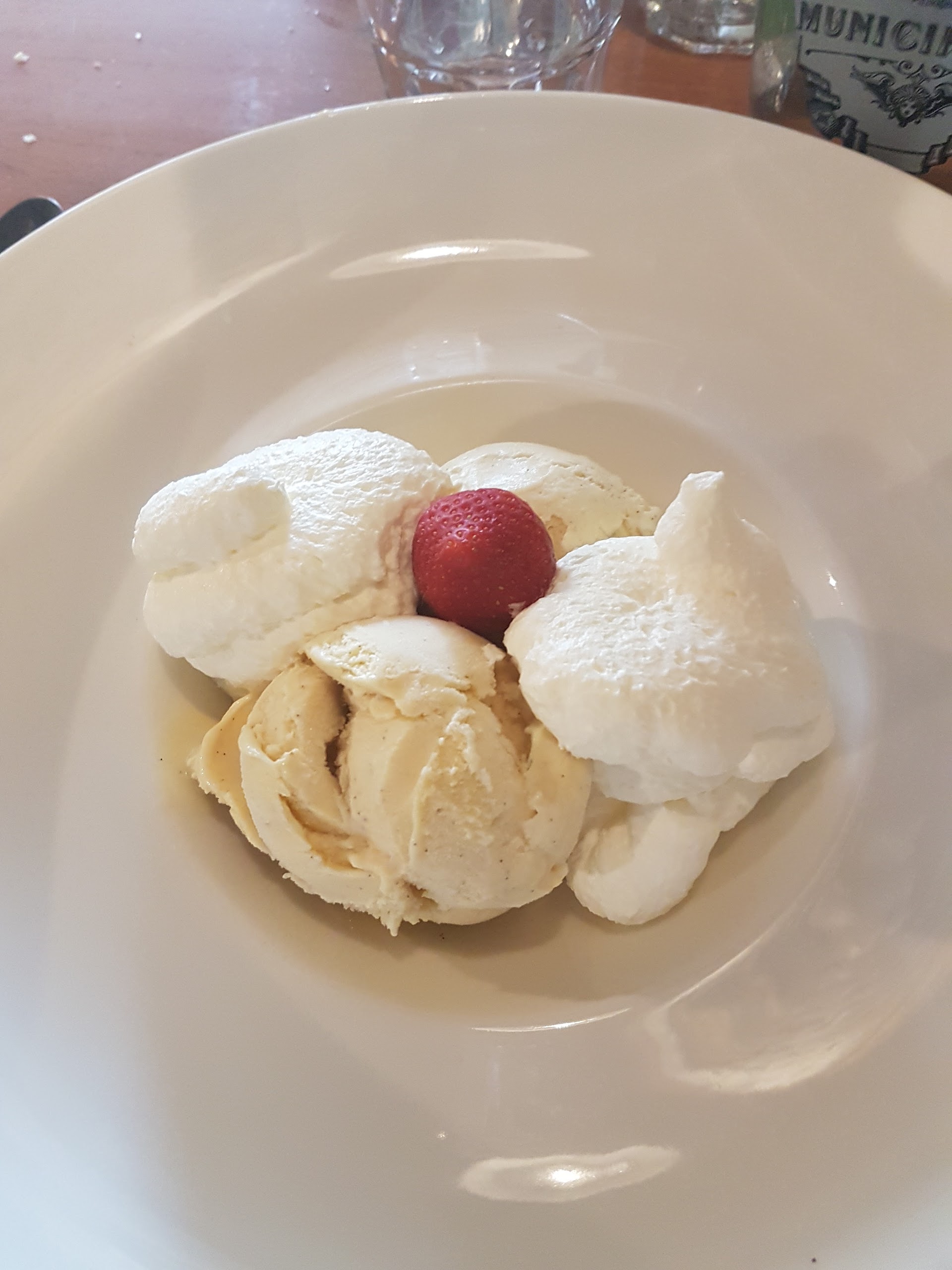 J'ai pris une salade en plat et des fraises en dessert. Plat bon, par contre je ne m'attendais pas à ça pour les fraises (pour 9€ un beau bol de fraises entière avec un pot de sucre en son centre + chantilly à côté) Sauf que j'ai eu des fraises non triées (4 ou 5 qui avait commencé à bien tourner). Je m'attendais pour ce pris là d'avoir des fraises plus fraîche, triées, découpées dans leurs sirop et avec la chantilly directement dessus. N'hésitez pas à améliorer ce dessert pour qu'il ai plus de succès 😉😊 Par contre rien a redire concernant le personnel très souriant et à l'écoute.