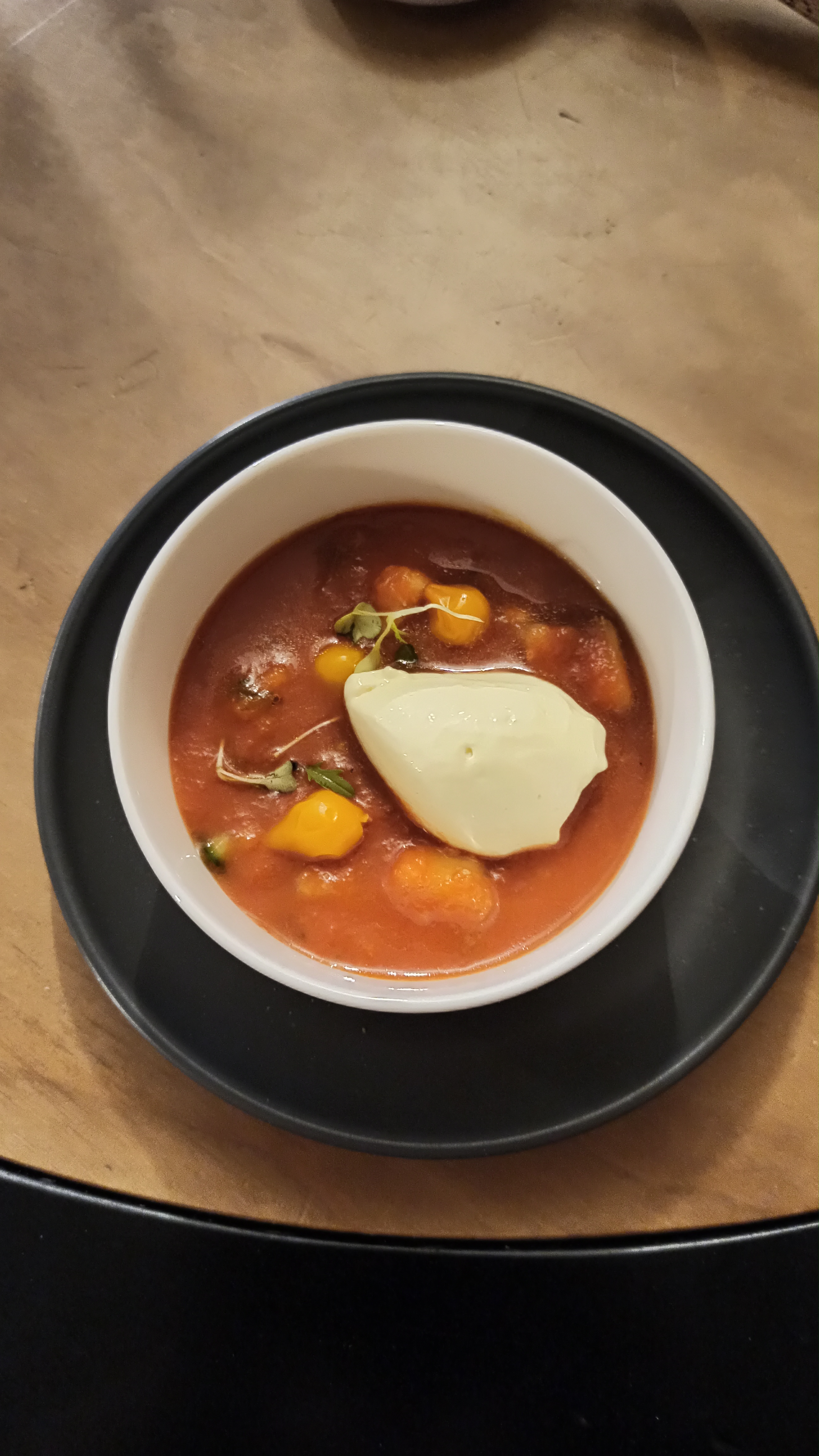 Service impeccable, les deux serveuses étaient agréables, professionnelles et souriantes. Aucune fausse note, dans les plats qui étaient aussi beaux que bons, ou dans le rythme du service. J'apprécie le concept qui oblige les gens à sortir de leur zone de confort et partir à la découverte. De surcroît il y a un jeu sur les textures qui m'a agréablement surpris, tout comme l équipement (assiettes et couverts) Niveau rapport qualité prix, on est sur du gastronomique et il y a pas mal de travail de montage dans les assiettes. Rapport quantité prix, un peu plus mitigé, peut être prendre des assiettes plus petites, mais au moins les assiettes reviennent vides 😅 Par contre gros point noir: le parti pris de s installer à côté d un bar d ambiance et de ne pas laisser au client le choix de profiter de son repas à l'intérieur l'été à coûté une étoile et aurait pu clairement en coûter deux vu le volume sonore.