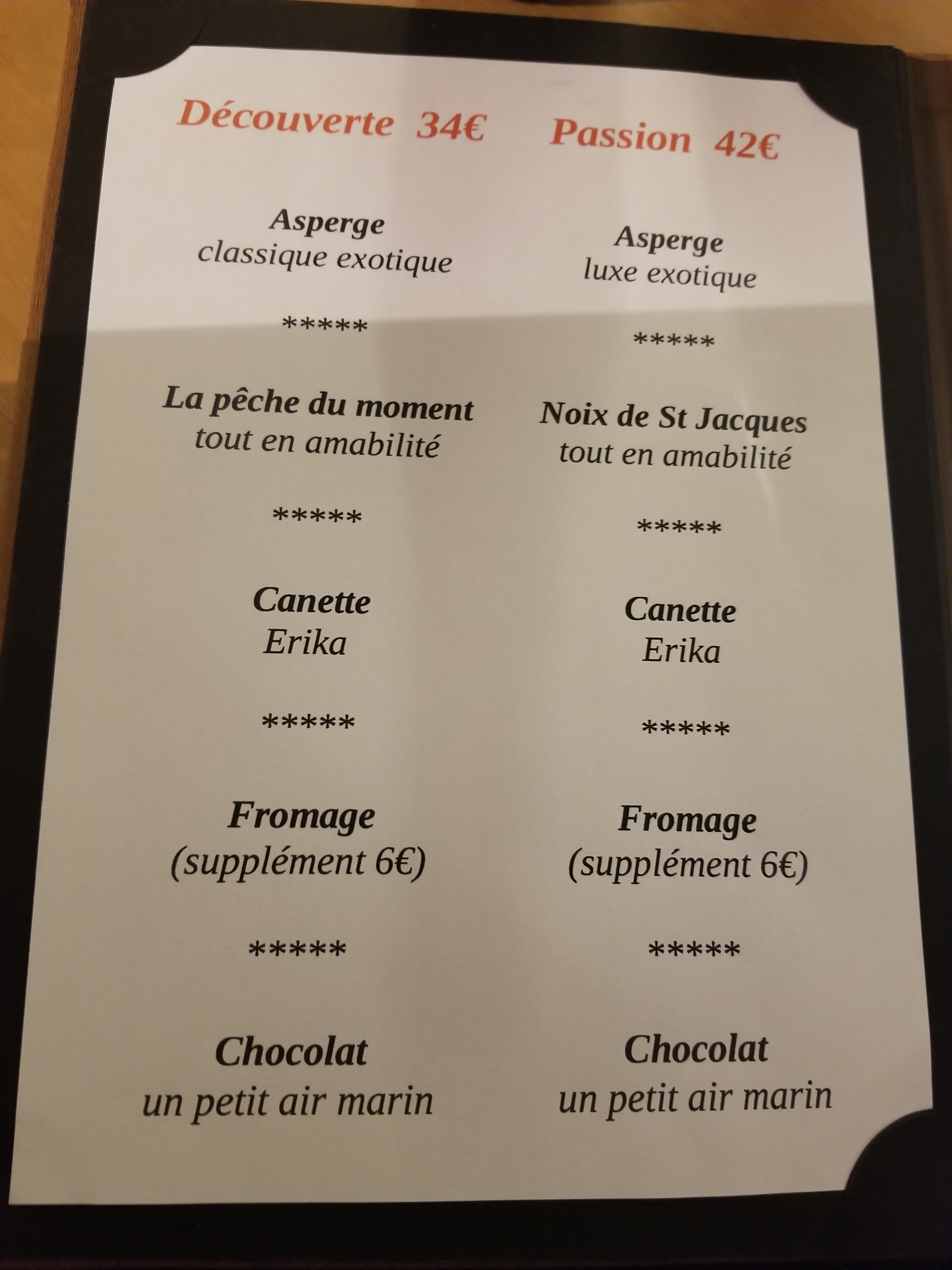 Deux menu vois sont proposer ,pas de carte Choix des produit de qualités ,cuisine raffiné et bonne Prix plus ou moin correct ,petit bemol apres avoir mangé le menu qui a été un vrai regal a la fin du repas je n'aurais pas dit non a une assiette supplémentaire je m'explique : je pensse que pour ma par les dose etait minime et le restaurant aurais pu se permettre de rajouté un ou deux petit morceau de viande par exemple afin de vraiment avoir une assiette complète. Apres se n'est bien évidement que mon avis Une expérience gustative que je recommande grandement
