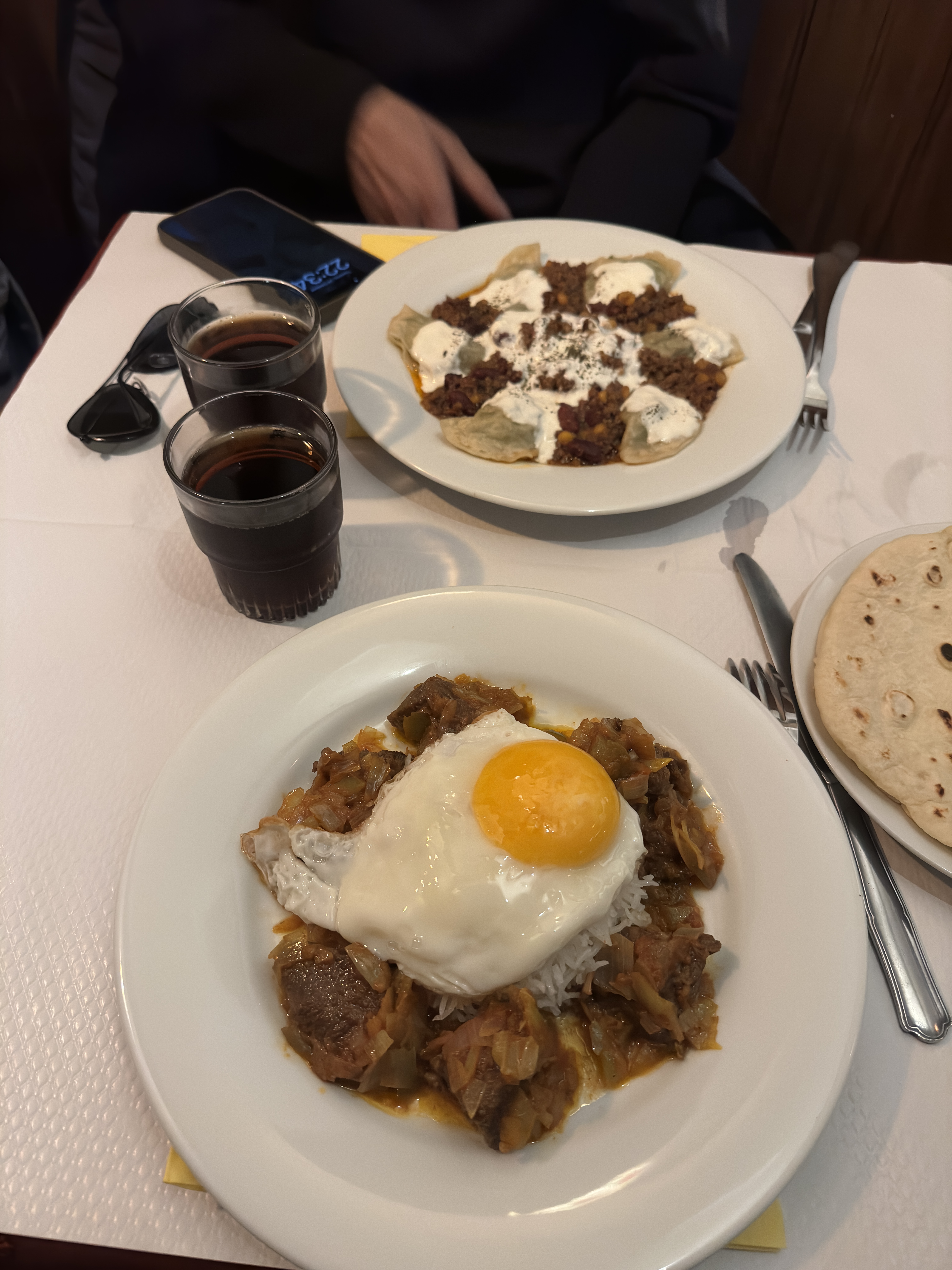 Délicieuse nourriture. Je recommande le Achak (ravioles garnies de poireaux) recouvertes de viande hachée épicée avec des haricots rouges et yaourt .
