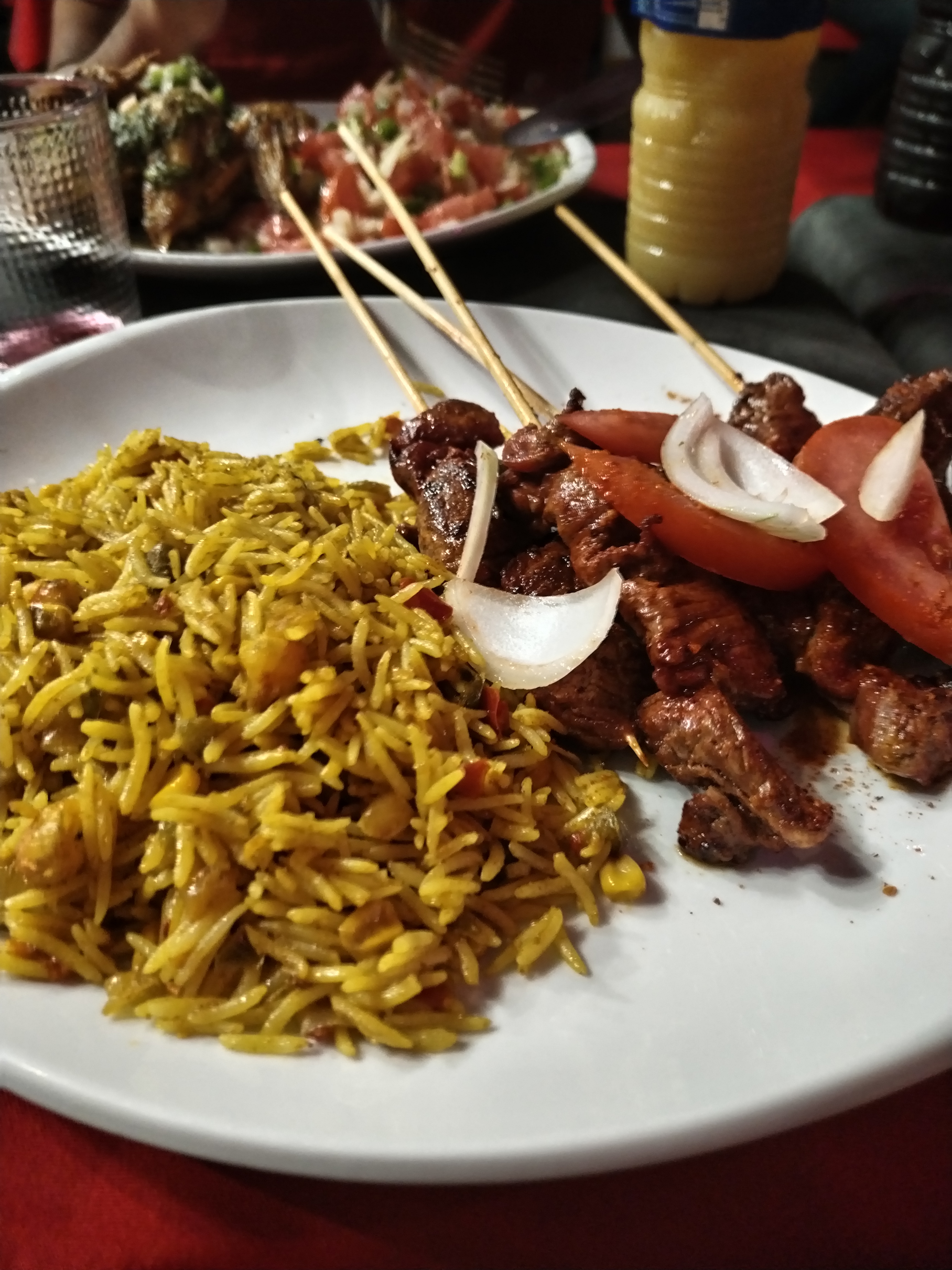 Le repas est très bon. L'attieke et les brochettes sont délicieux. Les prix sont détaillés pour chaque éléments. Y faire attention.