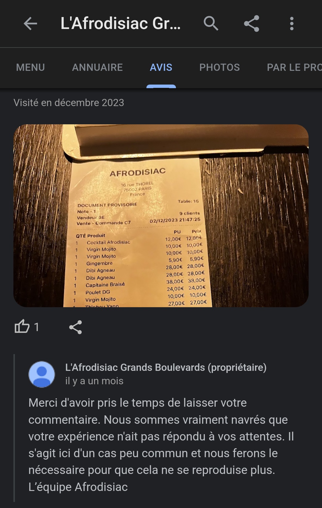 FUIR ABSOLUMENT !! 2H d'attente sous pretexte que les commandes uber sont prioritaires sur le service en salle. Pire encore, les plats arrivent froids et pas cuits. Le ndolai le plus dégueulasse que j'ai mangé, graineux, pas cuit et froid. Pas de bol le serveur ne connaissait pas la carte et etait incapable de reconnaitre si le plat etait bon ou pas ! Pour une addition à 200€ j'appelle sa du vol. PS: inutile de répondre à mon avis si c'est pour avoir une reponse copier/coller de tout vos avis négatifs ( voir photo ci-desous) Bonne continuation.
