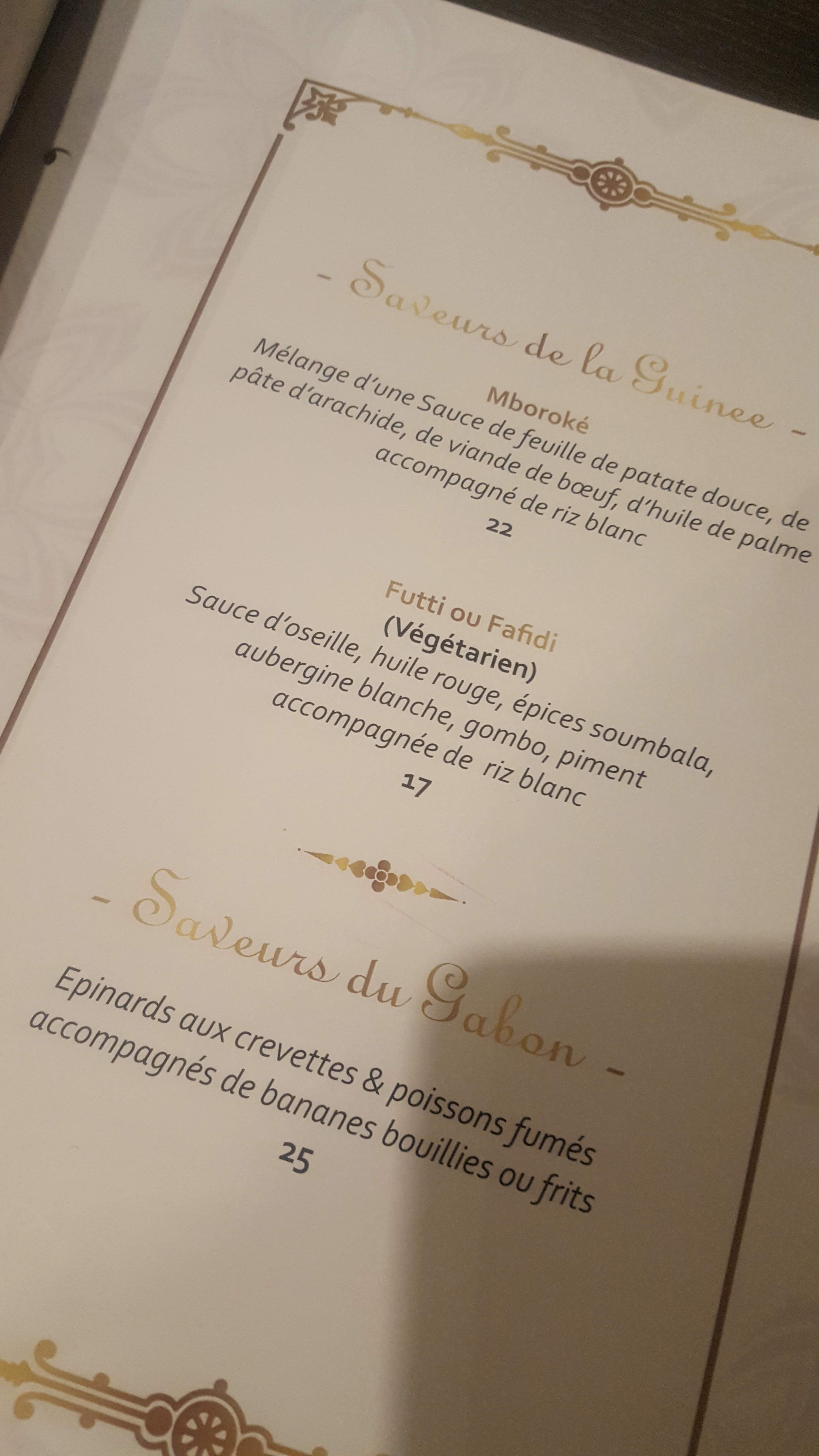 Agreablement surprise par ce restaurant a la carte varie.C est un voyage culinaire de l Afrique de l ouest a l Afrique centrale.Les plats etaient copieux gouteux et les cocktails originaux.Merci pour le service je recommande sans hesiter.
