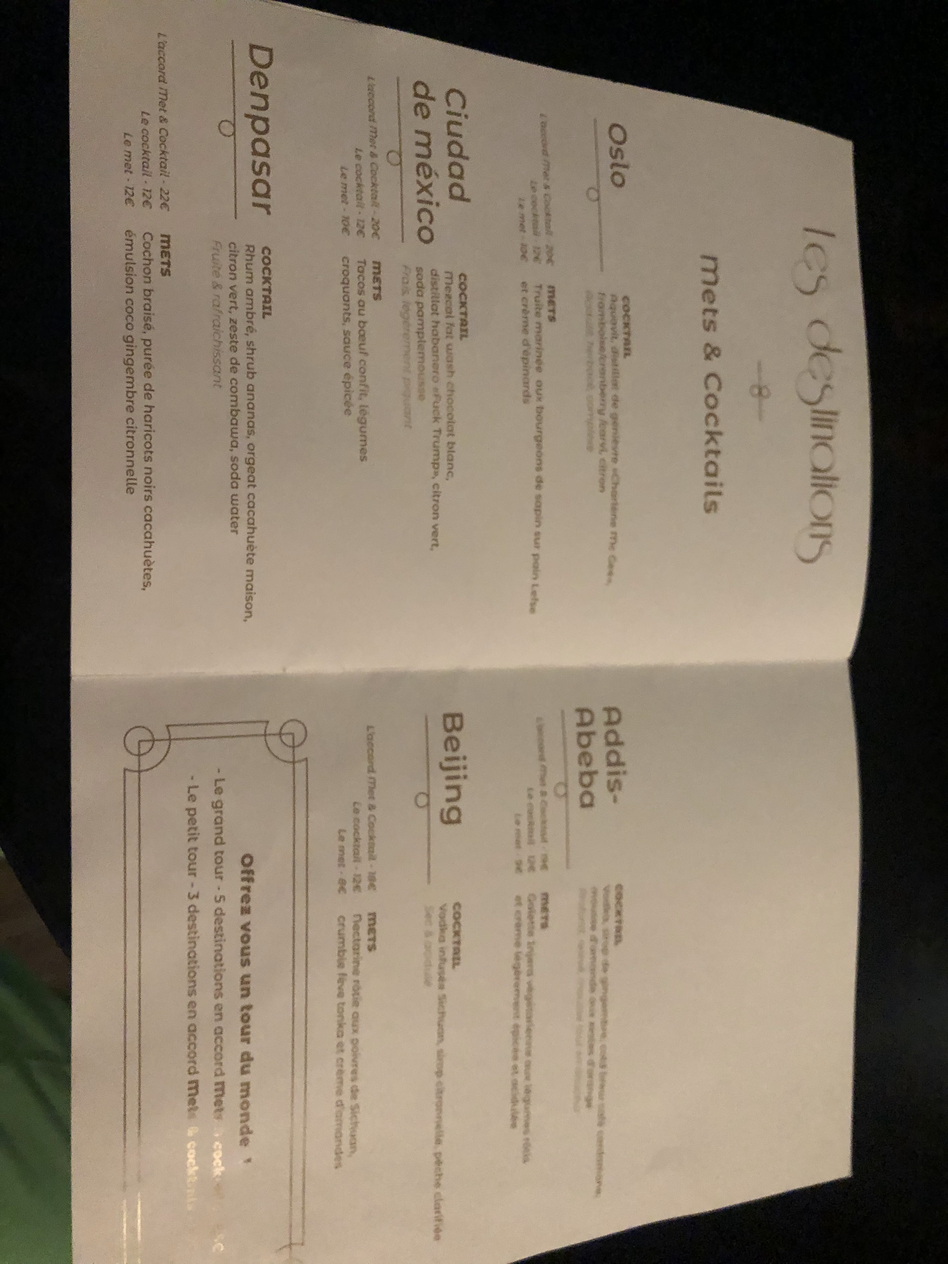 Le concept est sympa mais attention il ne s'agit pas du tout d'un restaurant mais d'un bar à cocktail assez feutré qui propose des tapas ( ou des plats minuscules selon le point de vue). J'ai pris l'Irlande qui contenait de l'agneau; le plat était très bon mais très petit-- par contre le dessert Côte d'Ivoire est de taille normale et assez bon (sans plus) mais coûte 11 €, ce qui est extrêmement cher pour ce que c'est. Chaque cocktail coûte une dizaine d'euros donc j'ai l'impression qu'on paye aussi le cadre et le concept... réservation obligatoire car ils enchaînent les créneaux de 2h. Le problème principal, c'est qu'en sortant j'avais encore faim et j'ai dû faire un kébab donc pas vraiment pour les gros mangeurs. Plutôt pour les gens raffinés qui cherchent l'originalité