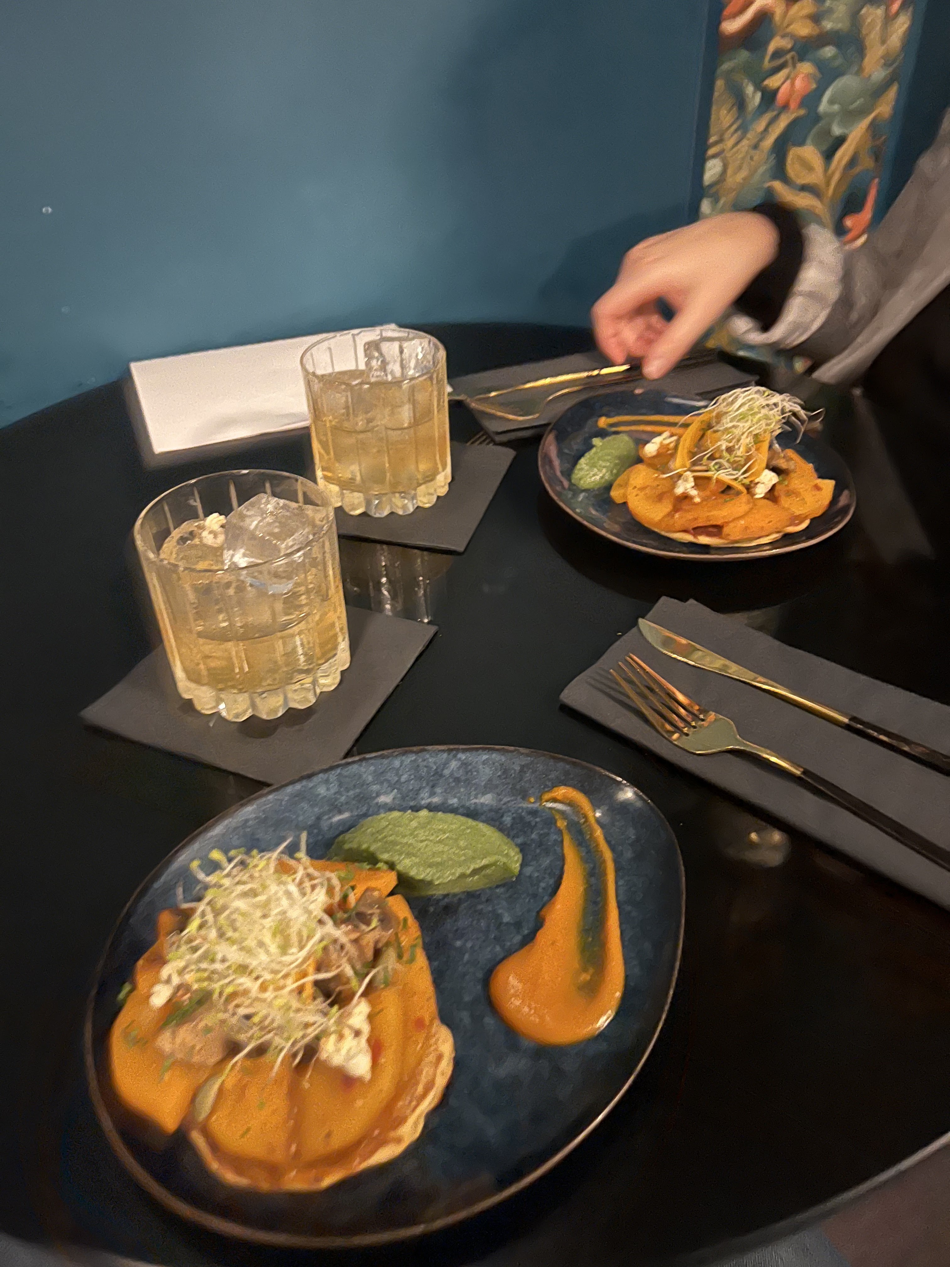 Concept original, c'est un lieu atypique avec une jolie décoration. Malheureusement l'intérieur est très petit, les tables sont collées, c'est donc très bruyant.. La lumière tamisée est sympa mais nous a légèrement endormi. Les cocktails et les plats sont vraiment très très bons, rien à redire là-dessus. En revanche la quantité dans les plats laisse un peu à désirer, nous avons du passer au mcdo juste après..
