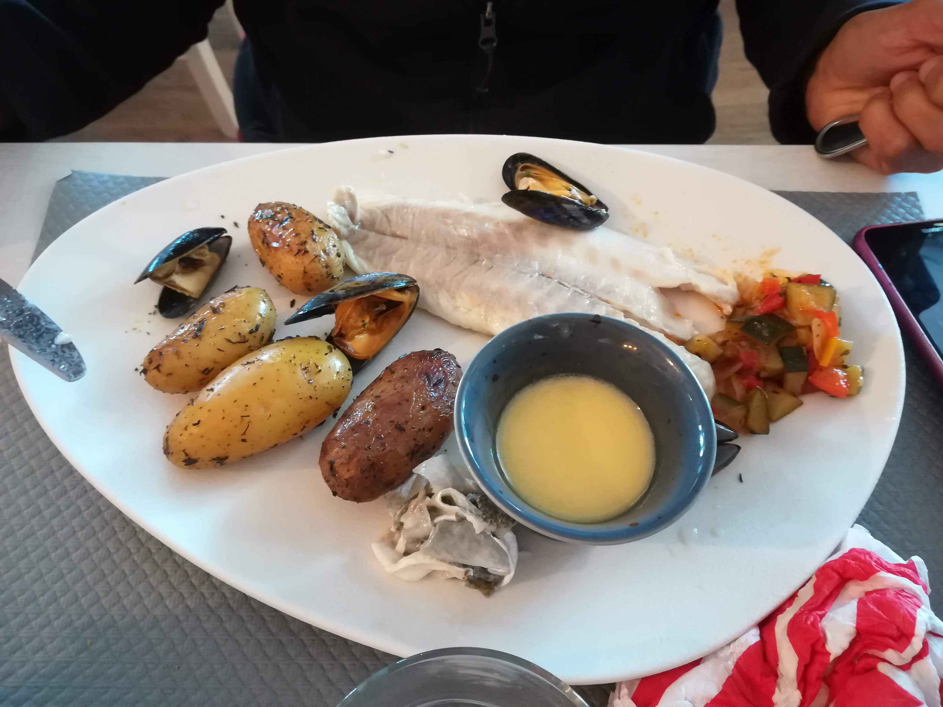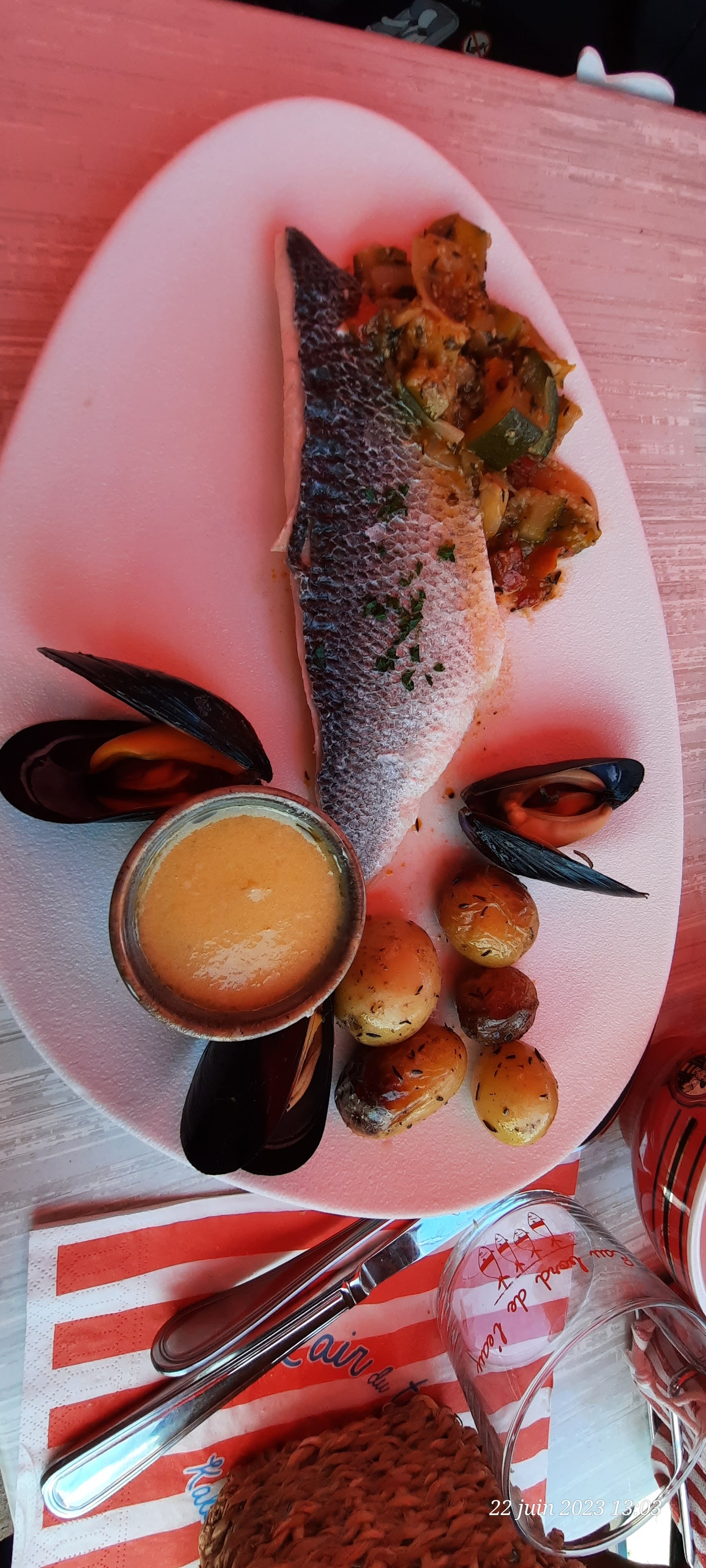 Très bon poisson. Accompagnement trop petit. 4 pommes de terre et 4 moules. Je commande le poisson c'est pas pour me chopper des moules! Si mon avis et mes photos vous ont aidés, merci de cliquer sur le pouce 👍