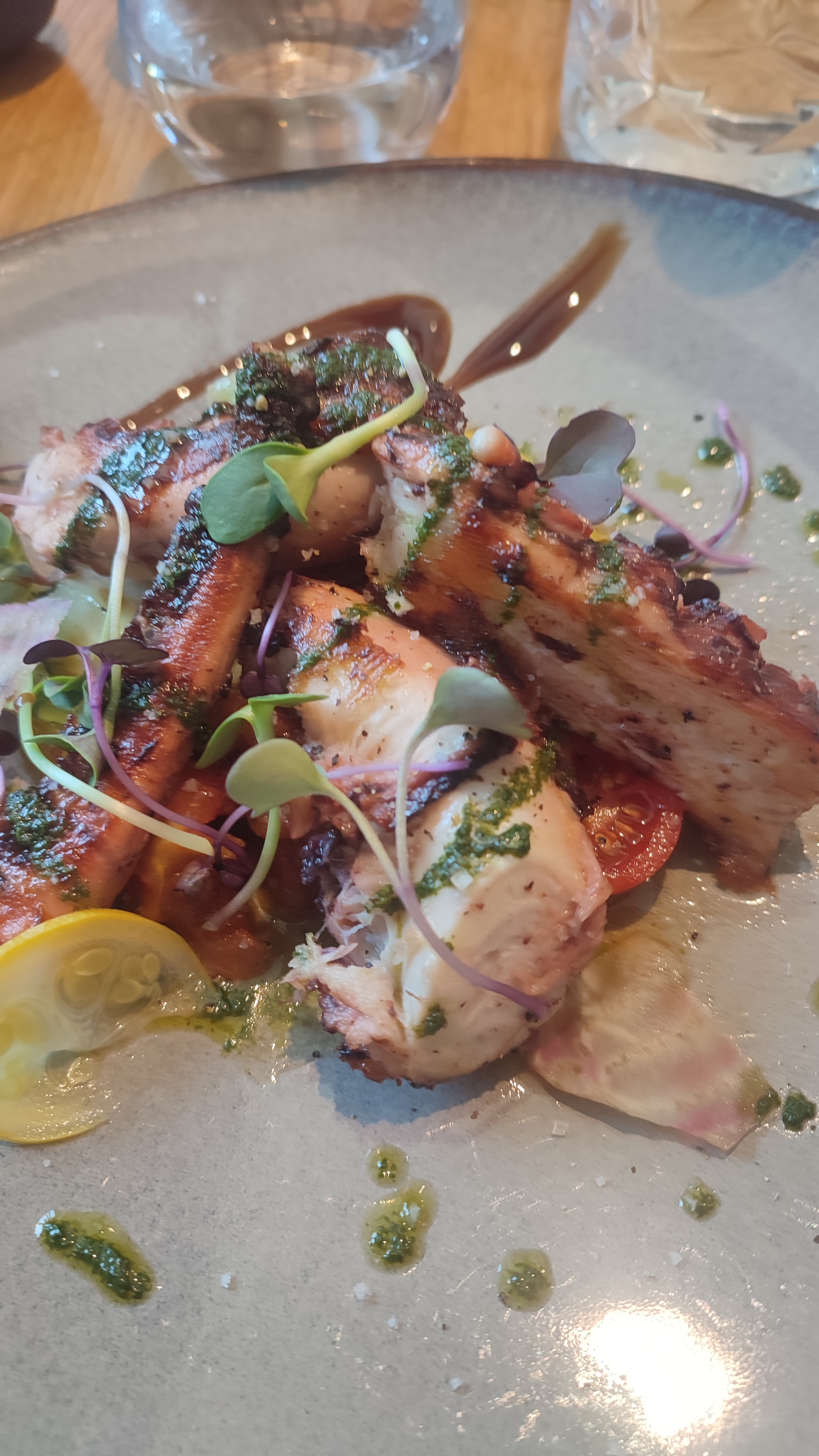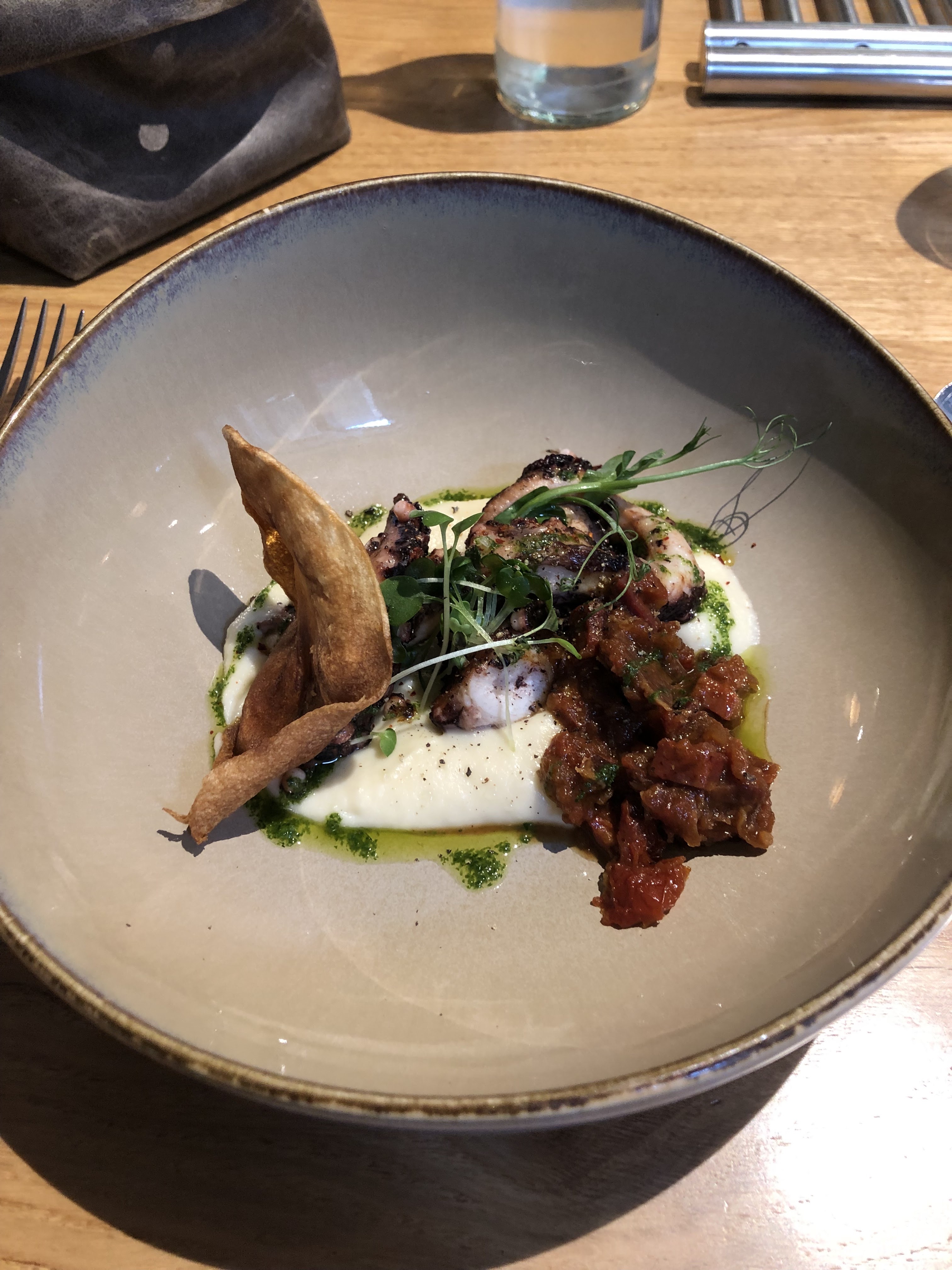 j'ai pris une entrée en format plat.. j'ai cru qu'il se sont trompé en me l'amènent.. 31e .. 1 verre et un plat de la taille du entrée, poulpe trop cuit .. Le mélange était sympathique mais bon .. pour le prix on peu faire mieux .. soyons honnête.