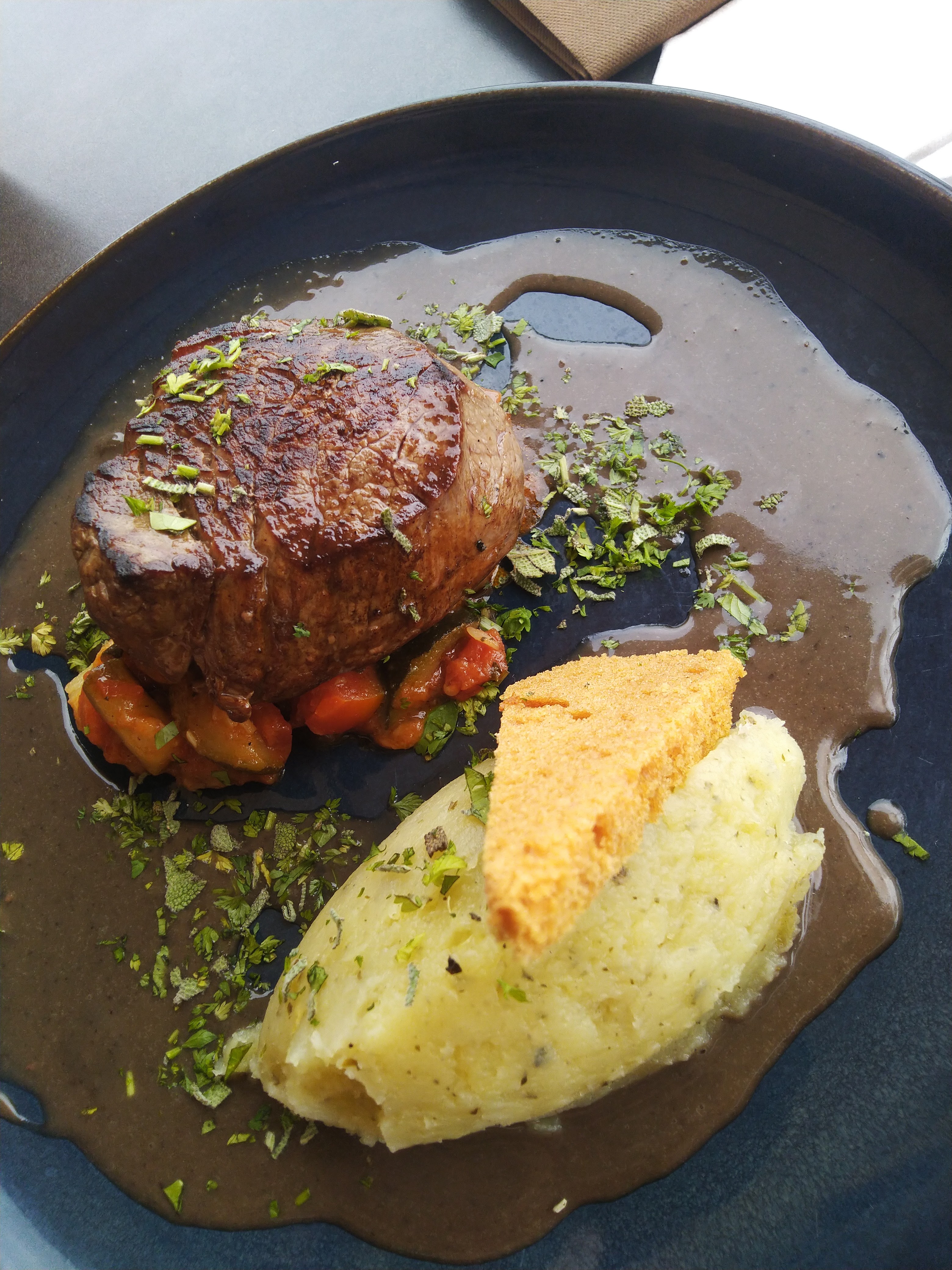 Restaurant avec vue panoramique, aux mets goûtus, bien cuisinés et proportionnés, au personnel accueillant et au service impeccable. Merci pour cette expérience délicieuse ! En photos : le thon grillé façon Rossini, l'entrecôte maturée et la tartelette citron/framboise.