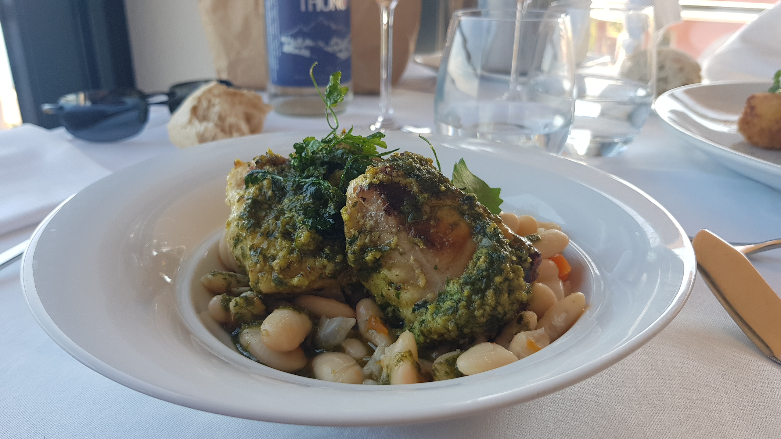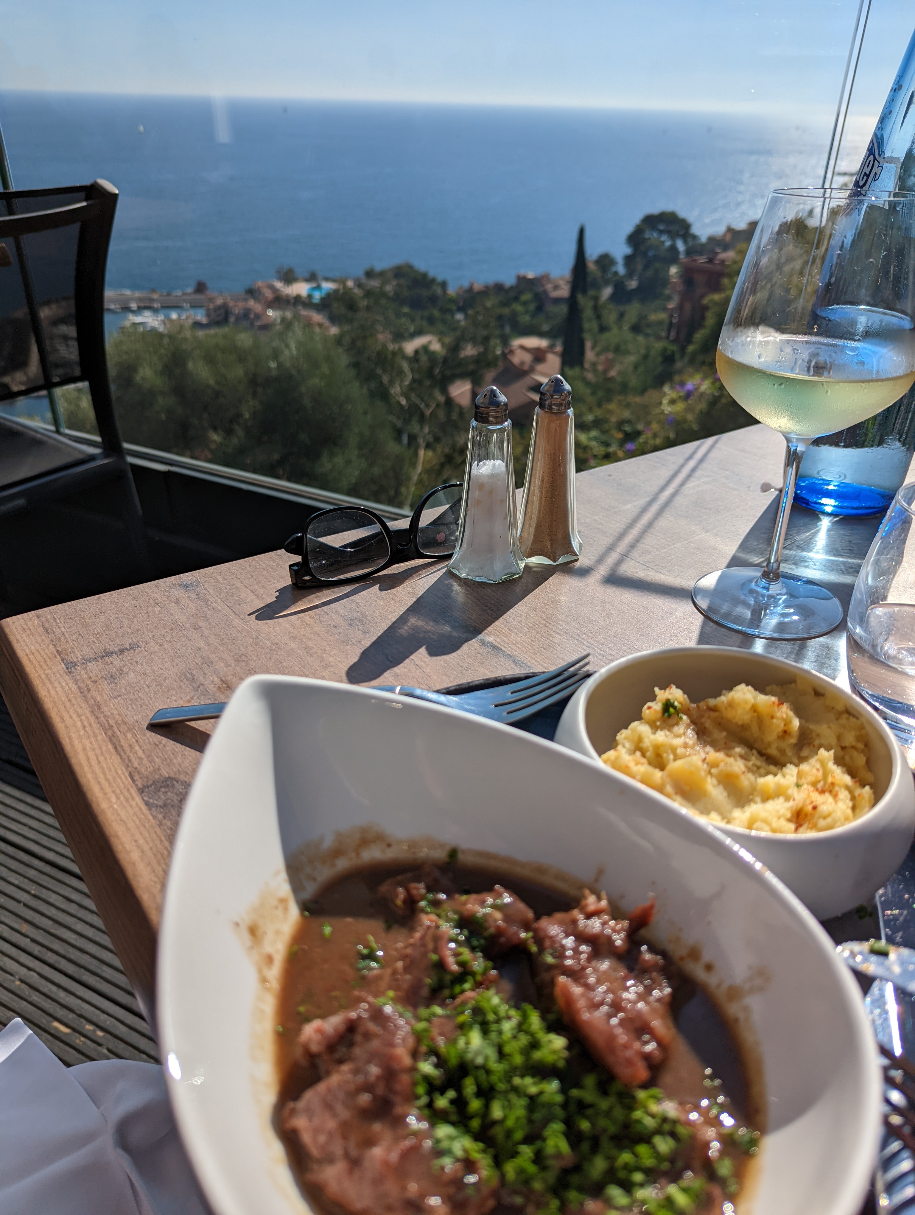 Vue sublime, mais carte limitée, thon rossini finalement un peu fade, route bruyante omniprésente.