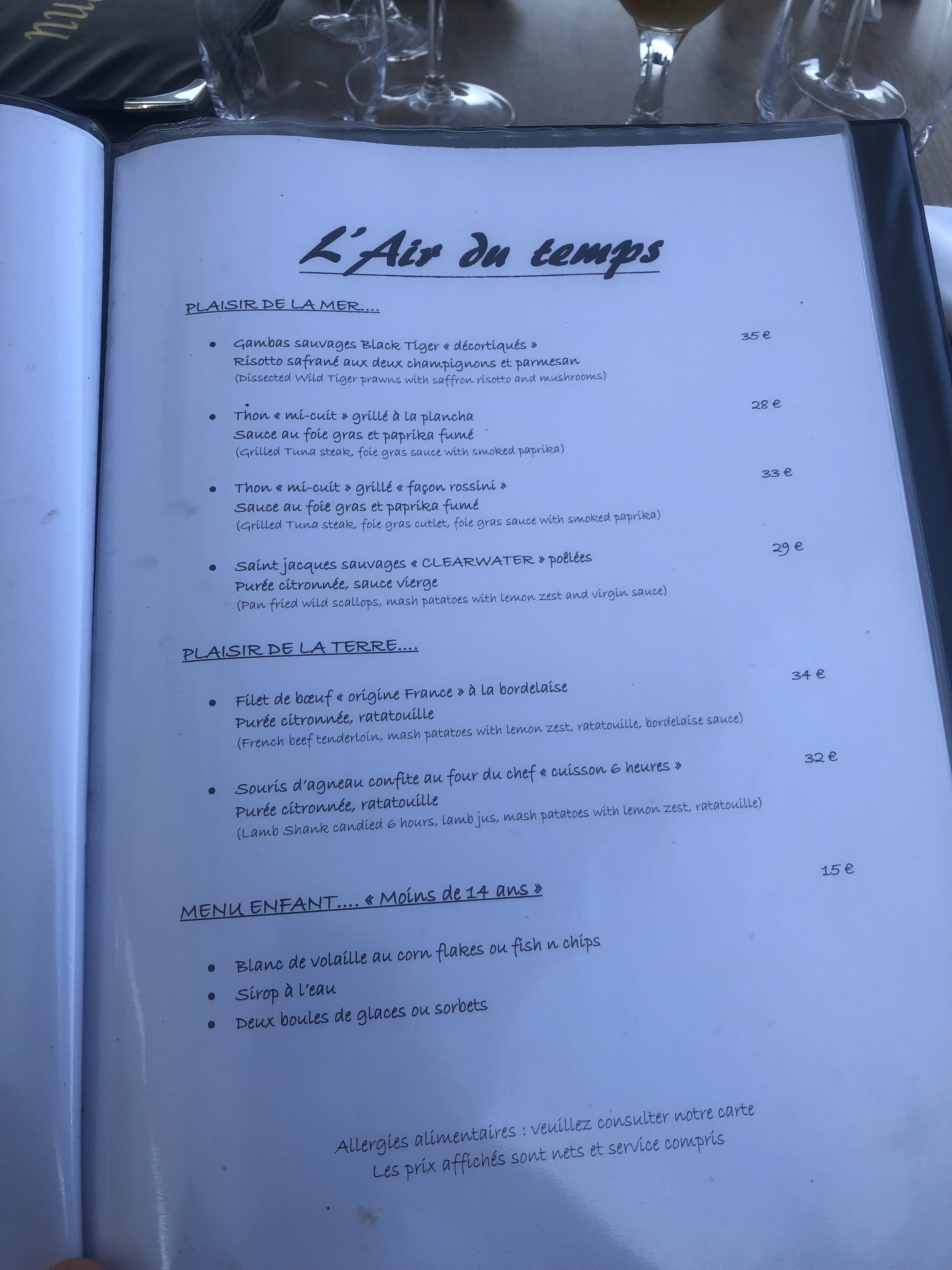 L’air du temps est un restaurant qui nous a attiré pour son cadre (vu panoramique sur la Méditerranée). La carte nous a tenté, cependant l’attente était longue… de plus, certains plats sont arrivés froid ou beaucoup trop salé… Desserts sympas, mais rien d’exceptionnel…
