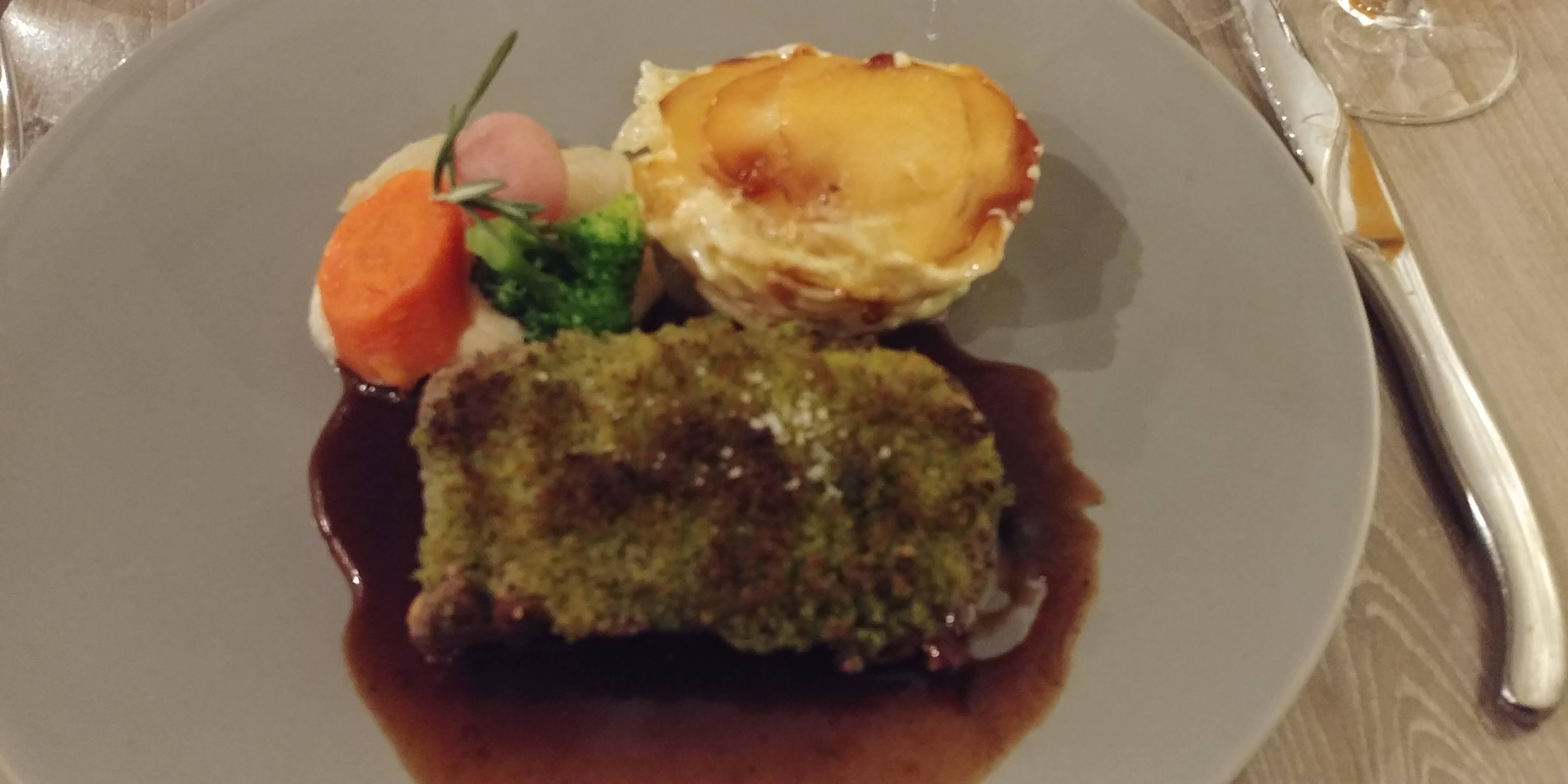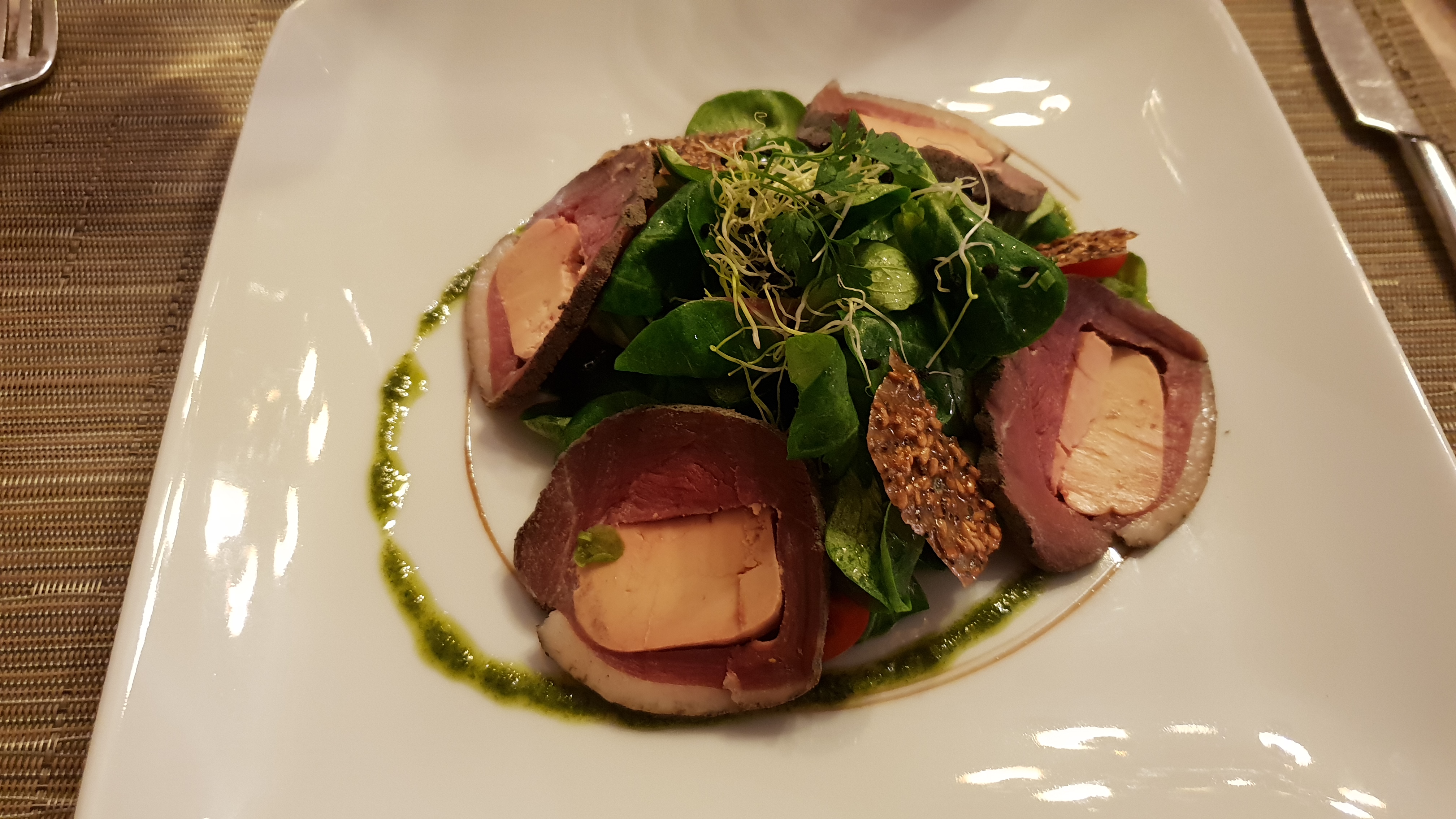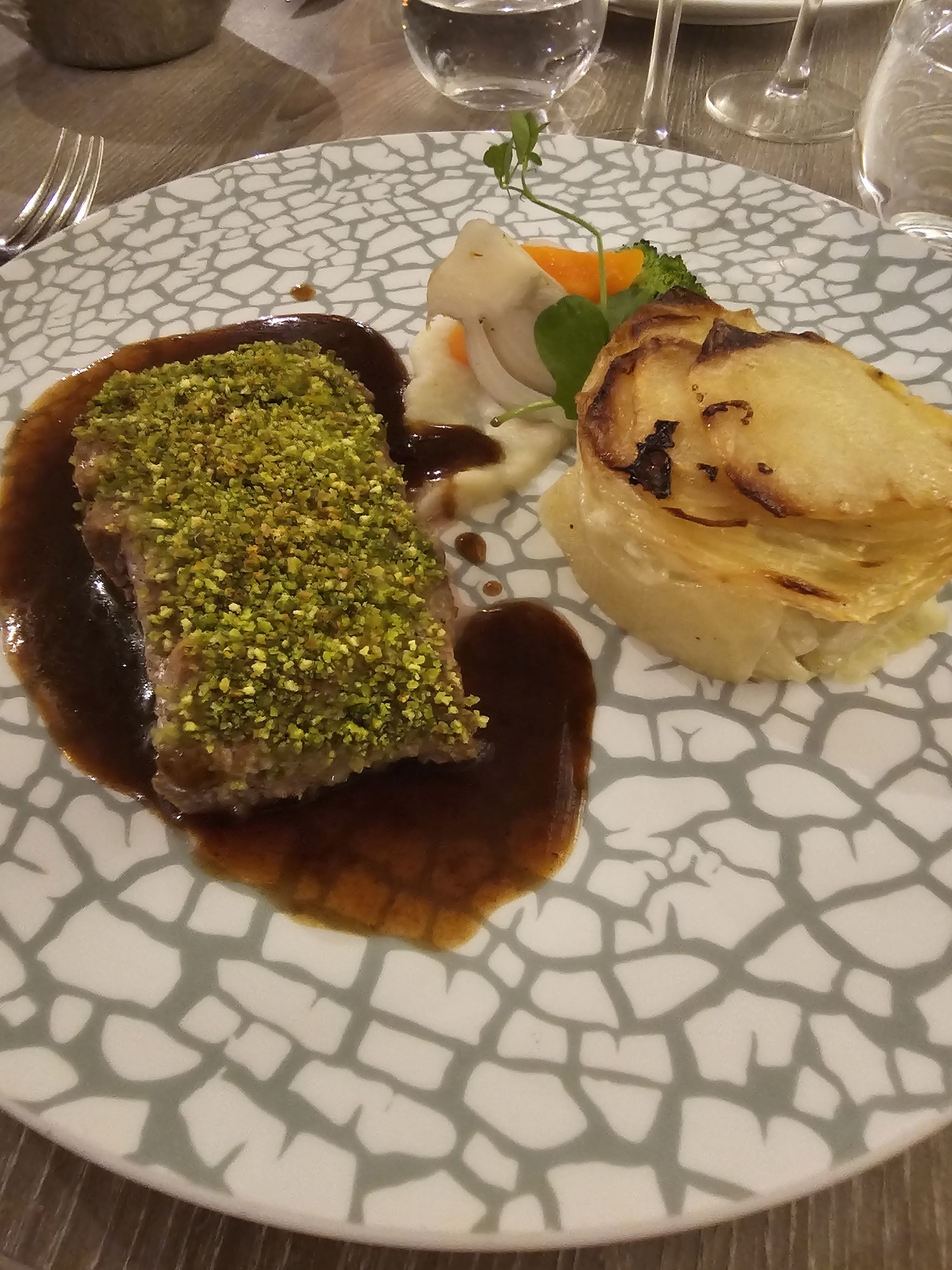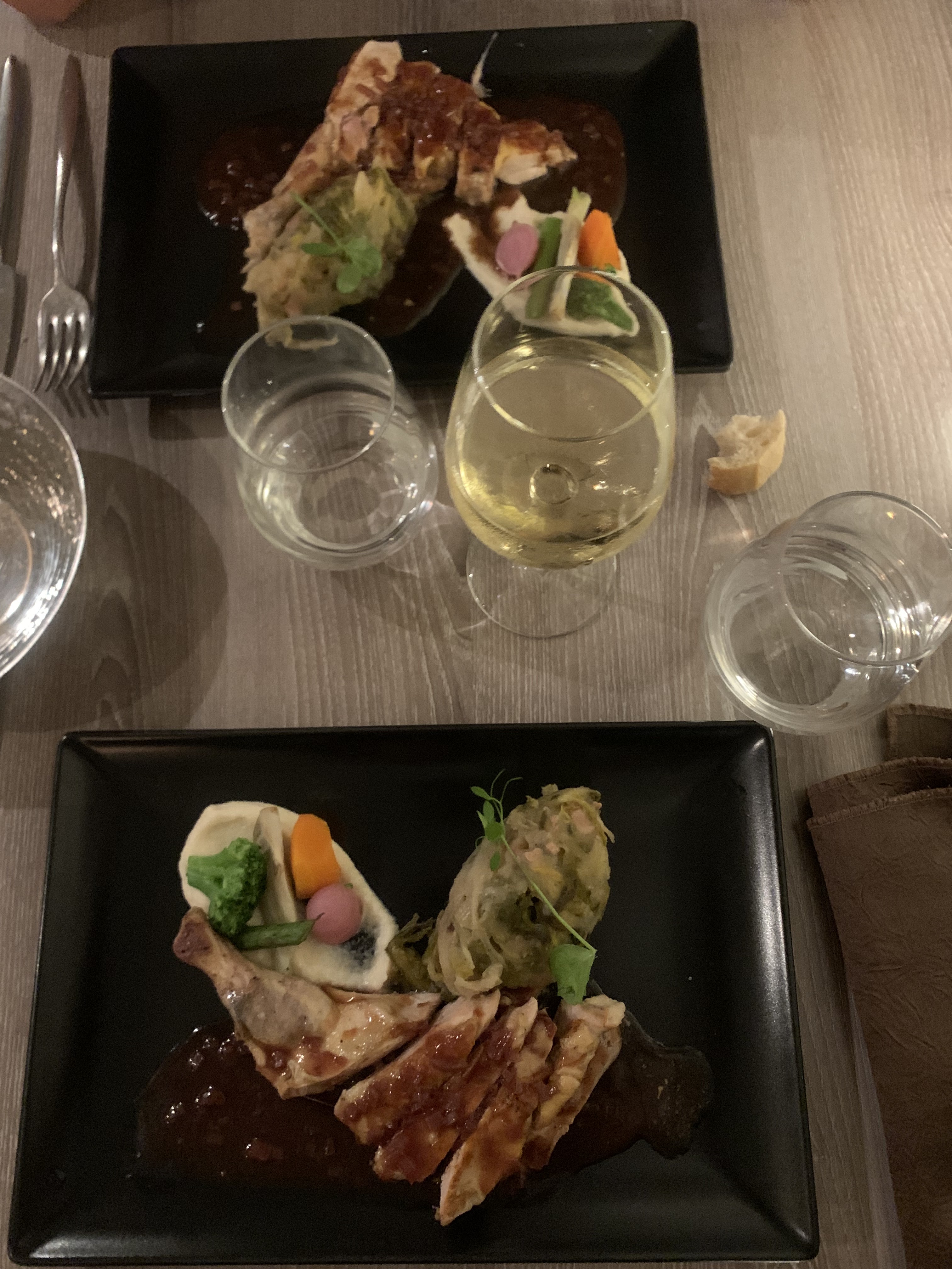 Je ne me souviens pas de l’entrée, Le plat était basique, pas terrible Le dessert était beaucoup trop sucré Le verre de vin n’avait rien d’exceptionnel Je suis vraiment déçu , et c’est chère !