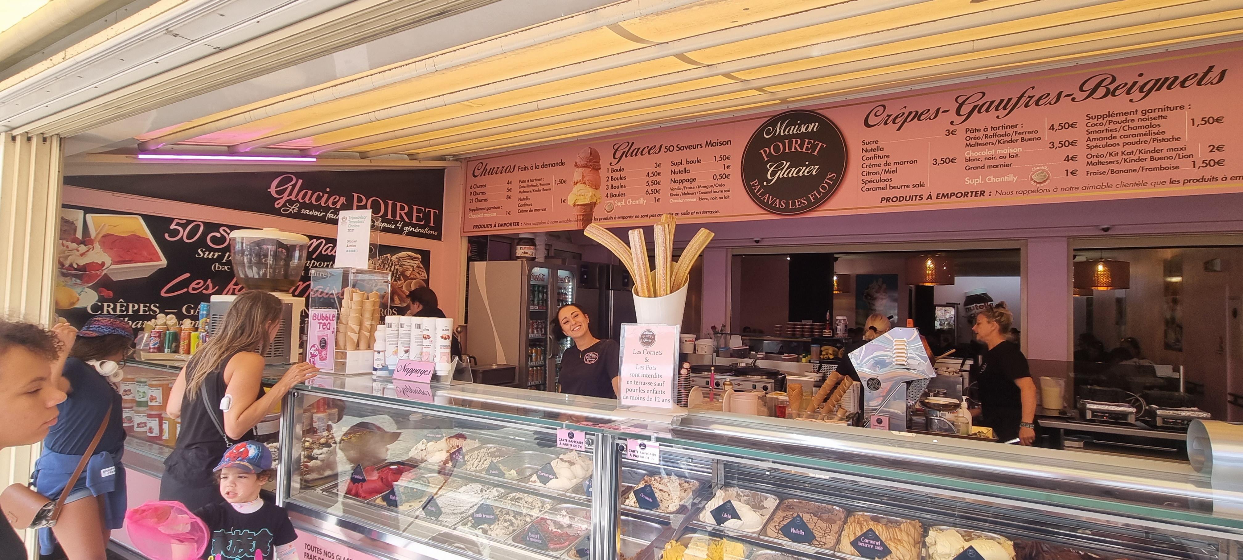 Très beau glacier nous avons commander glaces churros et beignet . Glaces c'est de bonnes glace churros sont bon mais alors les beignet je déconseille tout sec et pas aérer le vendeur les a couper en deux et passer au micro-ondes.... puis mit du Nutella nous ne les avons pas aimer du tout j'ai goûter meilleur au grau du roi dommage