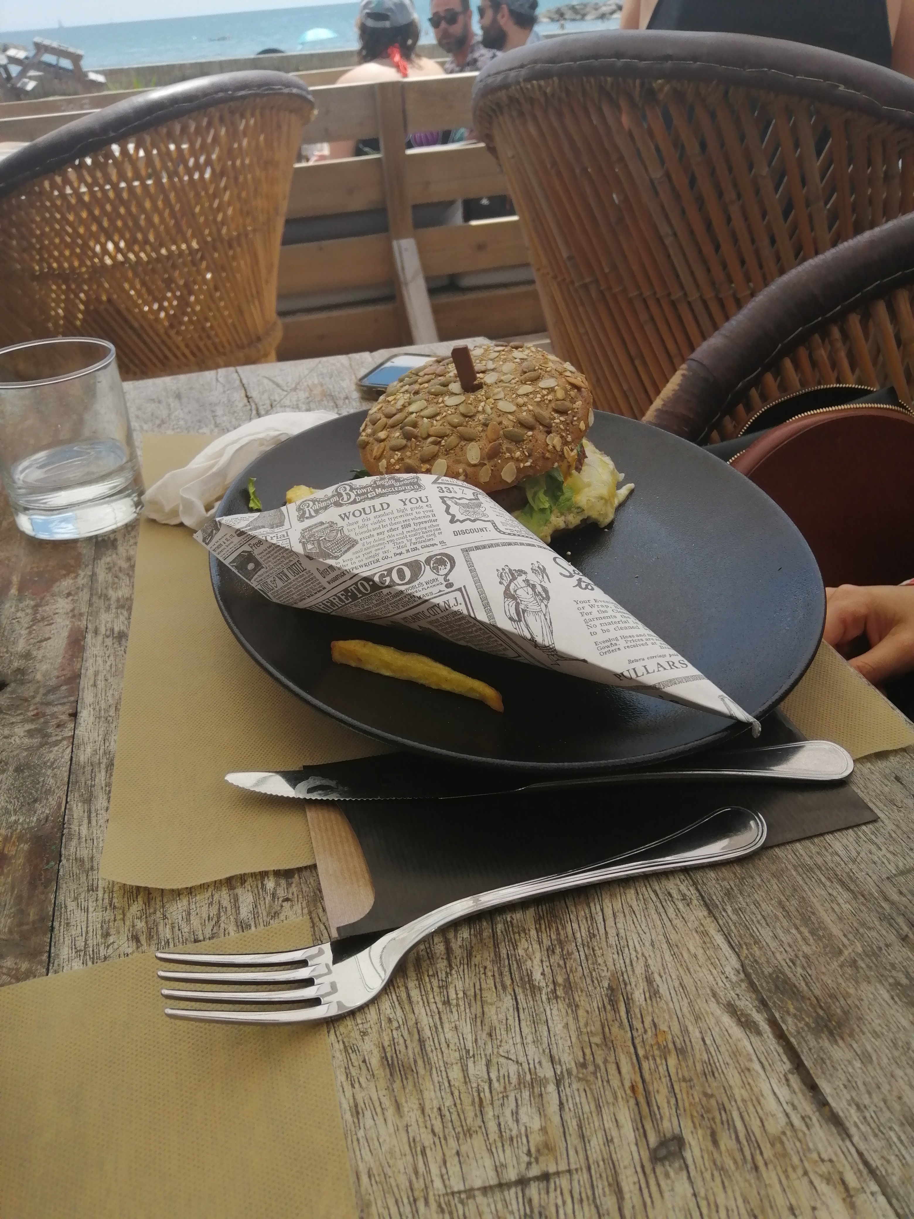 Un délicieux burger / frites suivi d'un café gourmand avec une vue imprenable sur la Méditerranée. ⛱️🌊 Un serveur tip top. 👍