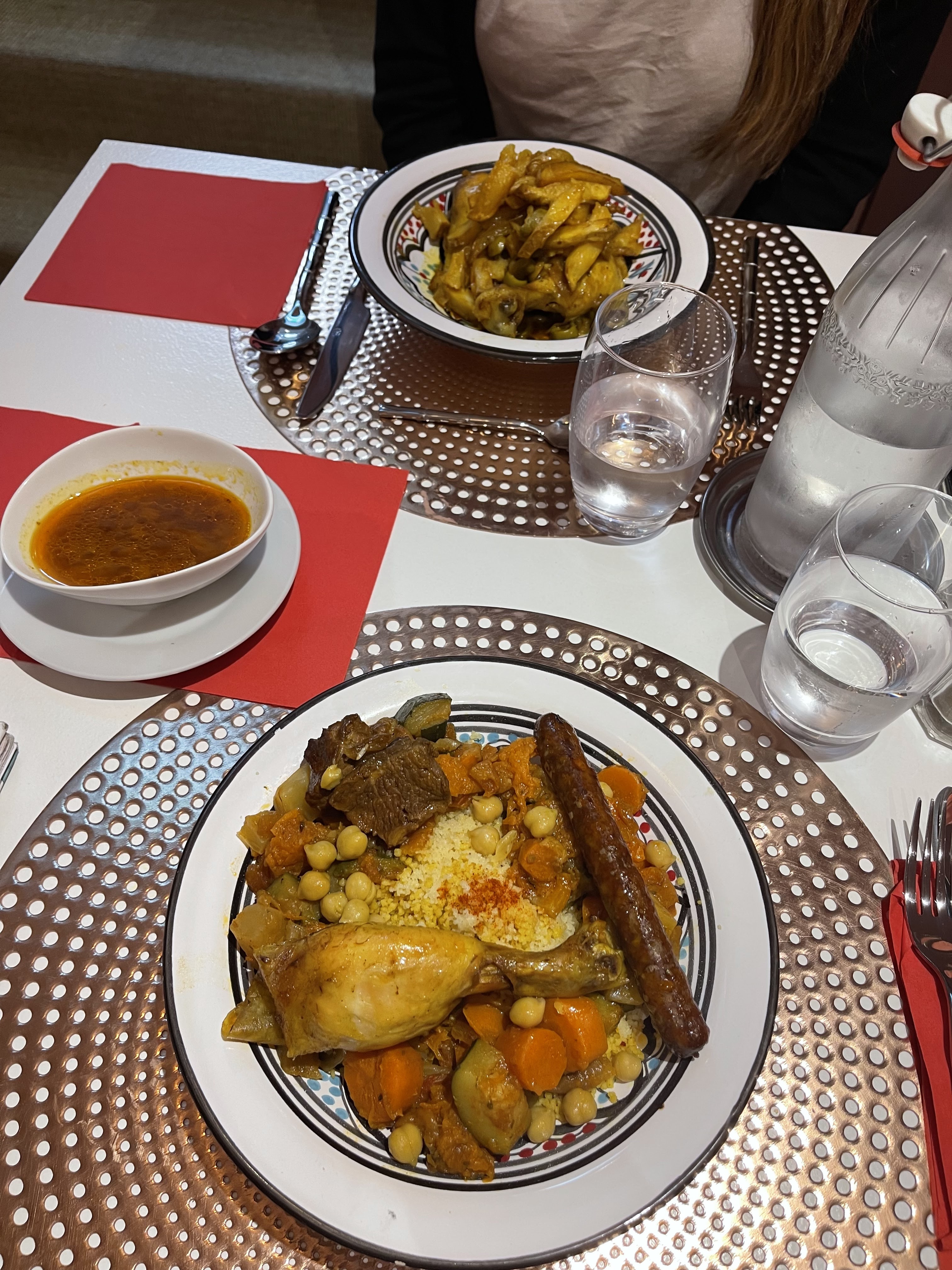 Nous avons mangé un couscous royal super bon. Il manque un peu de légumes avec bouillon. Sinon tout est bien