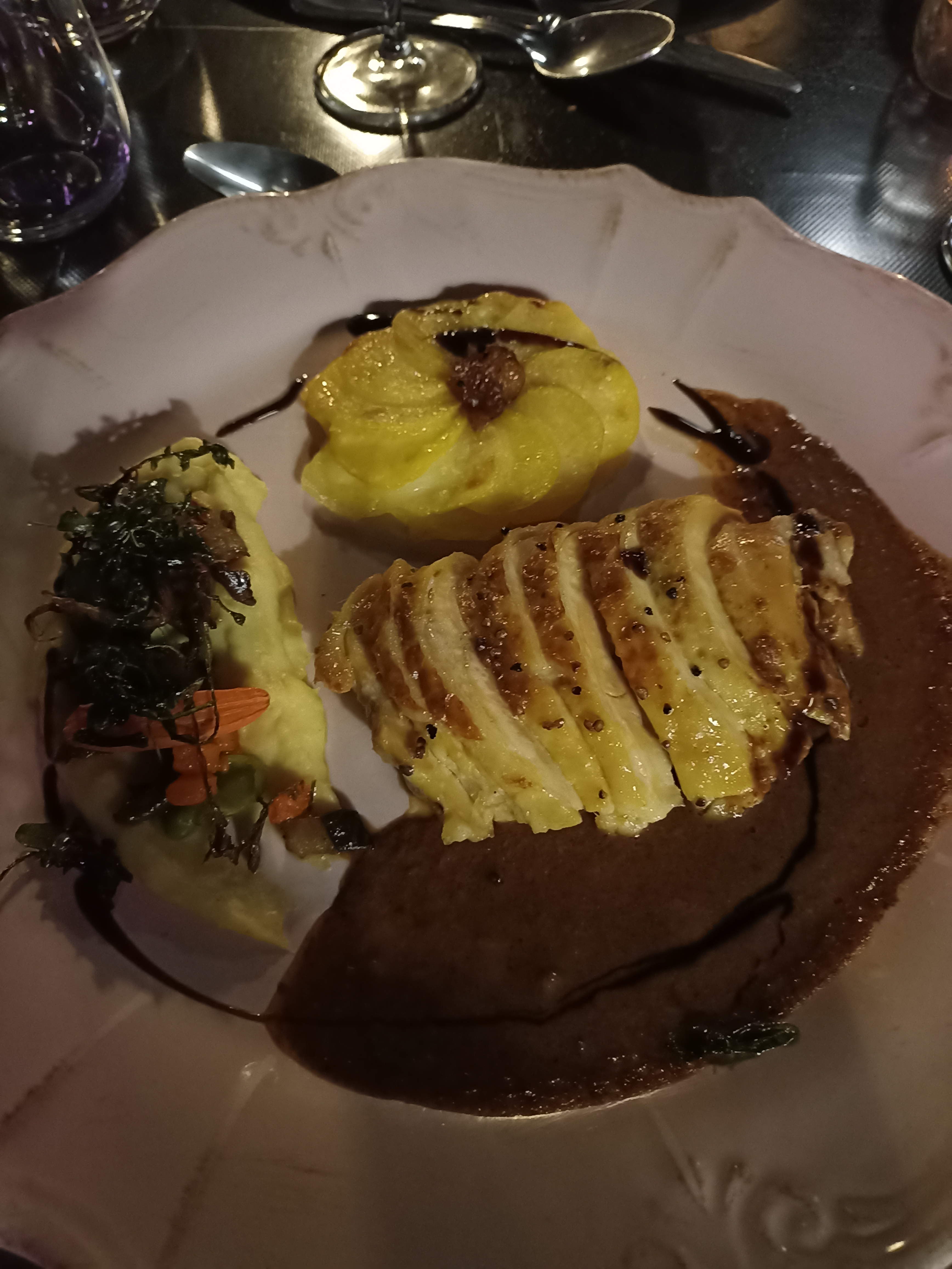 Joli cadre, carte portant un certain attrait. Produits de bonne qualité concernant les légumes, pour le faisan, beaucoup trop cuit et très sec. Assiette de fromages, pas le choix c'est ça et si on n'aime pas... Et pour le dessert, simple et peut être pas maison. Dommage pour 49 euros.