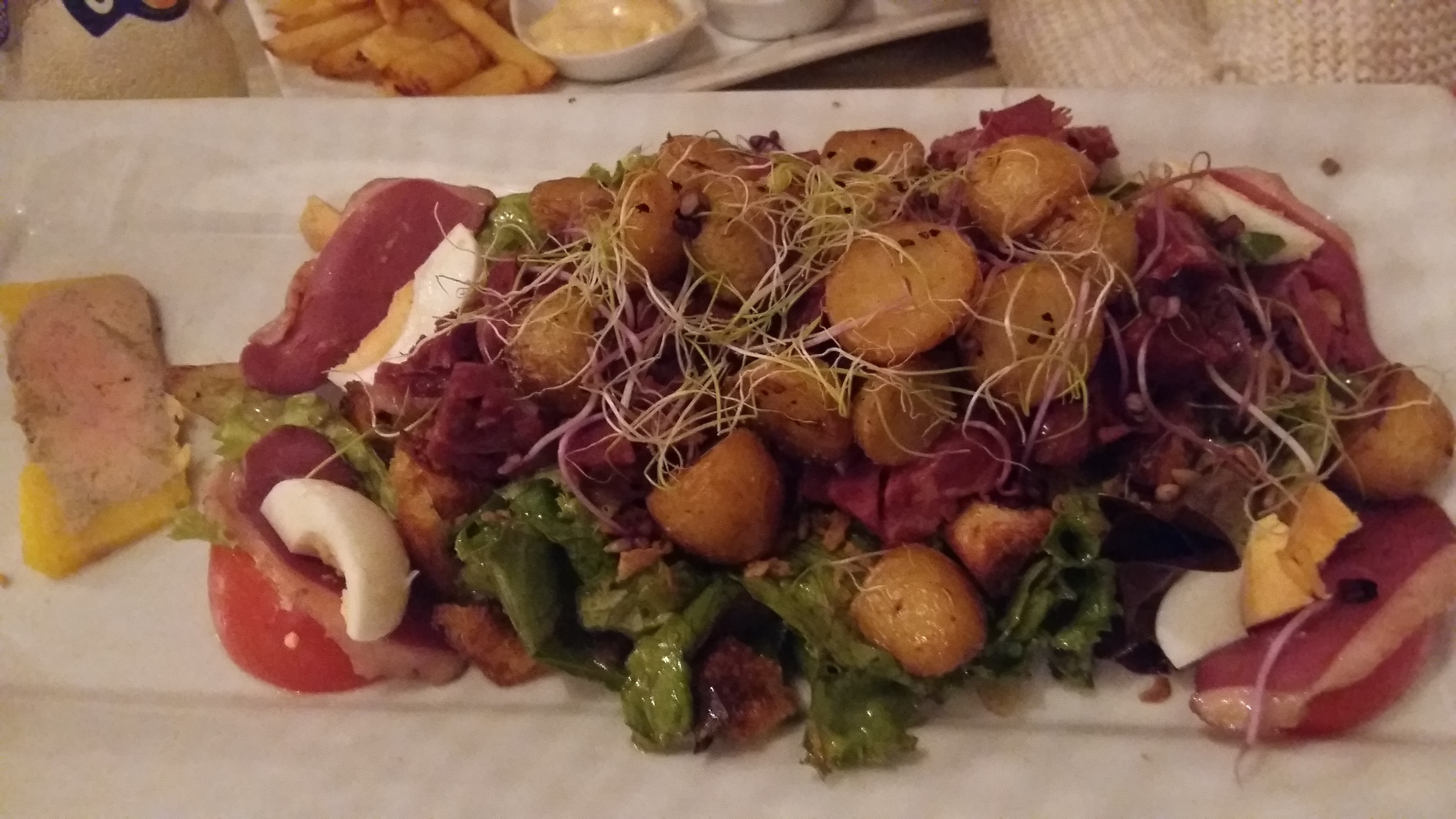 Alors la j ai pas mal de choses à dire en négatif. Déjà on réserve pour 9 ,table non faite. 19 h à table ,prise des aperos 30 minutes plus tard .les aperos arrivent ,la oubli de la moitié de la commande. Encore 20 minutes à attendre. Après prise de commande .une horreur plus d une heure d attente .service déplorable et incompétent. Les grandes salades, sont minuscule pour 14e90 .donc arrivée à 19h ,sorti de table 23h30.une honte pour le restaurateur .on embauche des gens avec des compétences. En plus je suis du métier.