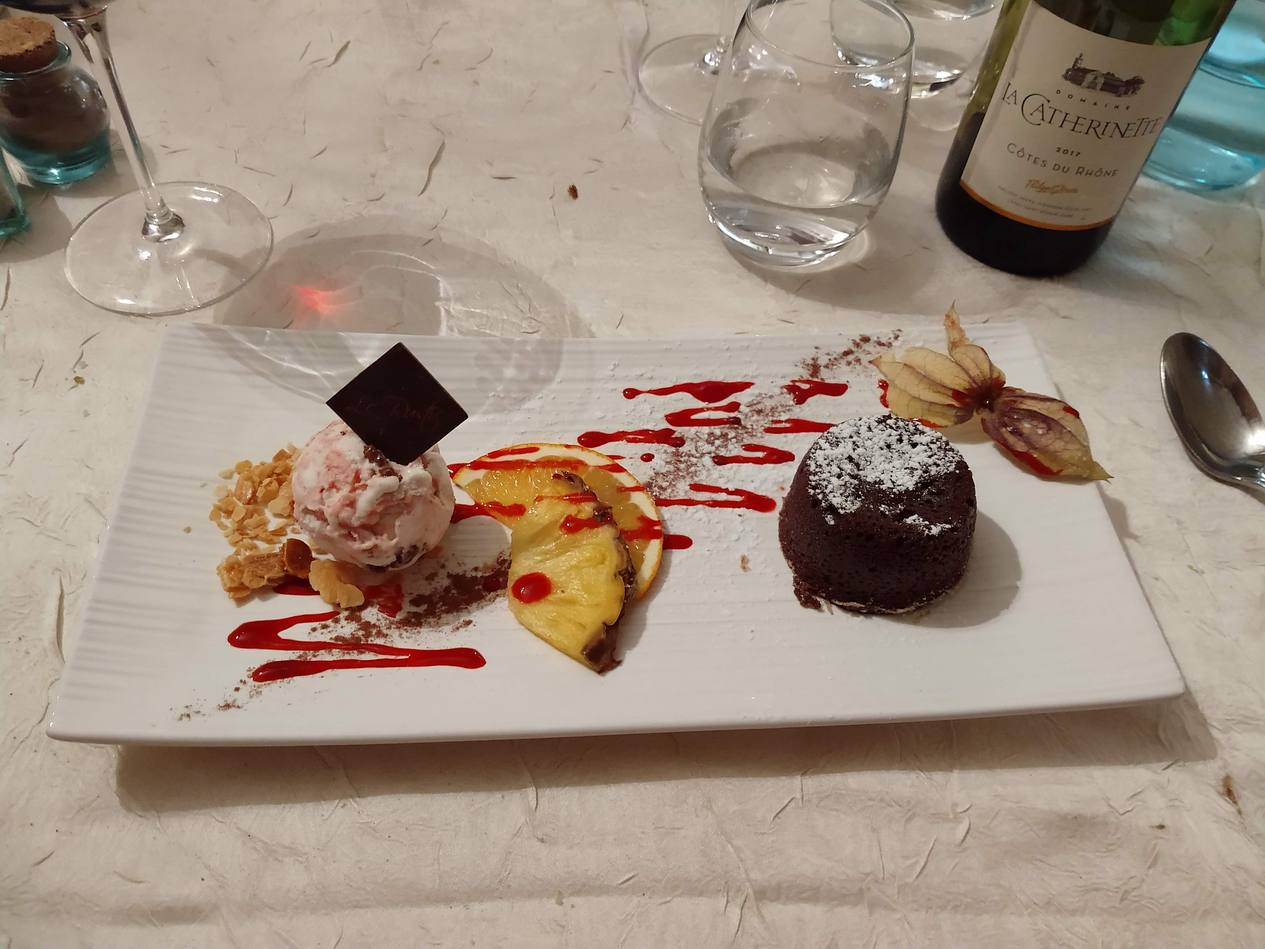Un excellent moment dans la salle intérieur joliment décoré, repas délicieux, raffiné et copieux. 34€ le dimanche midi pour entrée/plat/fromage/dessert. Thon mi-cuit, filet mignon, pavlova revisitée… une merveille de la cuisine ! Également une jolie terrasse extérieure à l’étage mais trop chaud pour en profiter. Le soir doit être top. Franchement, on le recommande à nos amis du coin et on y retournera ! Même le village s’est amélioré en quelques années, très agréable de se balader dans ses ruelles de la Drôme provençale.