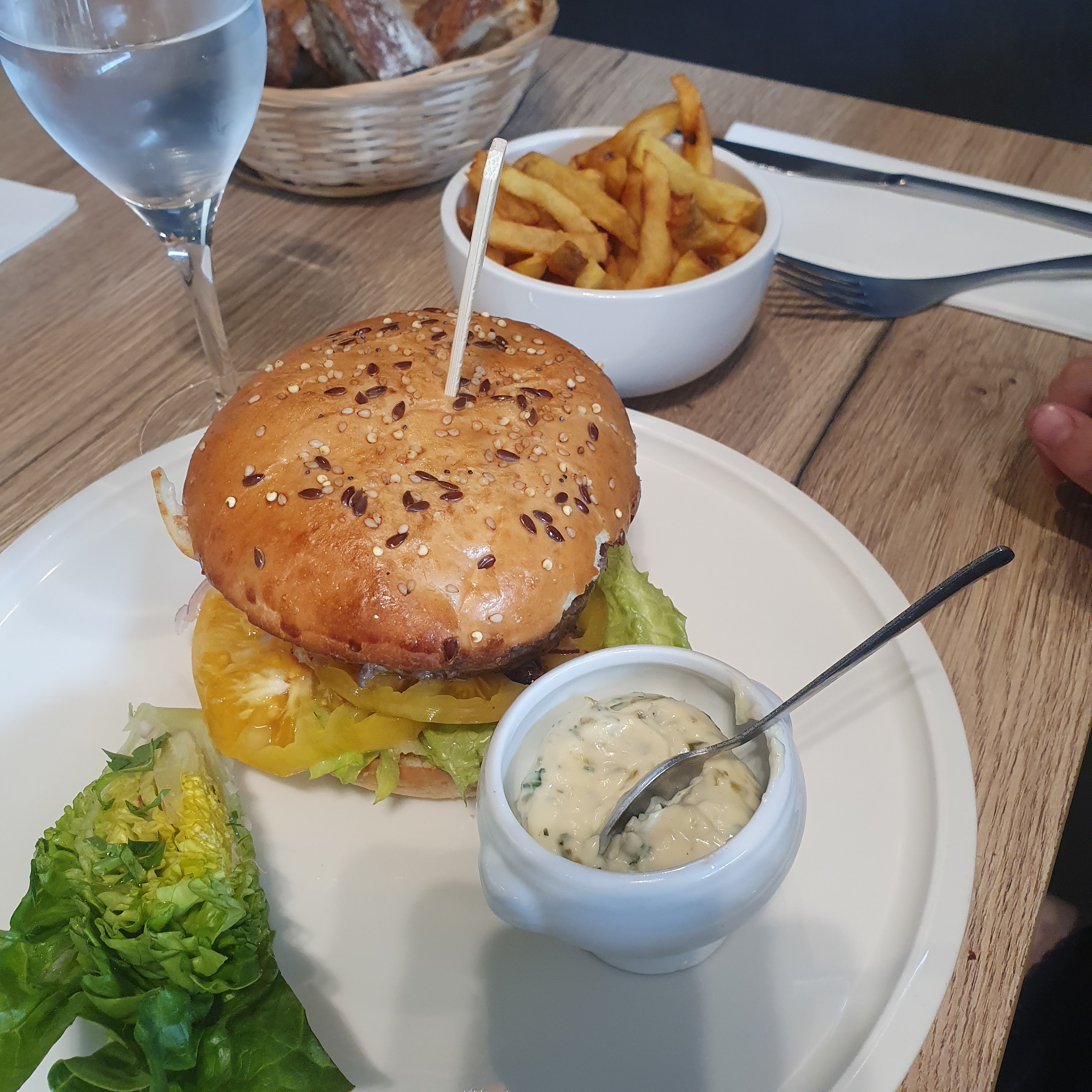 Repas en couple samedi soir. Tout d'abord l'accueil était très sympathique, nous avons eu le choix de la table. Nous nous sommes installés à une table haute avec banquette et chaise très confortable. Notre choix n'était pourtant très judicieux puisque nous étions près des toilettes. Ce qui ne nous a pas dérangé malgré le va et vient fréquent. J'ai d'ailleurs visité le lieu (qui est souvent un bon indicateur) et franchement rien à redire, propreté irréprochable, très bon choix de la déco et des matériaux. Ensuite, côté décoration du restaurant, nous avons trouvé que le restaurant faisait très classe, imitations de miroirs avec dorures ouvragées, de lustres anciens. Ce n'est hélas pas dans nos goûts, et nous avons surtout pensé qu'une déco très classe ne collait pas avec le thème de la cuisine, qui se veut maison, locale, petit producteur, retour au source, au vrai au bon mais ça c'est très personnel et surtout hyper subjectif. En revanche, il y avait un premier bémol au niveau de la propreté, le dossier de la banquette était poussiéreux dans l'angle, il y avait même des cadavres d'insectes. En ce qui concerne la cuisine, nous avons pris un burger pour moi et une basse côte pour monsieur, avec des frites maison à la graisse de canard. Concernant le burger, cuisson bleu parfaite, le burger très bon, il n'était pas inondé par une sauce, on sentait le gout de chaque aliment. La basse côté était très tendre, cuite à la perfection, la sauce servie dans une petite coupelle était très bonne aussi. J'émets cependant un deuxième bémol concernant les frites. J'ai tout d'abord douté de leur fait maison, les frites n'étaient pas grasse certes, mais elles étaient sèches, sans le goût des pommes de terre maison pourtant je ne remets pas en question qu'elles soient vraiment faites maison. Je pense juste que le mode de cuisson est à parfaire. Le troisième bémol et de loin celui qui nous a le plus déçu c'est le café gourmand. Assez cher et même si tout est fait maison, il est loin d'être ce à quoi on s'attend dans un café gourmand. Madeleine sèche, gâteau au chocolat sec, qui seraient dignes d'un goûter entre copine mais pas d'un café gourmand dans un restaurant, heureusement une crème brulée à la framboise et un cookie excellent ont relevé le niveau. En conclusion, nous reviendrons sûrement plus tard pour voir si ces quelques points se sont améliorés car nous avons été séduits par la viande et le burger.