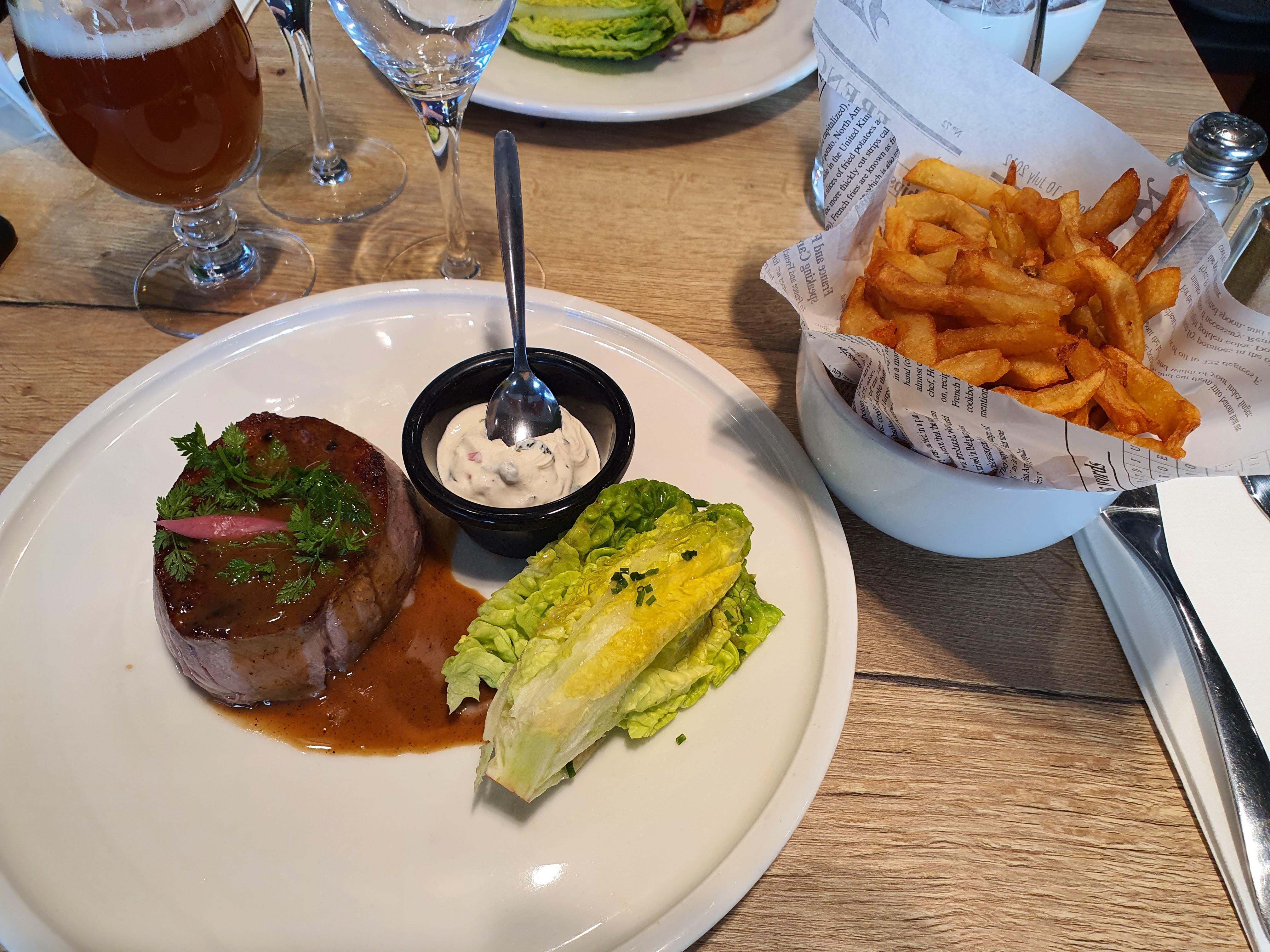 Le cadre est agréable et cosy. Le personnel est gentil et aimable. Les Entrées de qualité mais le tournedos décevant car un peu trop ferme, quand aux frites cuites à la graisse de canard trop sèches et la majorité étaient brisées. Ensemble moyen perfectible.