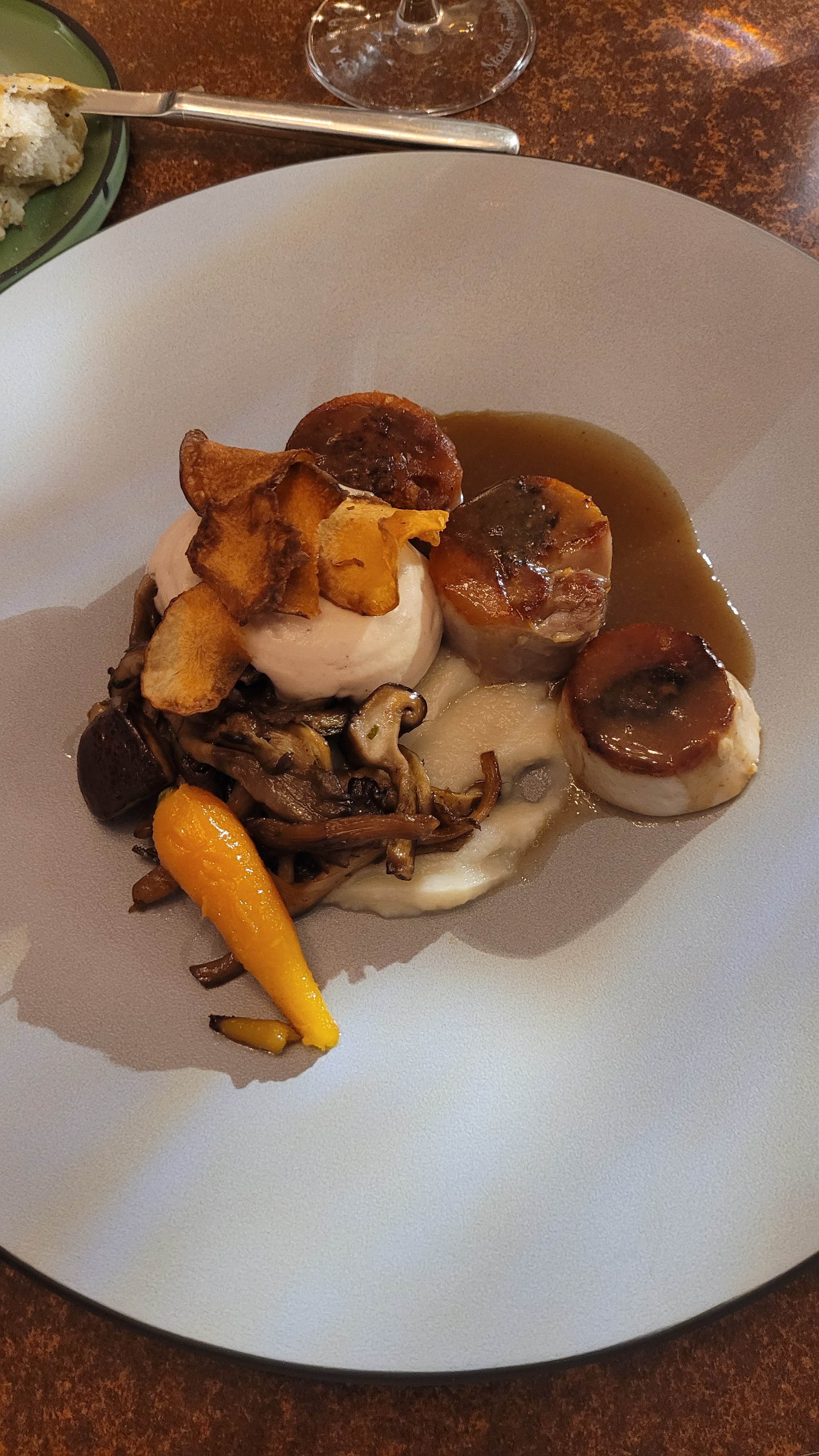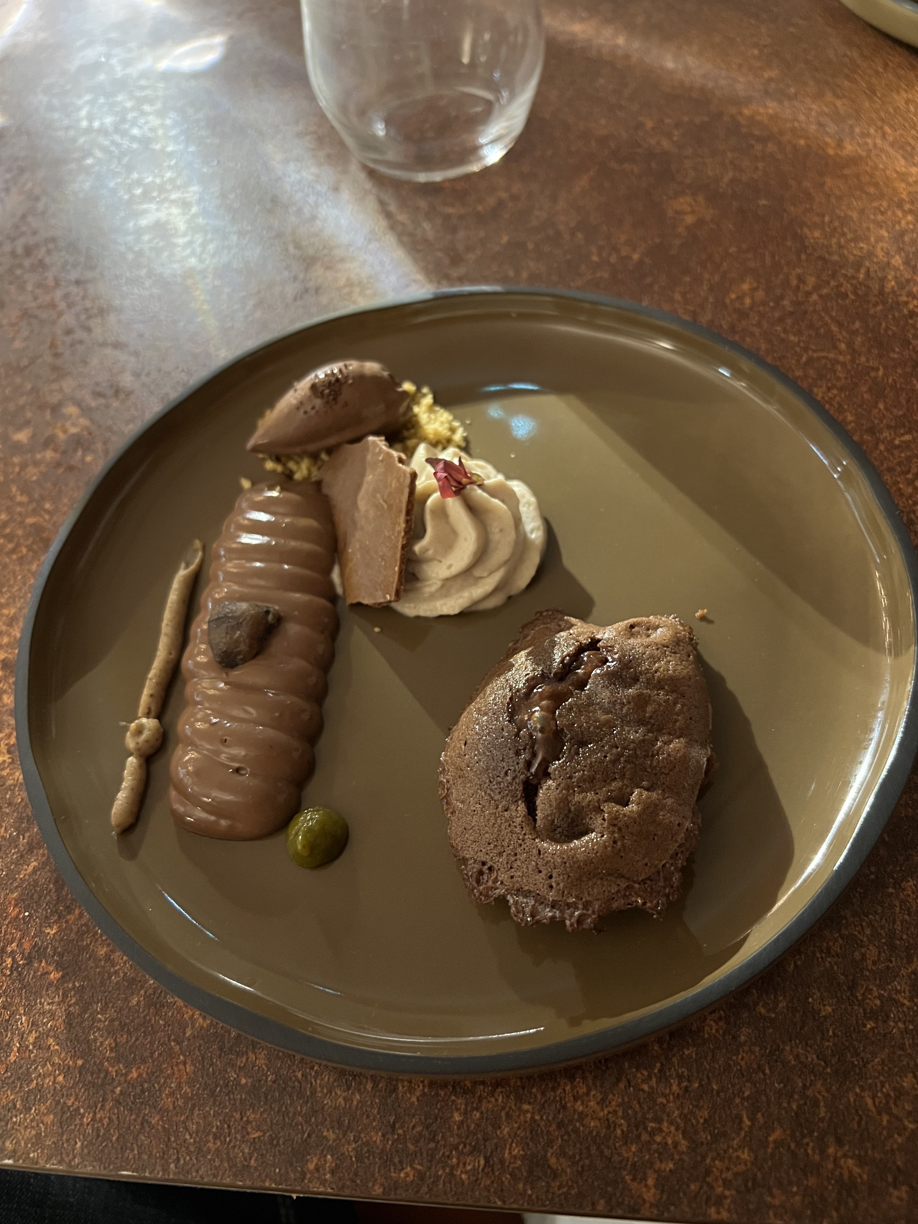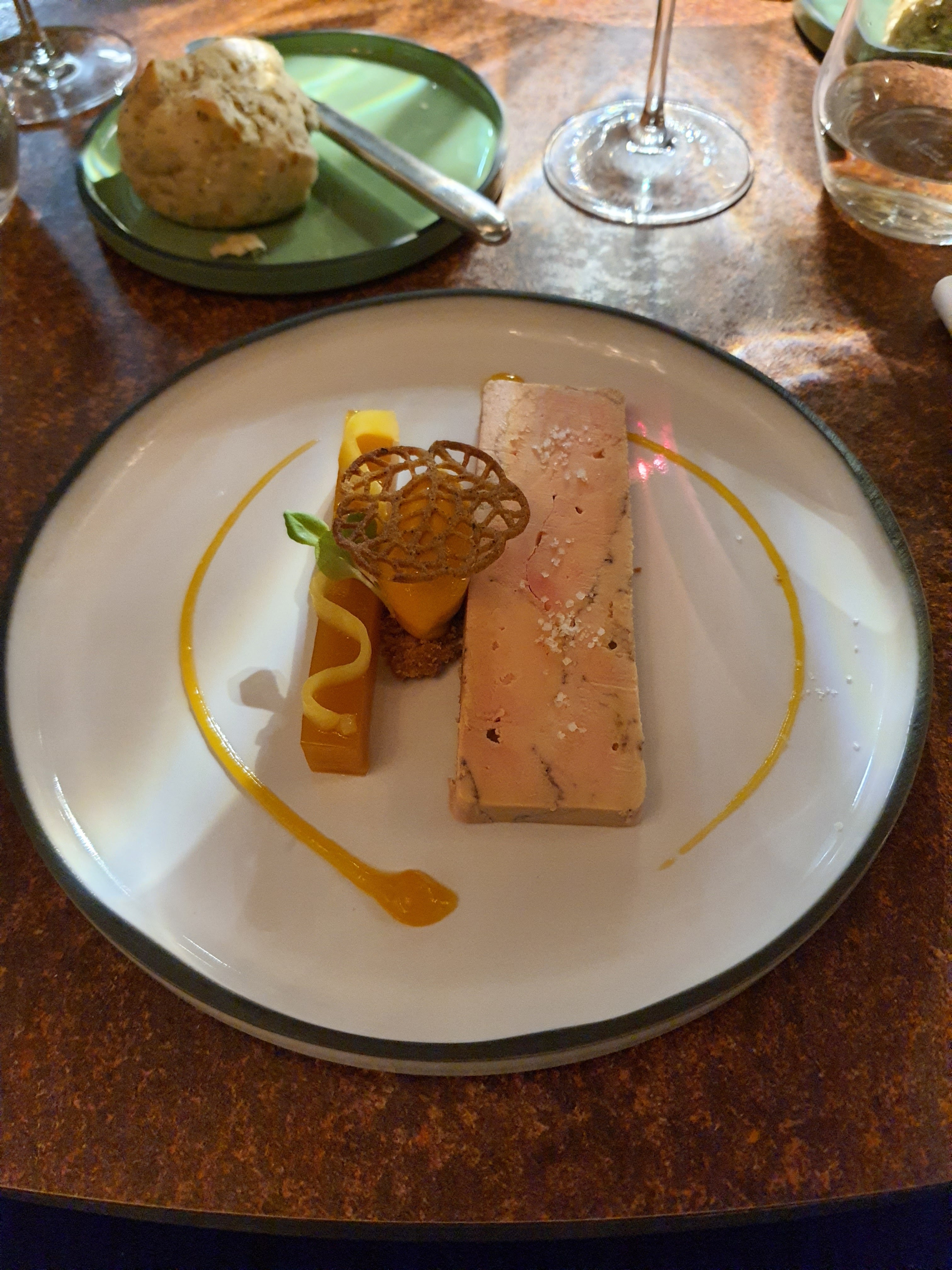 Parfait, chaleureux, fin, splendide. Pain tiède savoureux. Foie gras mi cuit et déclinaison autour de la figue parfait avec un blanc moelleux. Musique jazzy très légère. Le cèpe décliné de façon subtile comme je ne l'ai jamais vue.😀 L'omble chevalier est juste parfait. Doux avec une point d'amertume juste pour rehausser le plaisir. Le pré dessert mangue wasabi mélange saveur et textures. En désert, de la figue , du pain d'épices... un vrai bonheur. Une fin en beauté avec une très belle assiette autour du chocolat sous différentes formes, textures, températures 👍👍👍