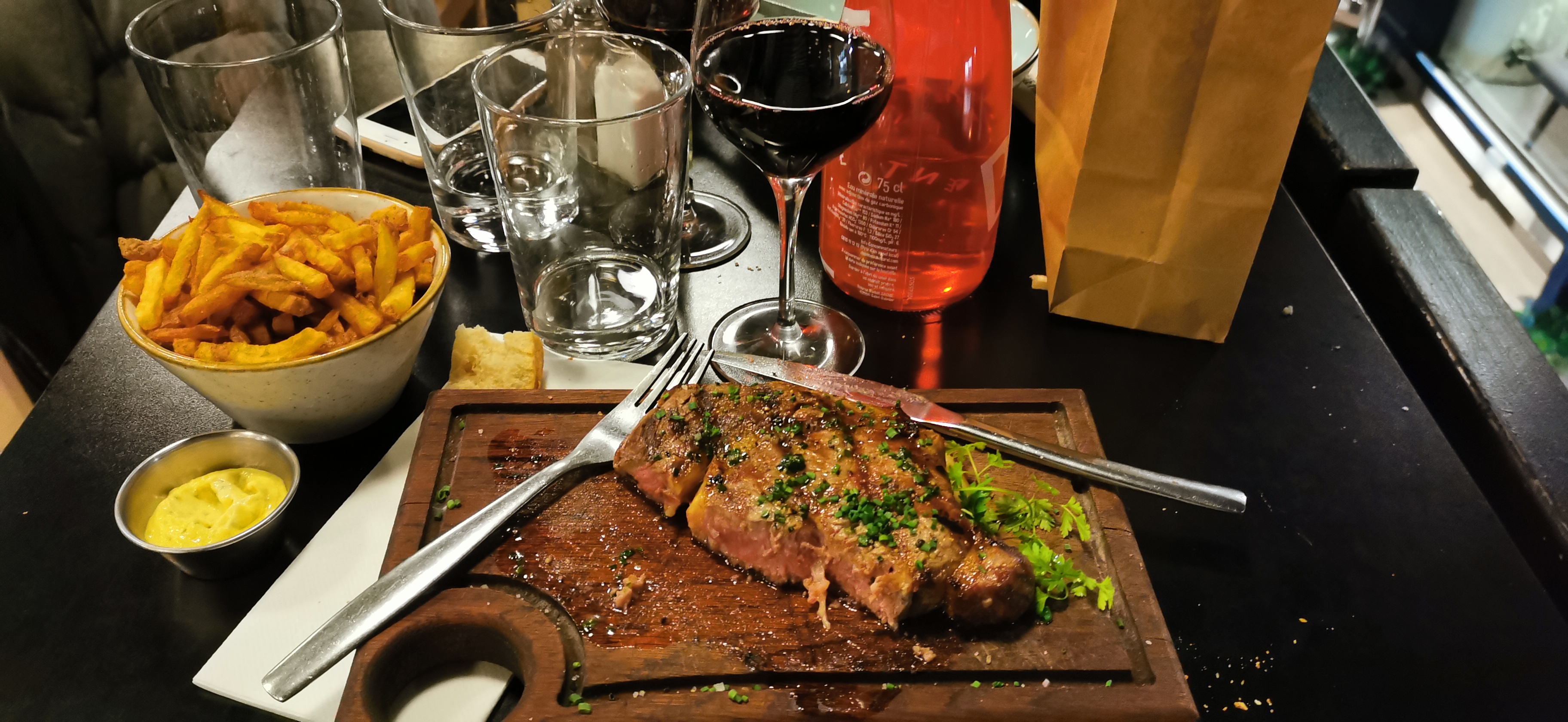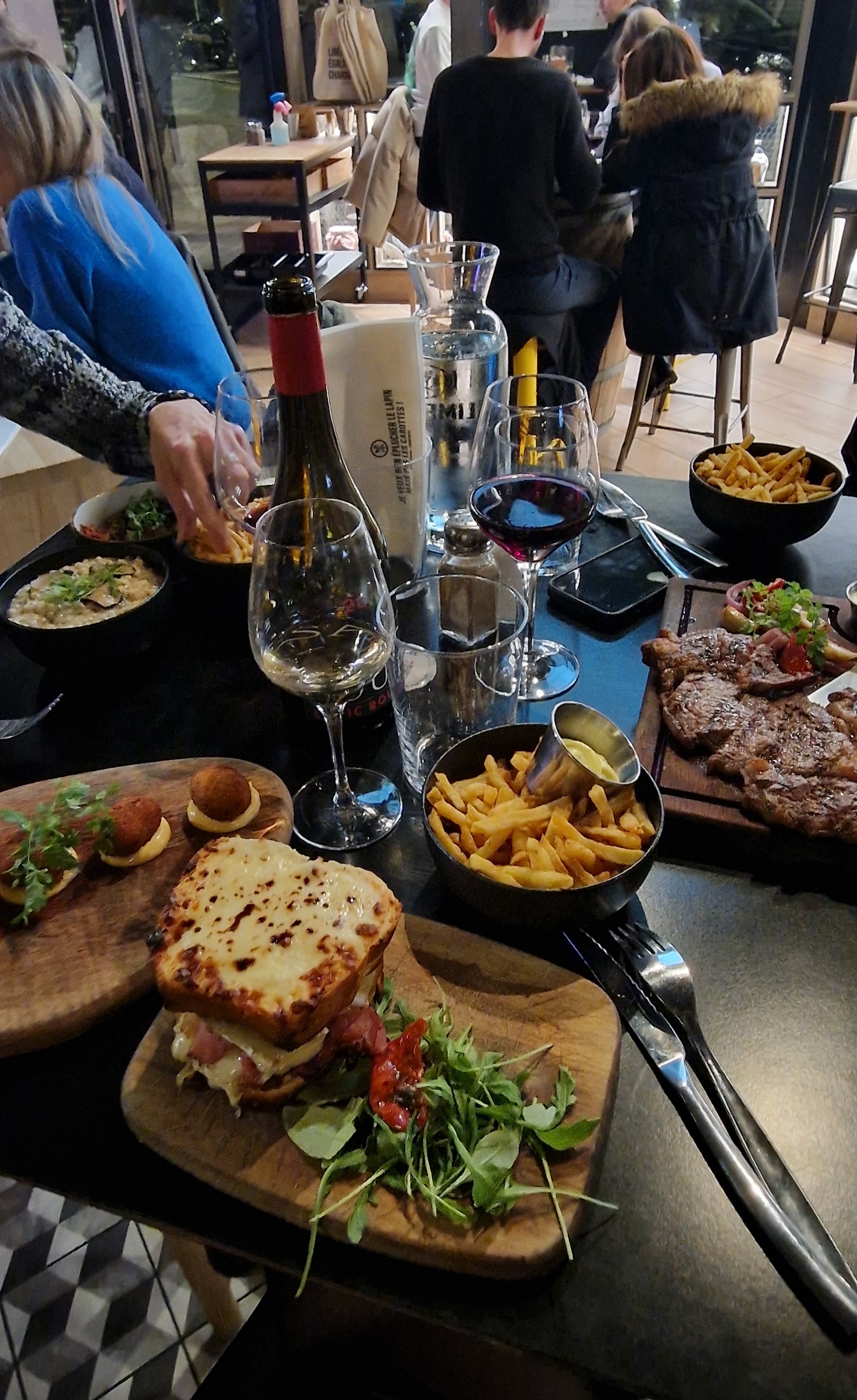 Endroit branché et donc blindé 😀 et très bruyant. Arrivés à 22h nous avons eu la chance d'avoir une table rapidement Large choix en vin mais pas tous dispos au moment de passer commande. Viande très bonne (bœuf et magret)et parfaitement cuite attention l'accompagnement est en supplément .